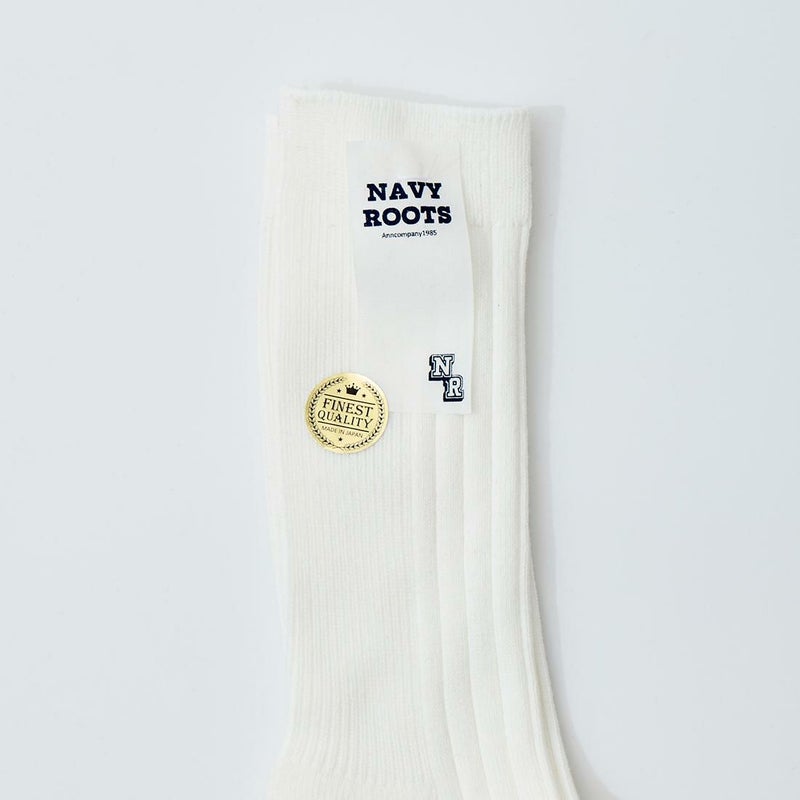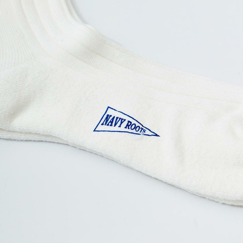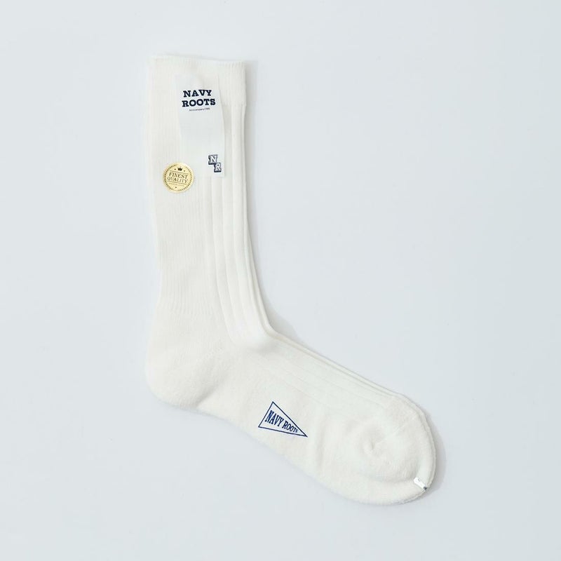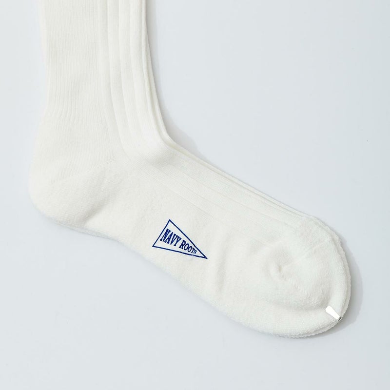 NAVY ROOTS(ネイビールーツ)のPILE COLOR RIB SOCKS。国内でも希少な ''本当のリブ'' を編めるパイル機を使用して作られたリブパイルソックス。前方は6×2リブ編み、後方は1×1リブ編みの通常のリブソックスにはないデザイン。希少な編み機を使用し、長年培った経験と熟練の職人技による完成度の高いソックス。