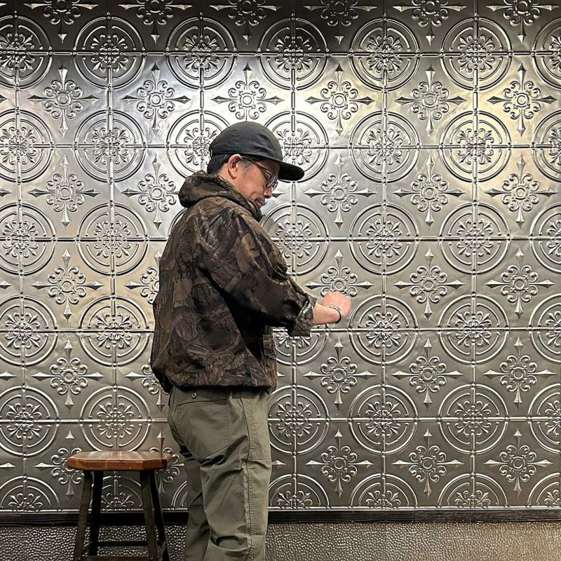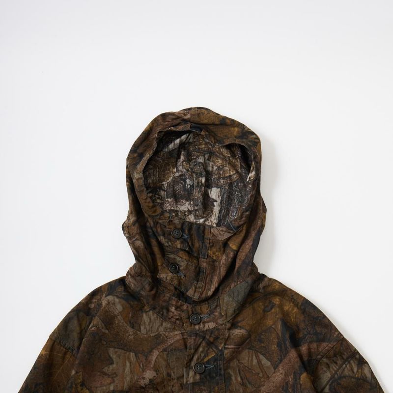 POST OVERALLS (ポストオーバーオールズ) のTOWN&COUNTRY PARKA FOREST CAMO。1990年代後半の名作の一つであるタウン&カントリーという半袖シャツがデザインソースのアノラックパーカ。プルオーバーの前立てや腰上の3つのフラップ付きパッチポケットが特徴的。裾にはドローコードが入っておりシルエットアレンジして楽しむ事が可能。素材は落ち着いた色合いのカモフラージュのコットン素材。アウター、インナーとしても活躍してくれる1着。