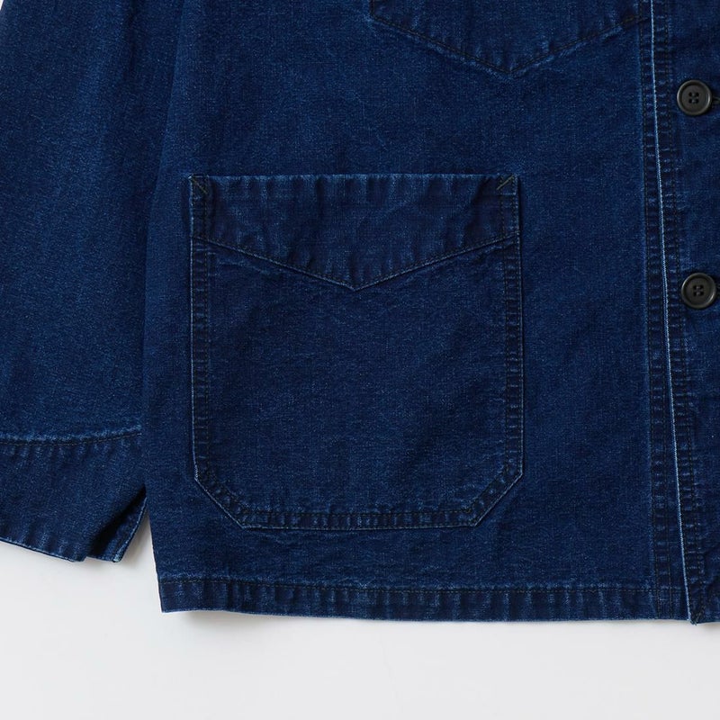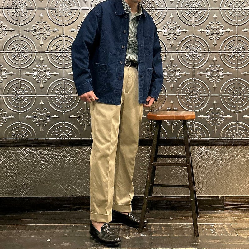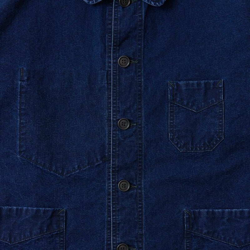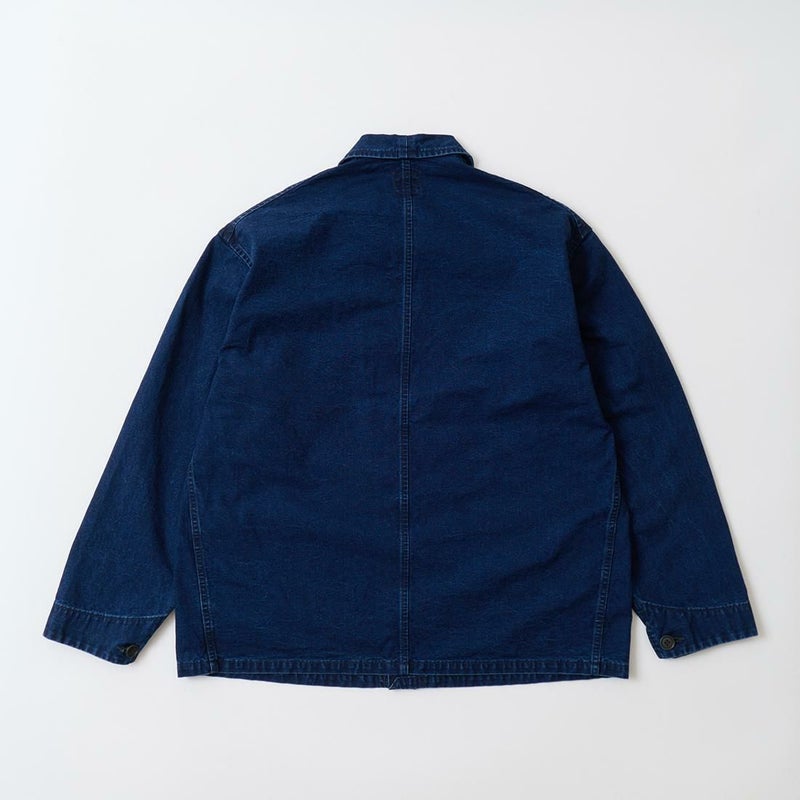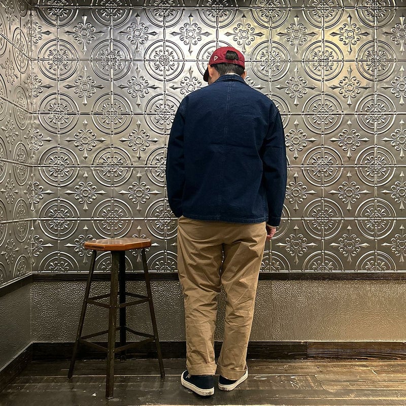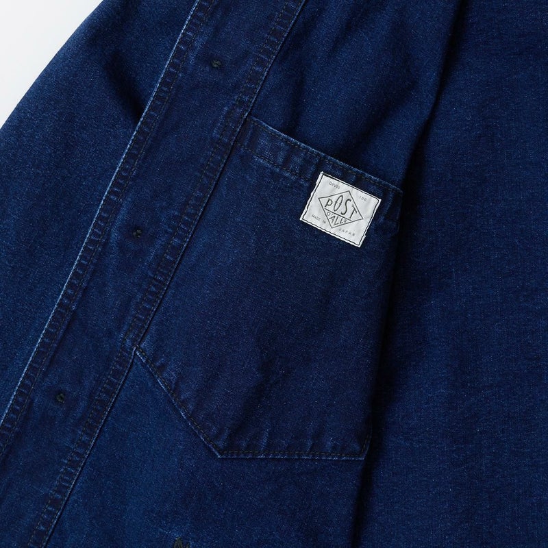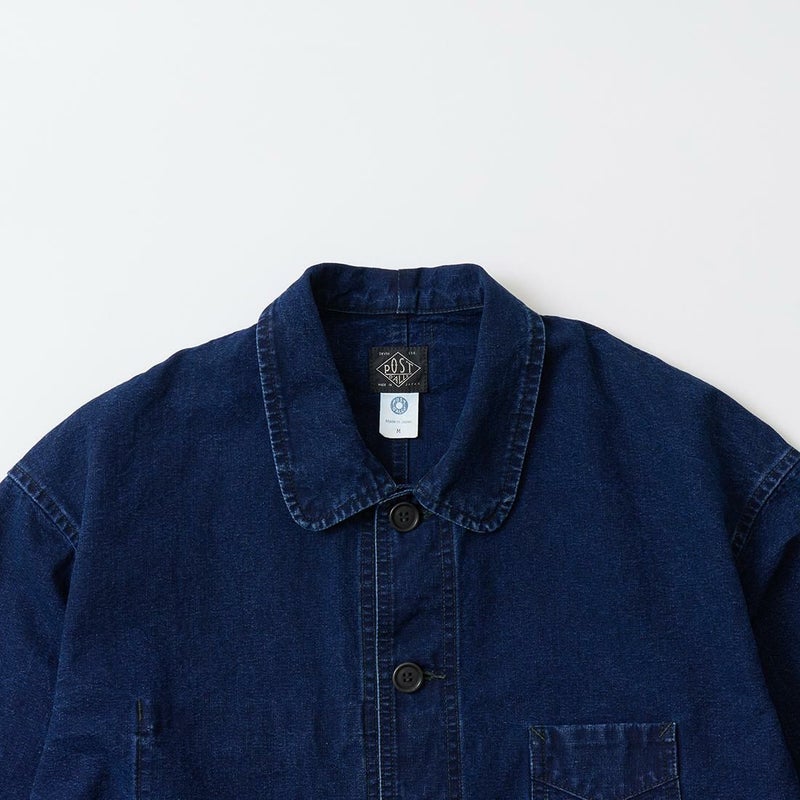 POST OVERALLS (ポストオーバーオールズ) のPOST CHINOIS TRAVAIL 2 VINTAGE INDIGO CANVAS。ウォッシュ加工が施されたコットンキャンバス生地を使用したポストシノワトラベール。ビンテージのフレンチワークジャケットとフレンチチャイナのワークジャケットのティテールを取り入れたカバーオール。ラウンドカラー、低めの第一ボタンが特徴的。3つのパッチポケットが配置されたシンプルなデザイン。インディゴ染めのコットンキャンバス生地の経年変化も楽しみ。3シーズン活躍してくれる1着。