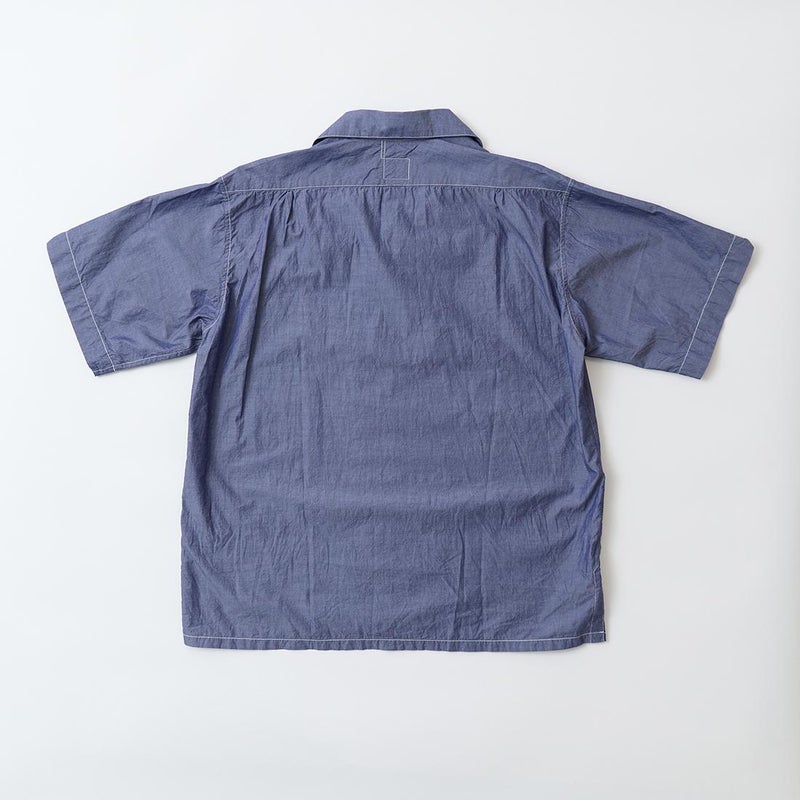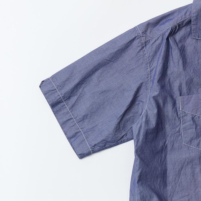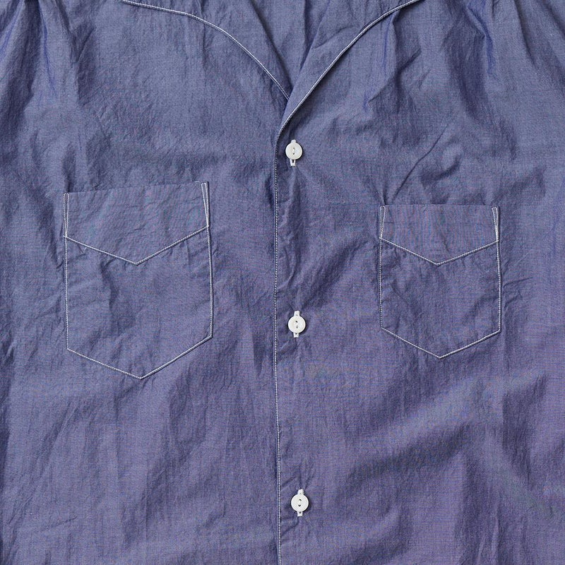 POST OVERALLS (ポストオーバーオールズ) のFEVER 2 S/S HIGH COUNT BROADCLOTH。薄手でサラッとした肌さわりのブロード素材を使用したイタリアンカラーの半袖シャツ。ふんわりとしたロールが柔らかな印象を与えるイタリアンカラー。左胸にポケット1つ。前立てはスッキリとしたフレンチフロント仕様。裾はストレートカット。ゆったりとしたシルエットが夏らしい1着。