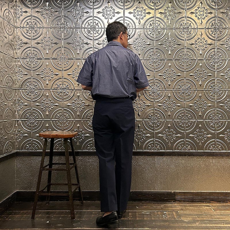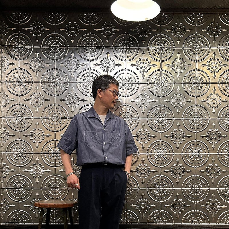 170センチ65キロで「M」サイズでゆったりとした着用感。襟型が特徴的な雰囲気の良い半袖シャツ。暑い時期でも快適に着れる薄くてサラッとした品のある生地を使用。サイズバランスで考えると太めのパンツ、ショーツで合わせたくなりますね。単体使いはもちろんのこと、ジャケットのインナー使いで合わせた時の雰囲気も様になる1着。万人受けとはいえないですが、こういうシャツ探していたという方は是非!