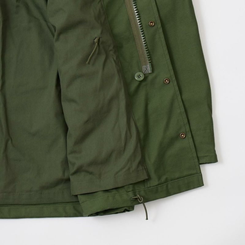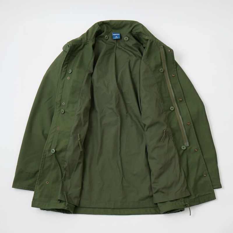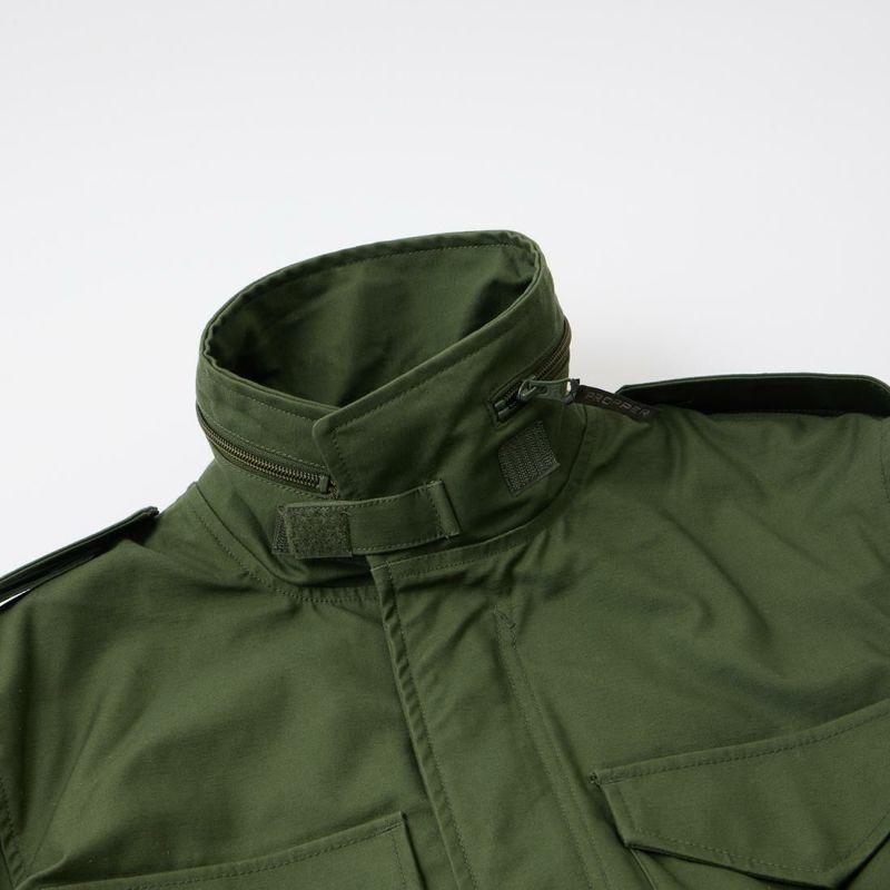 PROPPER(プロッパー)のM65 FIELD COAT W/LINER REGULAR LENGTH。アメリカ軍のM65フィールドジャケットがデザインソースのアウター。キルティング仕上げの取り外しの可能なライナーを装備。ライイニングあり、なし、ライニングのみでスタイリング可能。襟にはフードが収納されており、首元には風の侵入を防いでくれるチンストラップを装備。肩にはエポレット、袖口にはマジックテープで調節可能なアジャスターも装備。生地にはDWR加工が施されており耐久、撥水性抜群。デザインだけではなく、ミリタリーアウターらしい機能性も高い1着です。