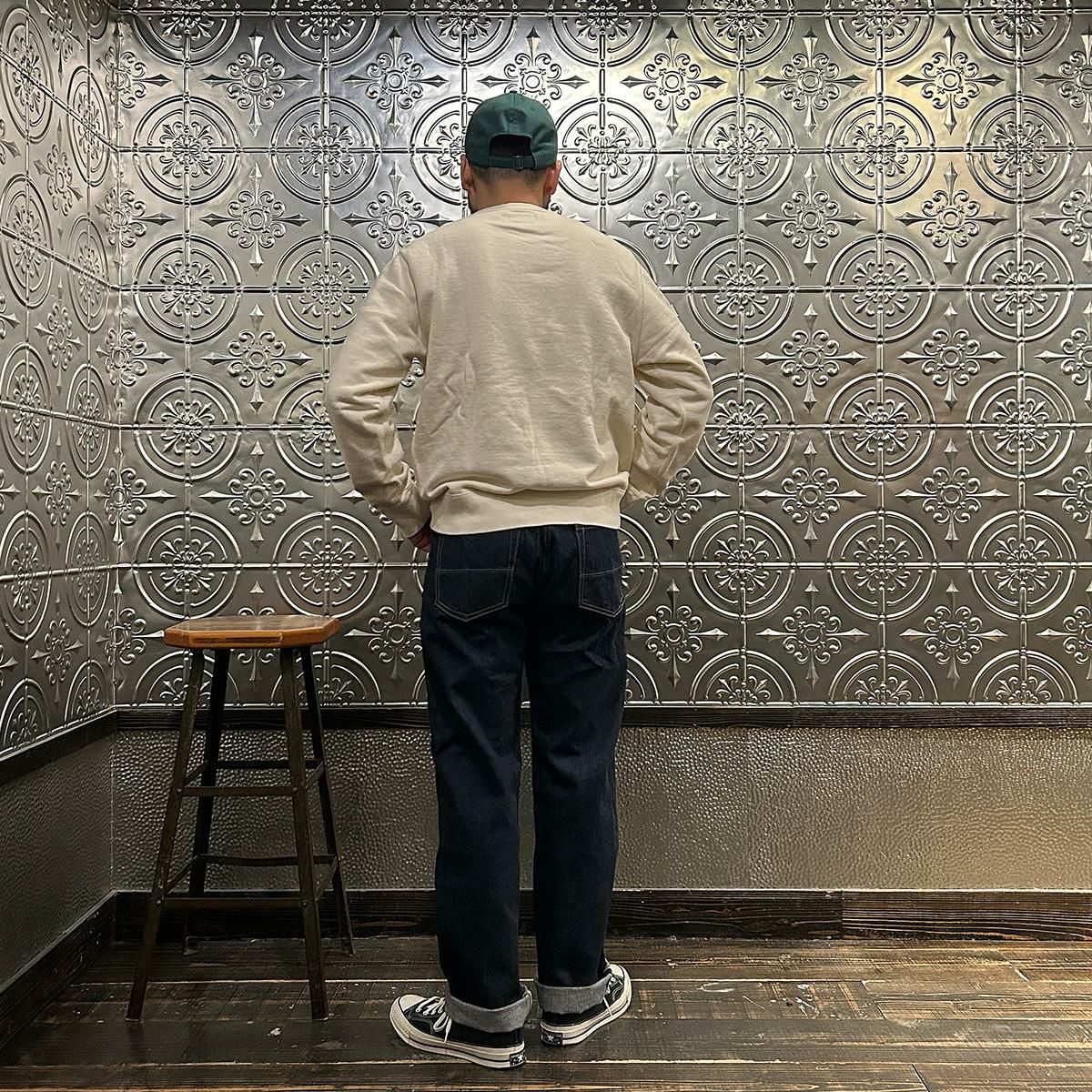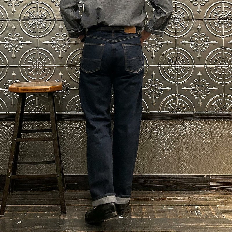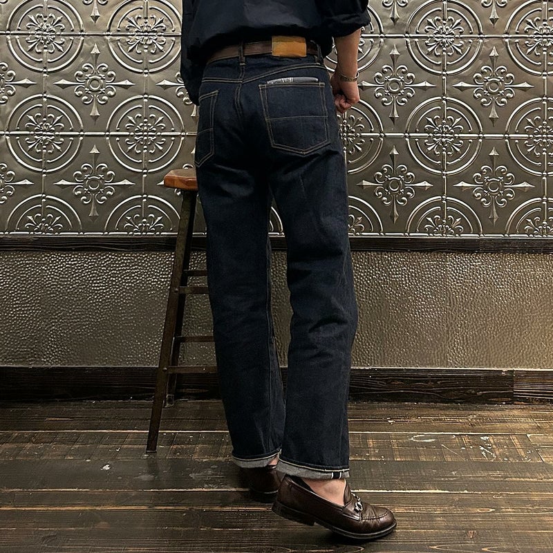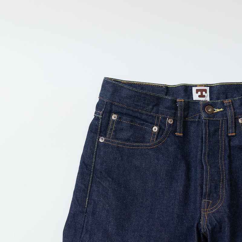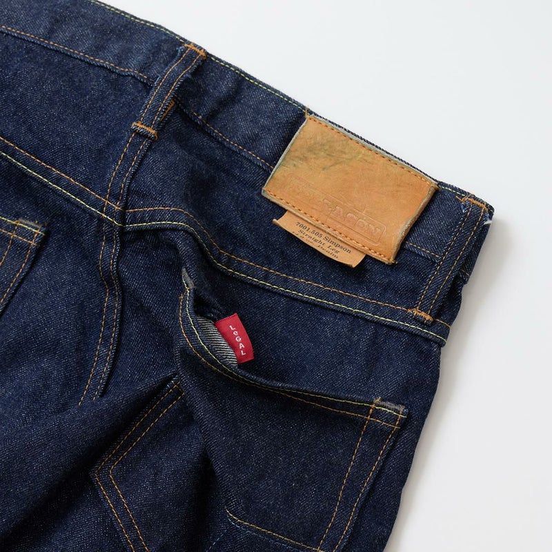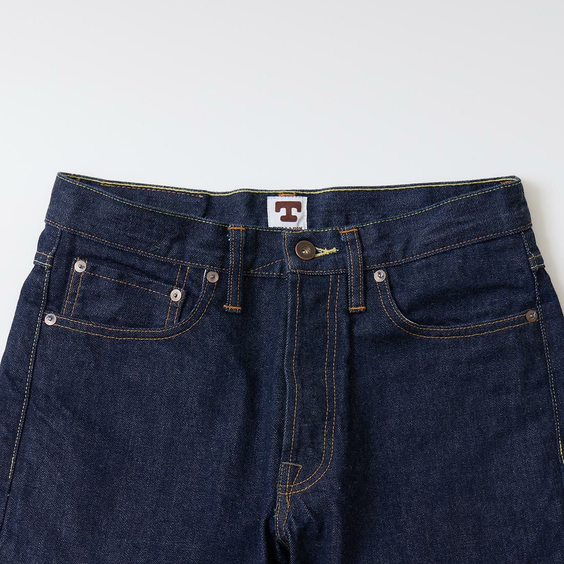 2008年創業アメリカのサンフランシスコに拠点をおくTELLASON(テラソン)の日本代理店別注モデル「SIMPSON シンプソン」。日本のカイハラ社の14オンスのミミ付きデニムをサンフランシスコの自社工場で縫製。レザーパッチはポートランドのTANNER GOODS(タナーグッズ)、リベットもケンタッキー州のメーカーによるアンティークカッパーを使用。アメリカでモノ作りをする事に拘りを持つブランドが手掛ける至極のデニムパンツ。程よい凹凸感とドライタッチ、ムラのあるヴィンテージライクな色味。穿きこむ事で更に楽しめるヴィンテージさながらの表情を持つセルヴィッチデニム。