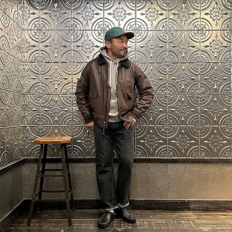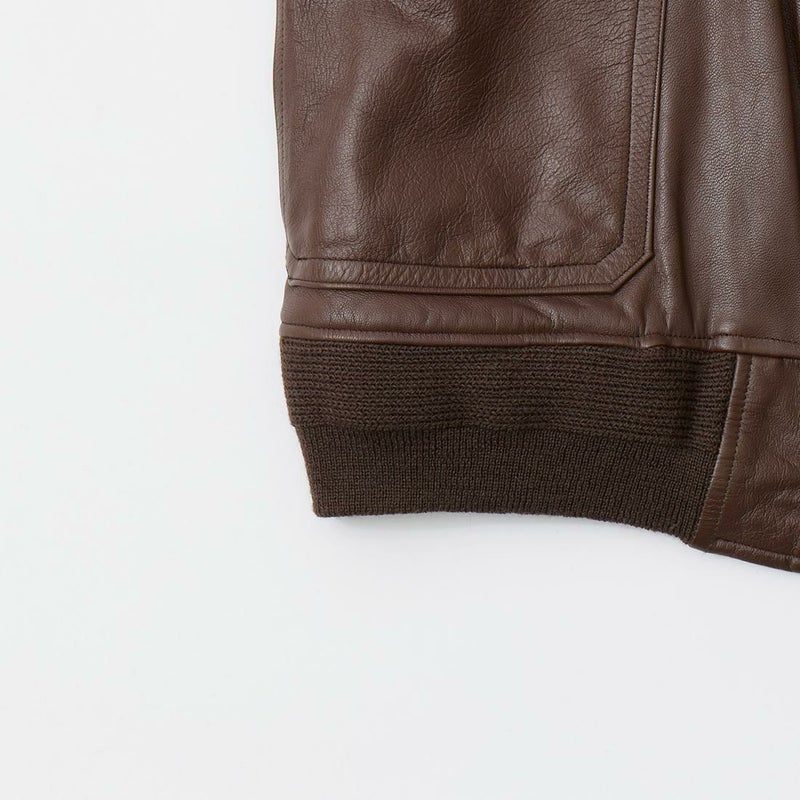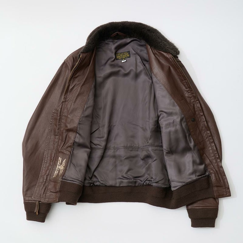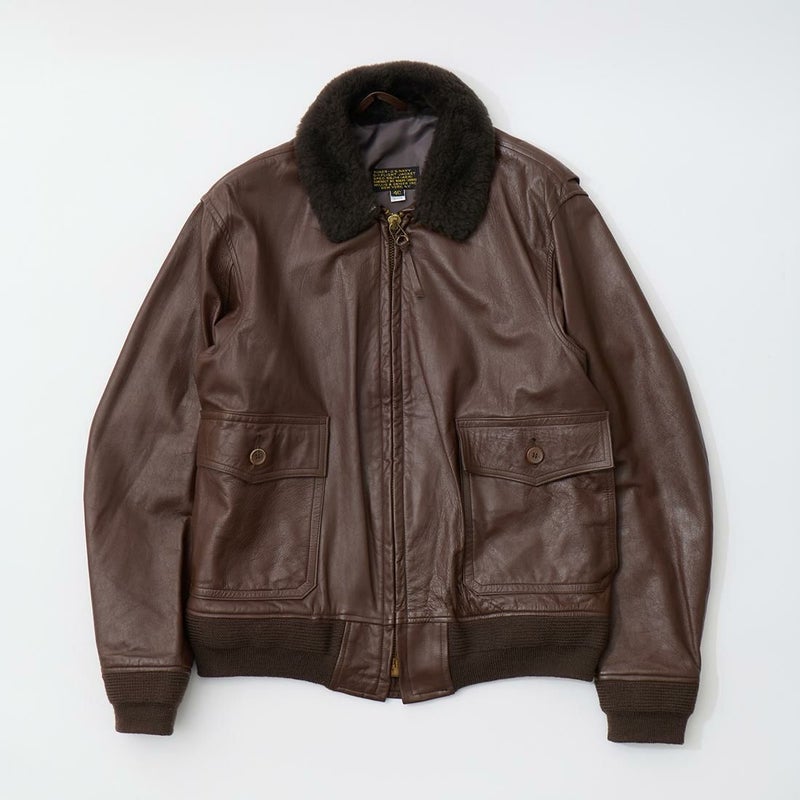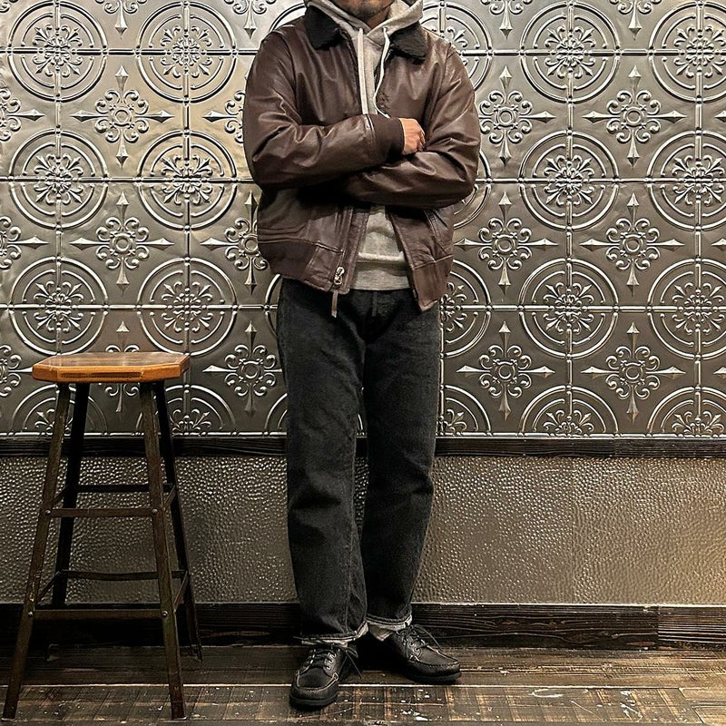 大戦時の革飛行服納入メーカーとして知られたWIILIS&GEIGER(ウィリスアンドガイガー)のG-1 LEATHER JACKET。海軍航空隊に1951年から採用されたG-1。摂氏-10~10度のインターミディエイトゾーンのフライトジャケット。ボア付きの襟。襟裏にはチンストラップ。前立てはジップフロント。両脇下には通気性を確保するためのツインアイレット。背面には機動性を高めるアクションプリーツ。腰上の左右にフラップポケットを装備。