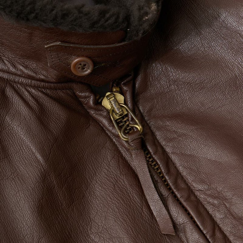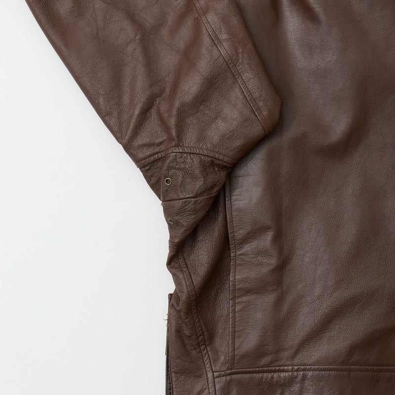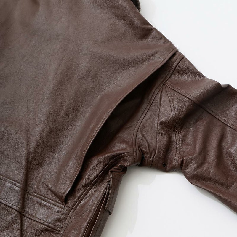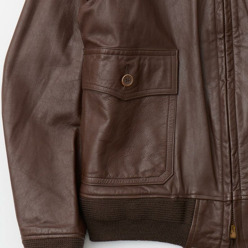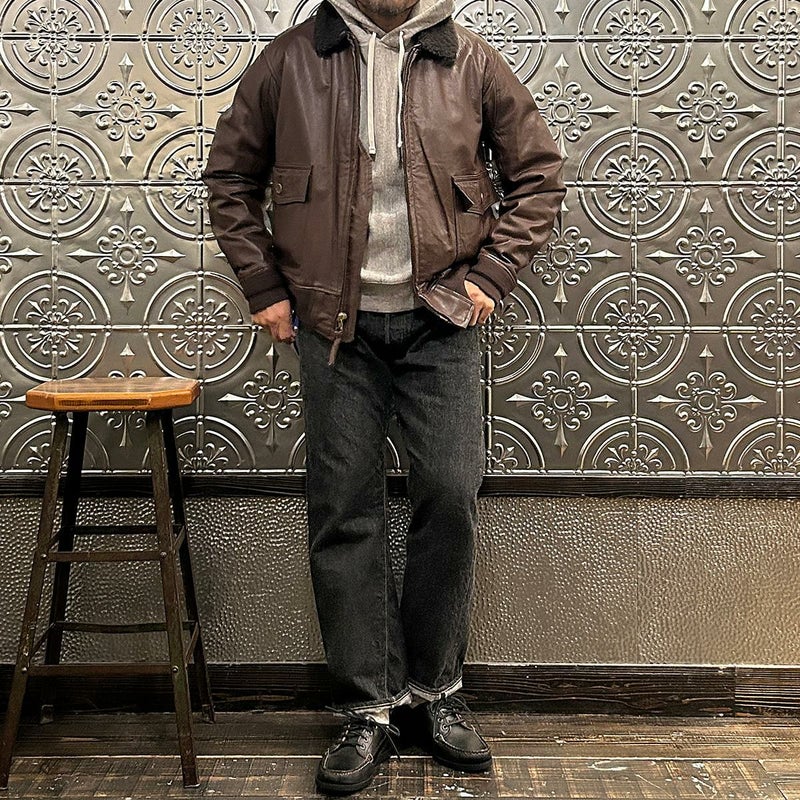 大戦時の革飛行服納入メーカーとして知られたWIILIS&GEIGER(ウィリスアンドガイガー)のG-1 LEATHER JACKET。海軍航空隊に1951年から採用されたG-1。摂氏-10~10度のインターミディエイトゾーンのフライトジャケット。ボア付きの襟。襟裏にはチンストラップ。前立てはジップフロント。両脇下には通気性を確保するためのツインアイレット。背面には機動性を高めるアクションプリーツ。腰上の左右にフラップポケットを装備。