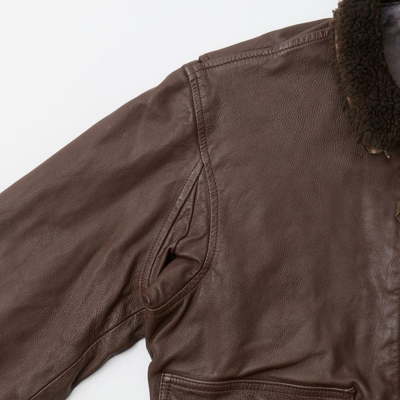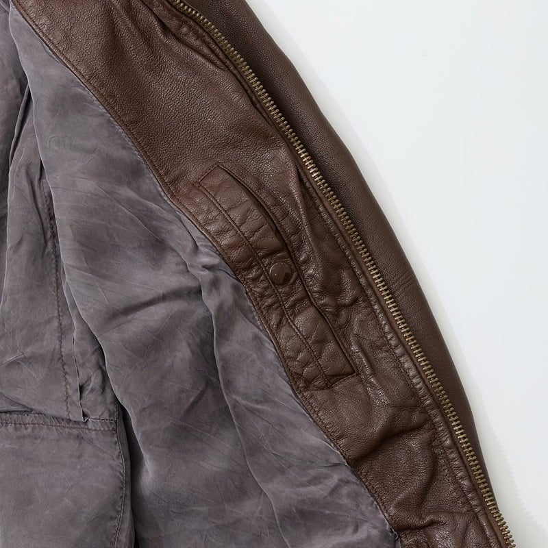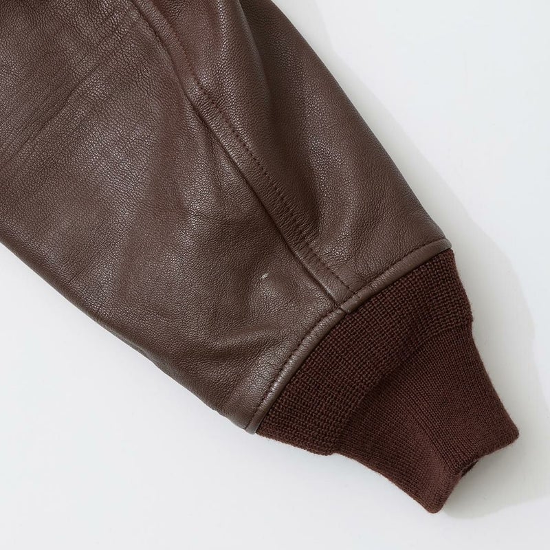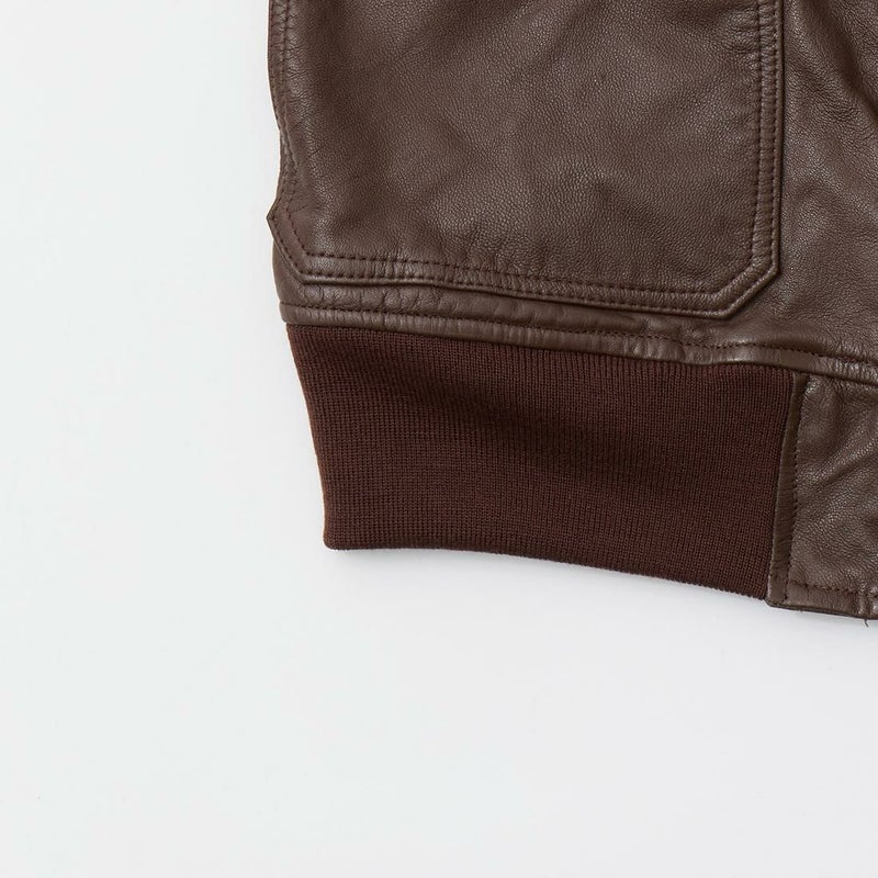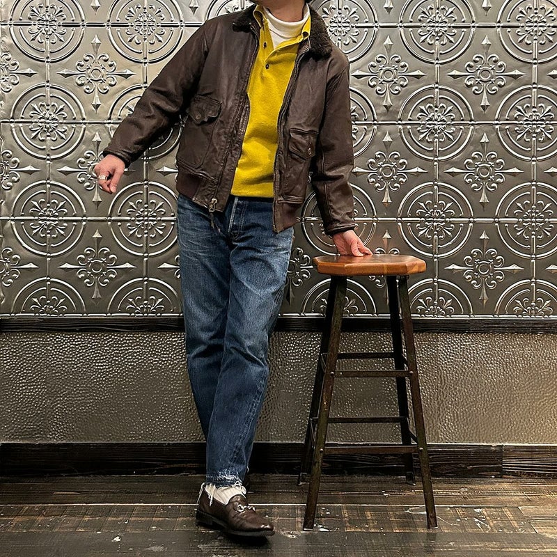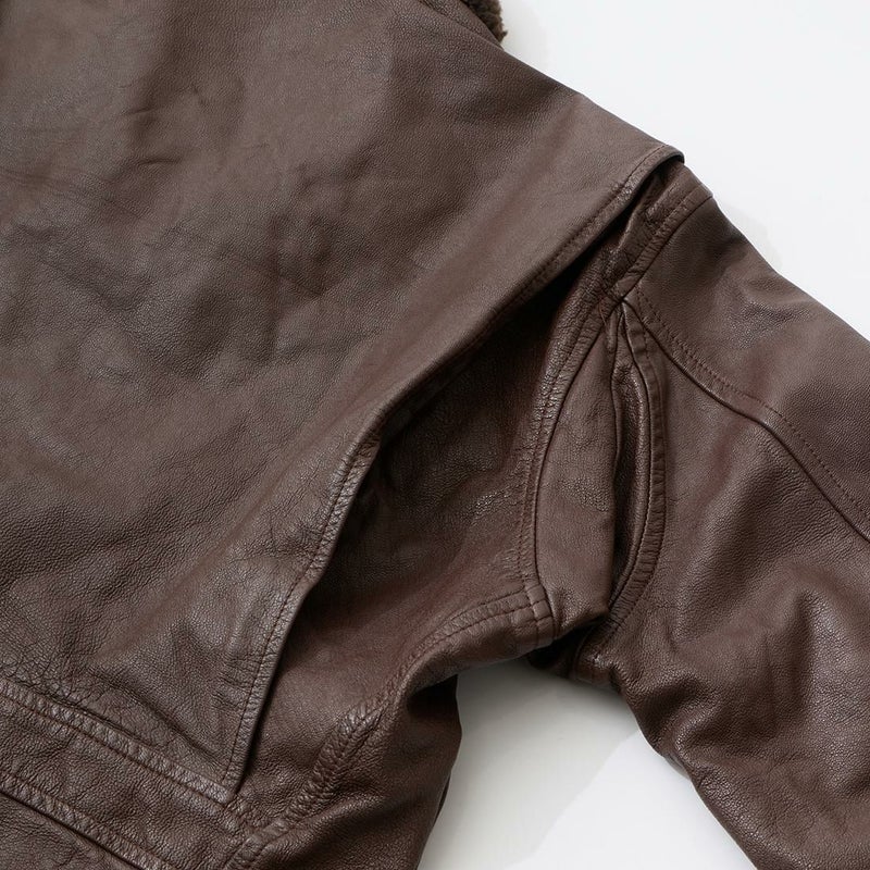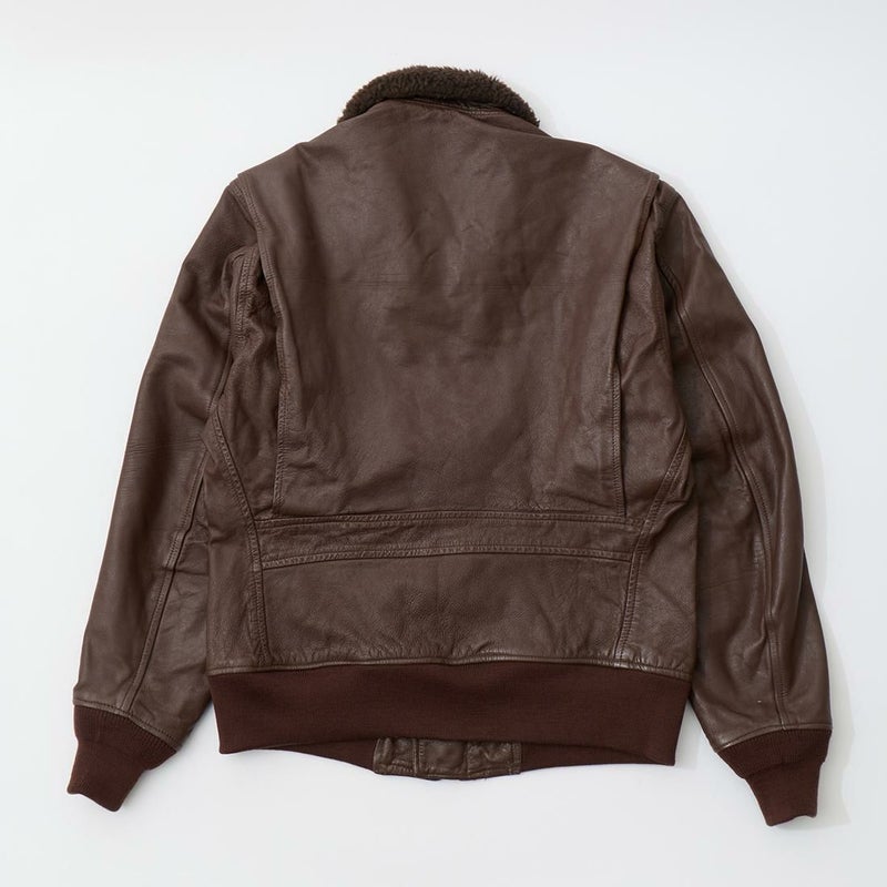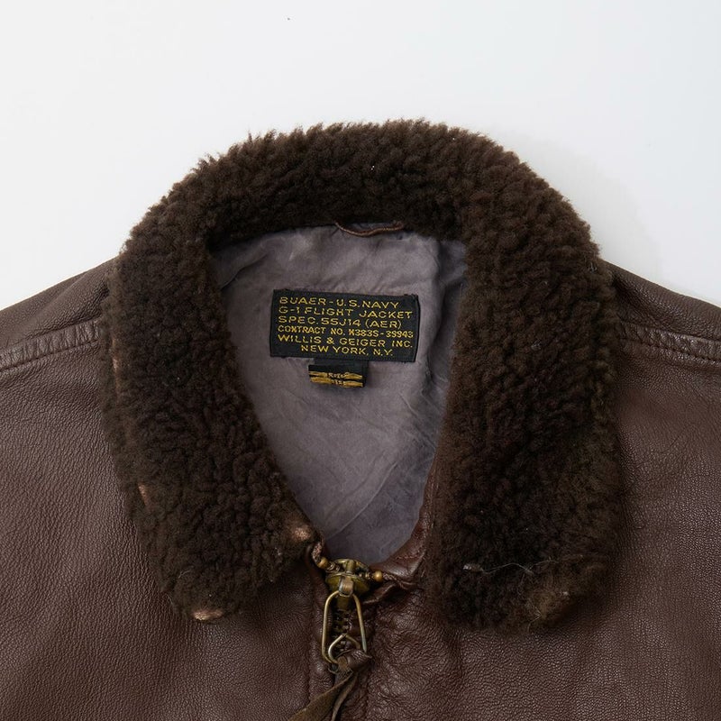 大戦時の革飛行服納入メーカーとして知られたWIILIS&GEIGER(ウィリスアンドガイガー)のG-1 LEATHER JACKET。海軍航空隊に1951年から採用されたG-1。摂氏-10~10度のインターミディエイトゾーンのフライトジャケット。ボア付きの襟。襟裏にはチンストラップ。前立てはジップフロント。両脇下には通気性を確保するためのツインアイレット。背面には機動性を高めるアクションプリーツ。腰上の左右にフラップポケットを装備。