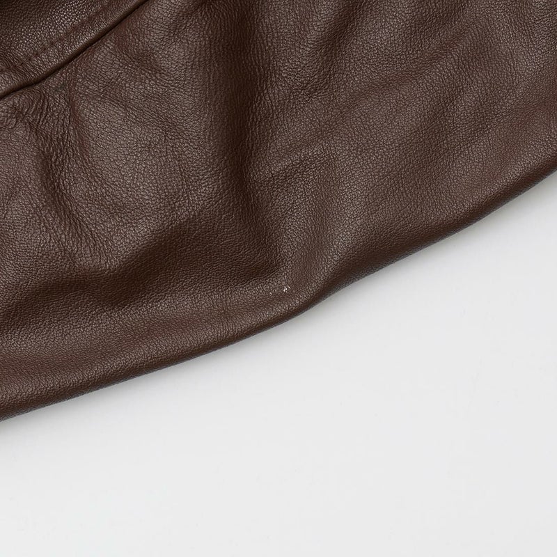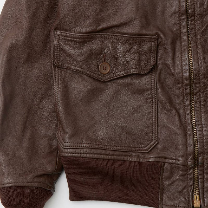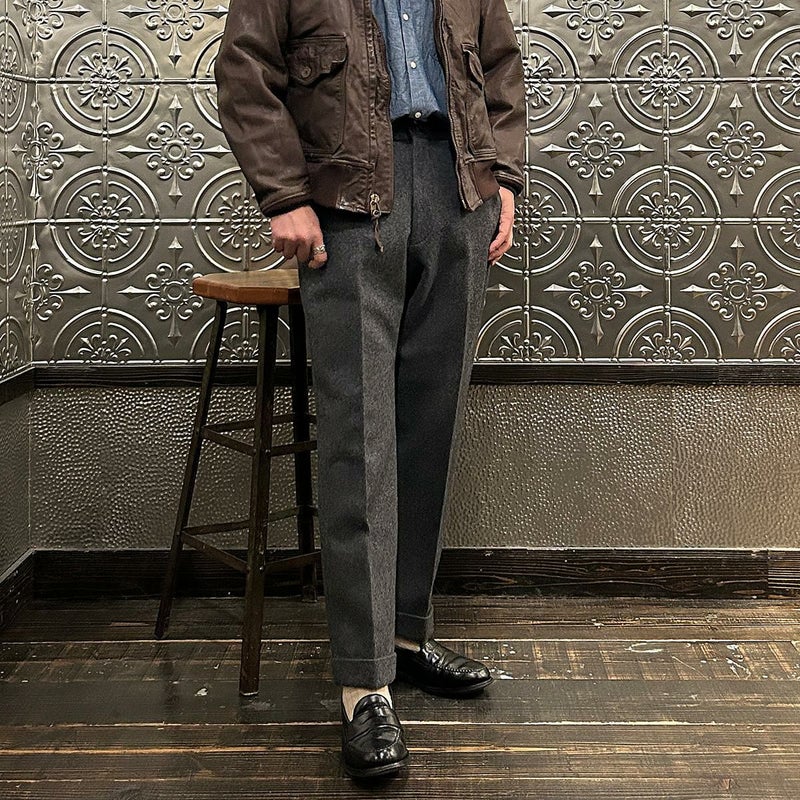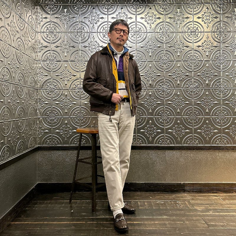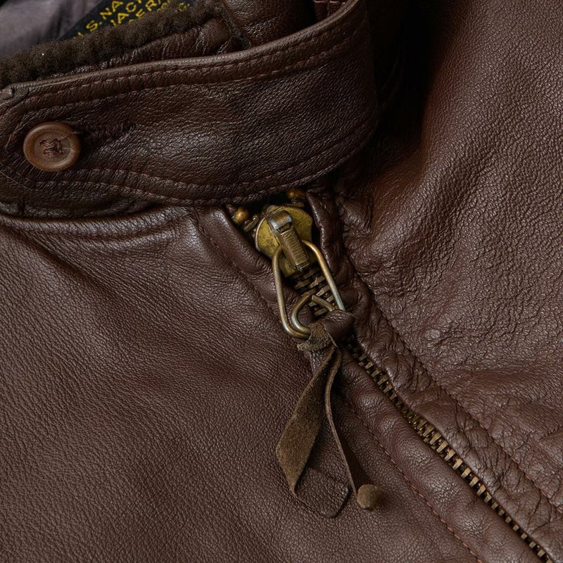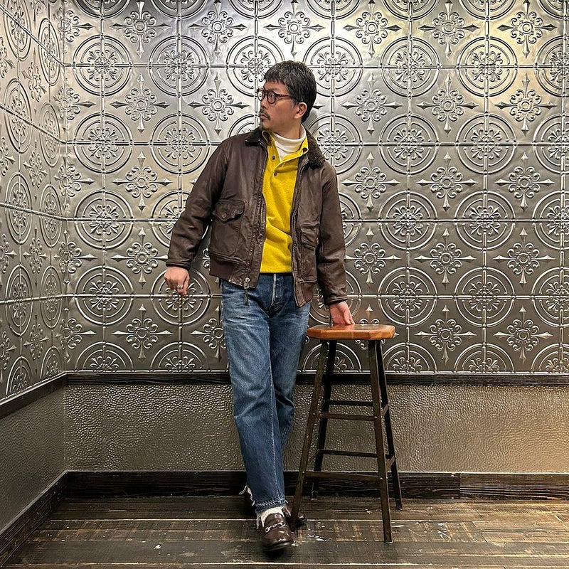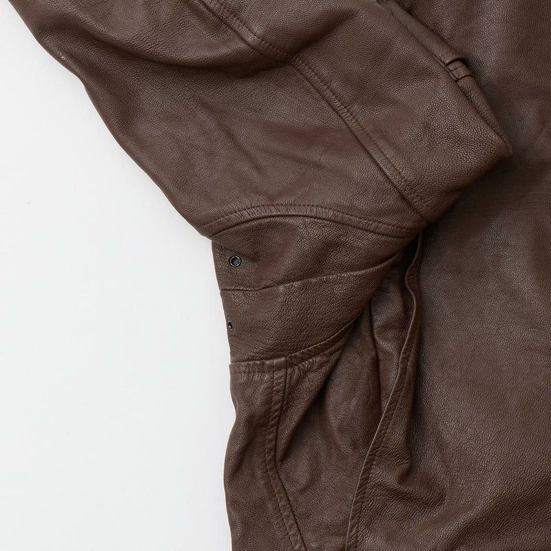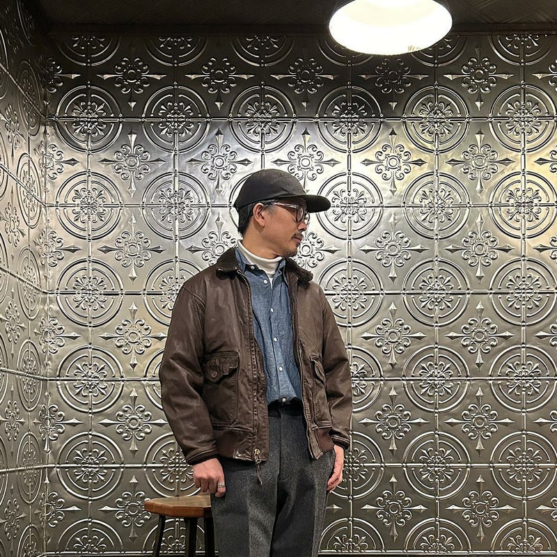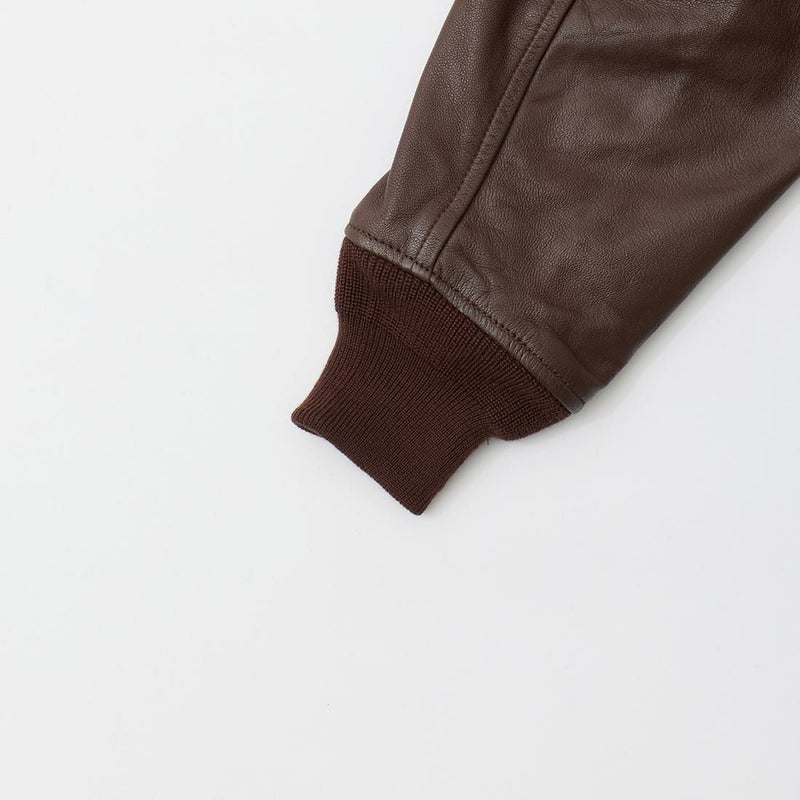 大戦時の革飛行服納入メーカーとして知られたWIILIS&GEIGER(ウィリスアンドガイガー)のG-1 LEATHER JACKET。海軍航空隊に1951年から採用されたG-1。摂氏-10~10度のインターミディエイトゾーンのフライトジャケット。ボア付きの襟。襟裏にはチンストラップ。前立てはジップフロント。両脇下には通気性を確保するためのツインアイレット。背面には機動性を高めるアクションプリーツ。腰上の左右にフラップポケットを装備。