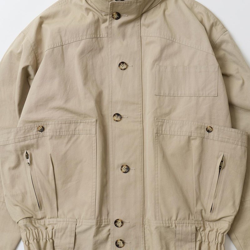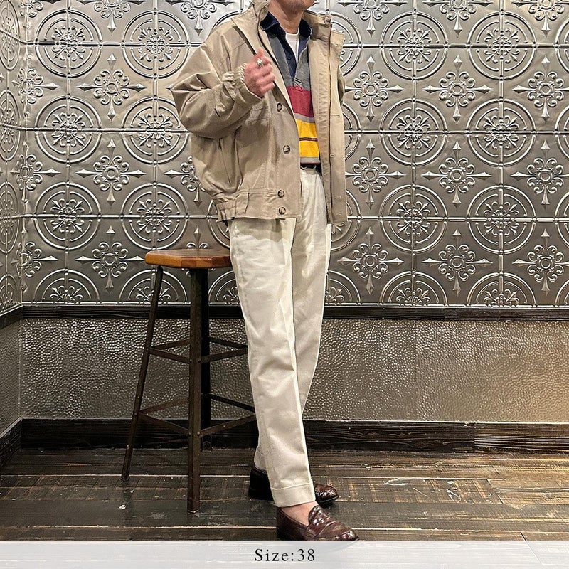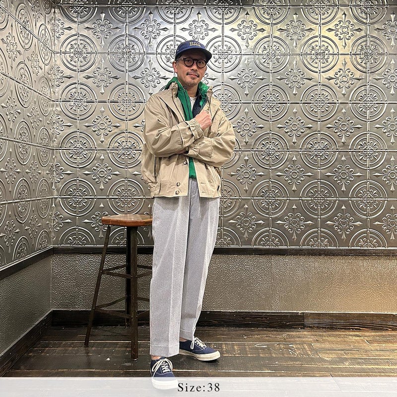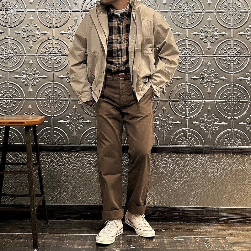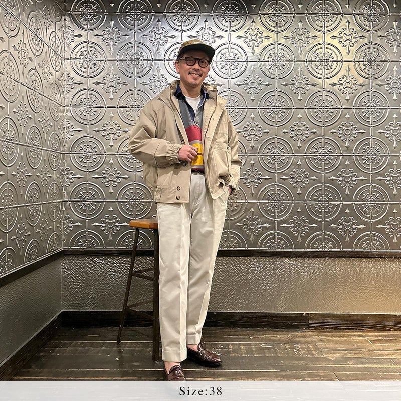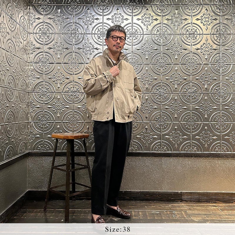 172センチ60キロです。サンプルサイズが「38」だったので着用画像では「38」を着用しております。「38」でゆとりのあるサイズ感でした。ある程度中に着こめるサイズだったのでジャストサイズで考えると「36」だと思います。お好きな方にとっては待望の復刻ではないでしょうか。ブランドが誇る屈指の名品「ハンターハイカー」。独特過ぎるデザインとディテールは他では見る事が出来ない雰囲気。この手のギアモノは四角くて肩がゴツイ雰囲気になってしまうものが多いのですが、こちらは丸みを帯びた独特のフィッティングで肩回りがストンと落ちる着易い形。とにかくディテールが凄すぎる。当時はこれをハンティングに向かう現地までの道中に着ていたという贅沢過ぎる着方。流石は富裕層達の高貴な趣味服。ポケットやディテール全てに意味があるミリタリーに通ずるデザインは設計といった方がしっくりきますね。新品でこの状態ですからね。着込んでアジが出た時のカッコ良さと言ったらヤバイでしょう。古着市場では特に私のサイズは見た事がない(探せていないだけ?)ですし、ジップは当時の金型のタロン製で生地、縫製は日本製。 ここまでのクオリティーで仕上がっていれば納得の逸品です。お好きな方もそうでない方も是非お試しください。アンチ復刻な方にも是非ご覧頂きたいですね。 古着の市場でデッドストックで入手する事も難しいでしょうし、 ハンターハイカーの新品が手に入る事なんて今後はないでしょうからね。
