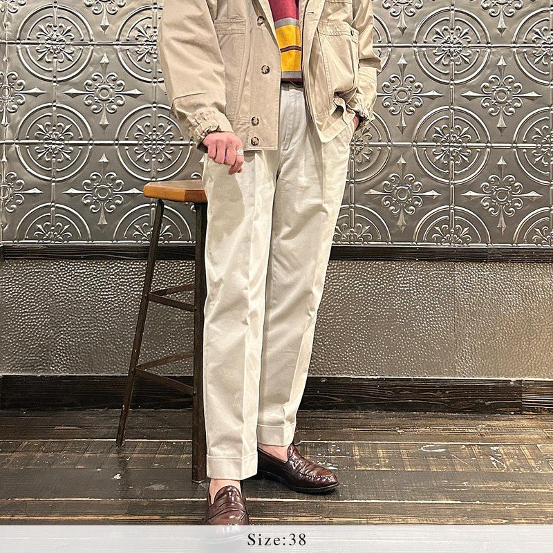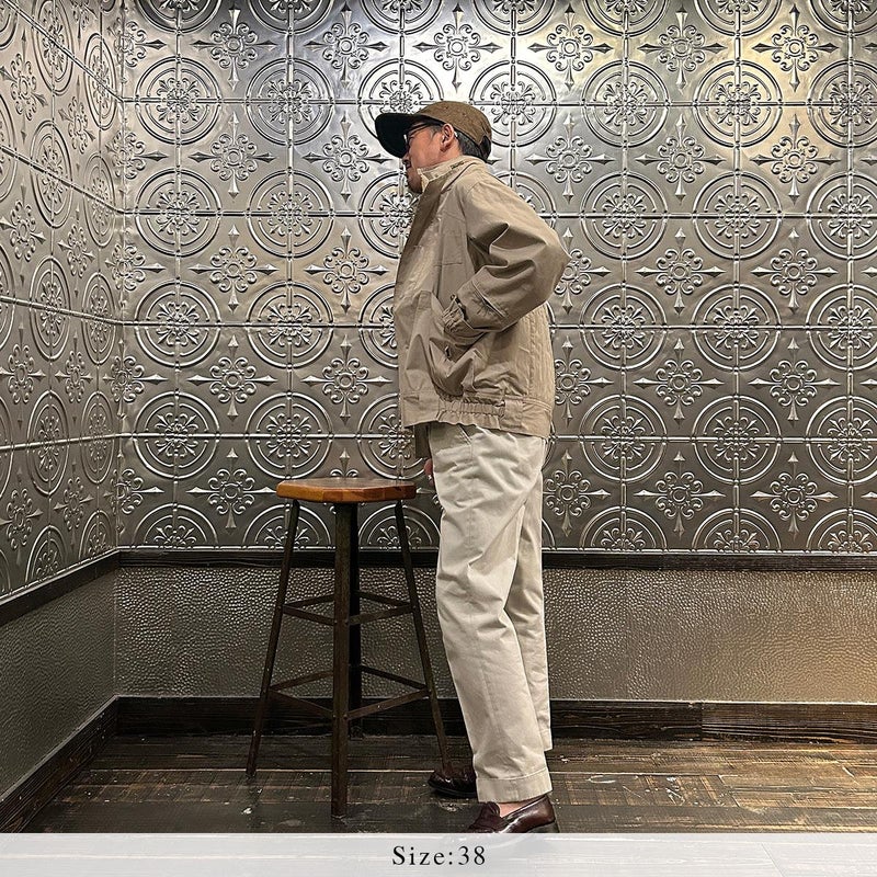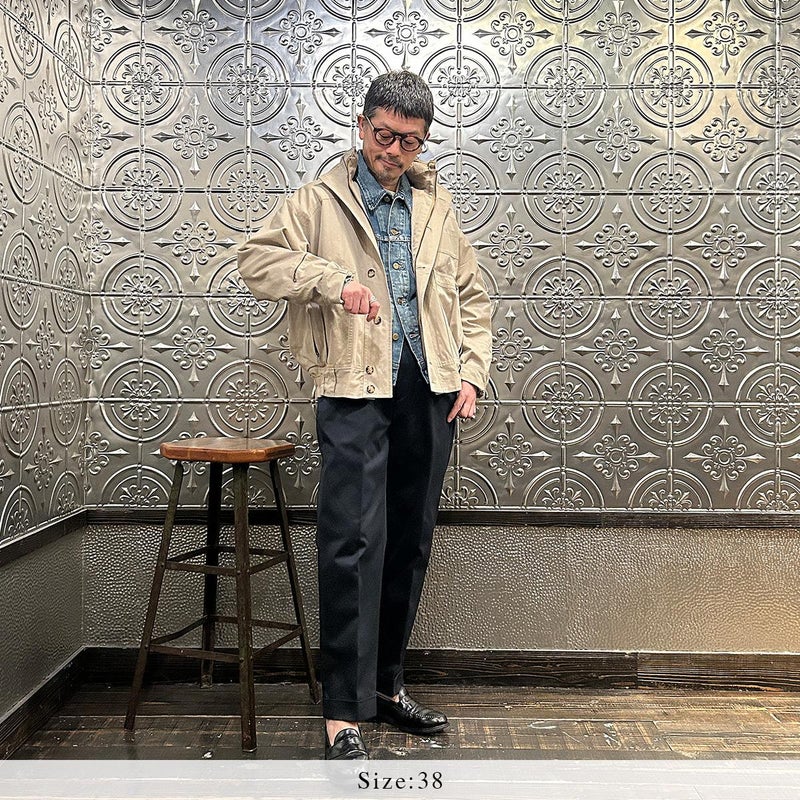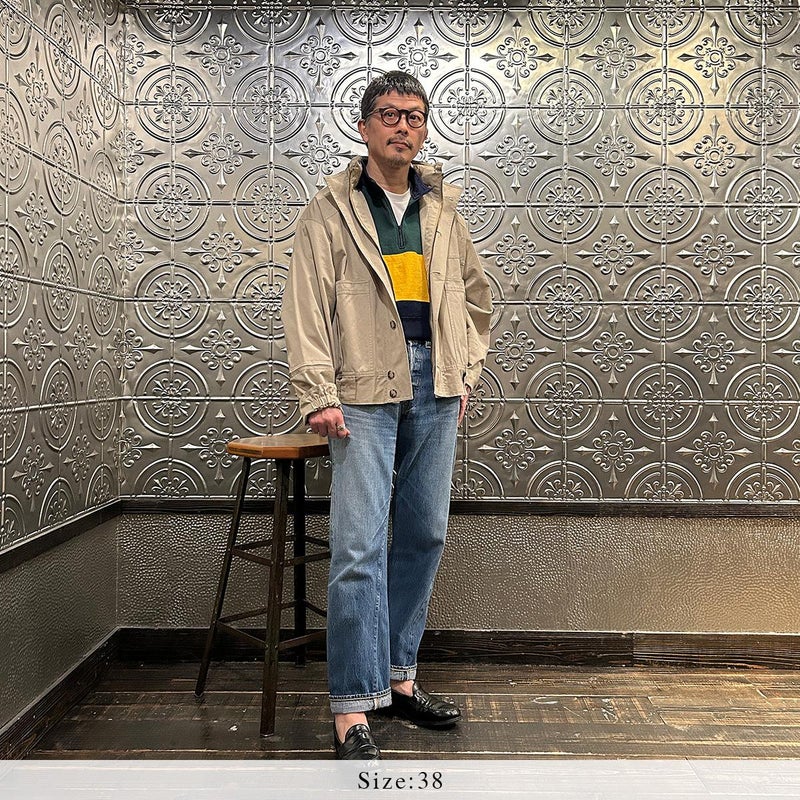 170センチ65キロの体型で「38」サイズで少しゆったり目の着用感です。中に着込めて真冬の着用を想定したサイズで考えるとこのサイズ。シャツやカットソー1枚で羽織っても大きすぎることはありませんでした。雰囲気抜群の丸みを帯びた野暮ったいサイズ感が個人的にはお気に入り。昔ながらの仕様を完全復刻させたスペシャルな1着。高密度で風を通しにくく、丈夫で万能な生地。春秋冬と長いシーズン着れます。服好きな方には堪らない希少価値のあるアイテムです。