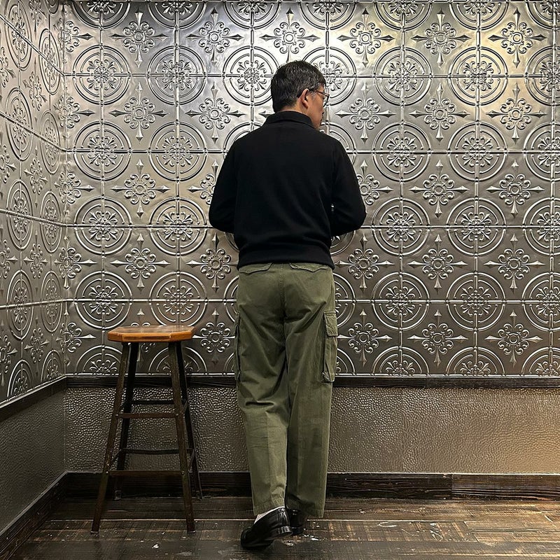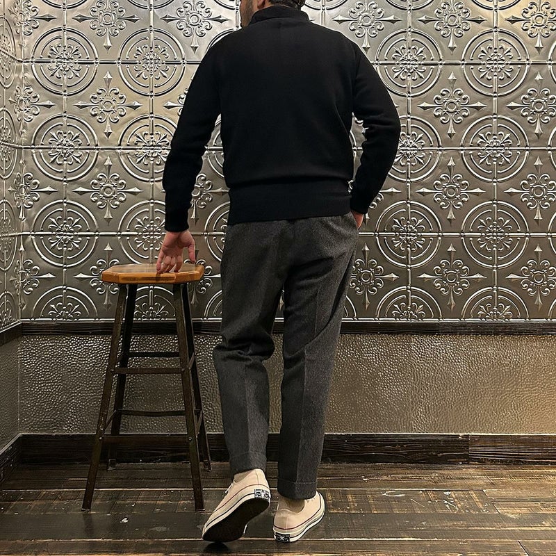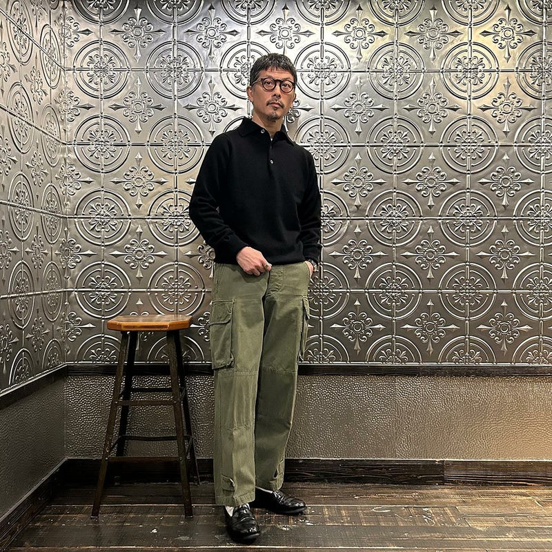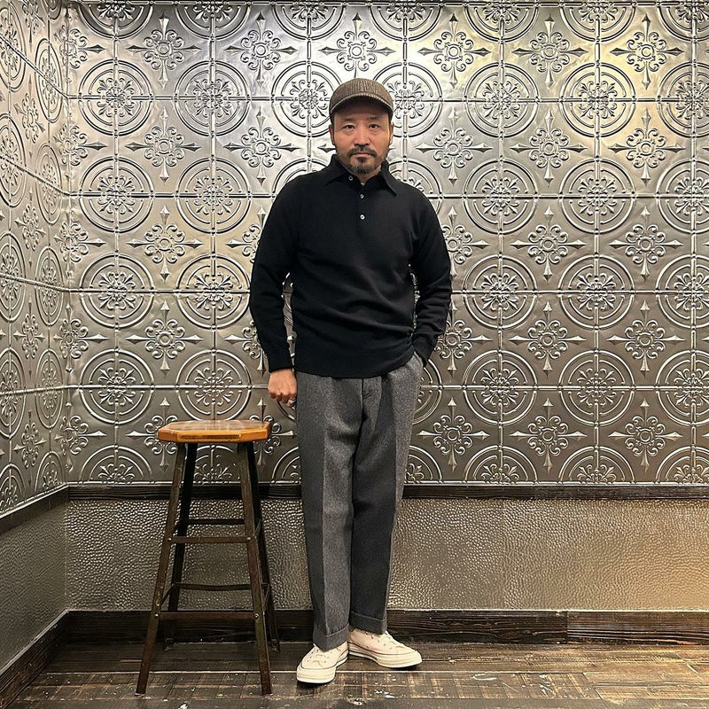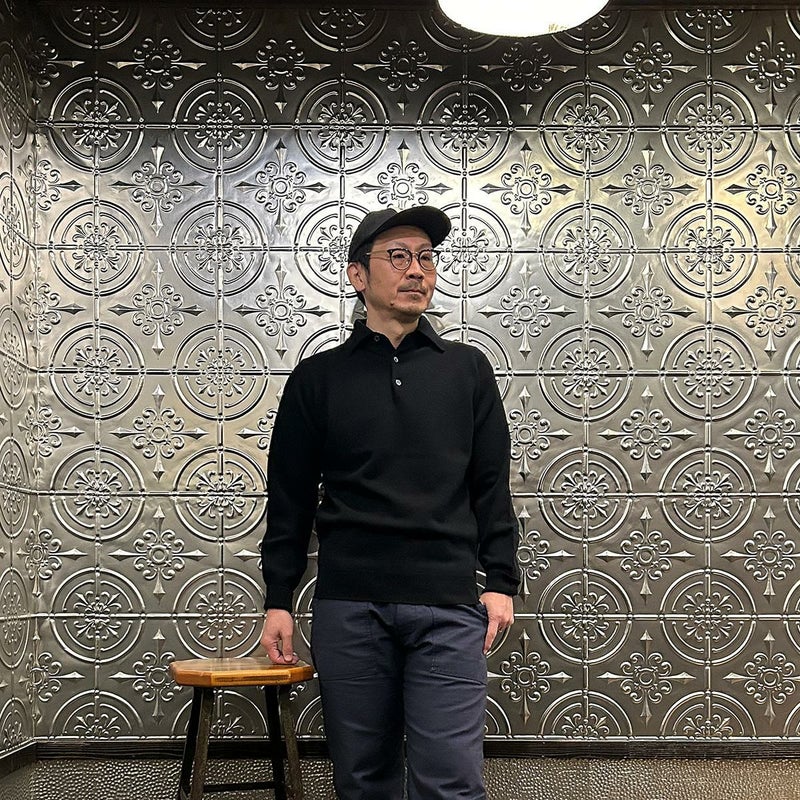 172センチ60キロで「38」でジャストサイズです。ロンTの上に着て丁度良いサイズ感。タートルネックのカットソーやシャツの上から着て重ね着も楽しめる長袖ニットポロ。生地が厚めのシャツの上に着る想定であれば「40」でも良いかなという印象です。一枚で着てもクルーネックよりは雰囲気があり、アウターの下に着た場合はシャツのような雰囲気も出せる便利さ。このウィリアムロッキーのニットポロの何が良いかと言いますと、比較的しっかりとしたキレイな襟型。ペタッとした平面的な襟ではなく、仕立ての良いシャツのような立体的な襟。この手のアイテムをビジネスでも着れるという方にもオススメしたい。ジャケット好きな方にはインナーに是非着て欲しいですね!インラインはカシミヤしかなかったので、幅広いお客様にお楽しみ頂けるように別注でラムウールに変更してもらいました。ラムだとチクチクするという方は中にコットンのタートルネックかシャツ、もしくはバンダナやネッカチーフを差してシャレた雰囲気を楽しんで下さい。