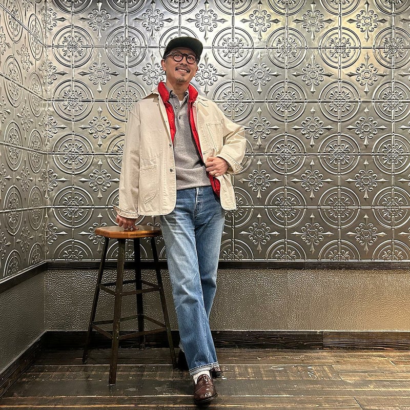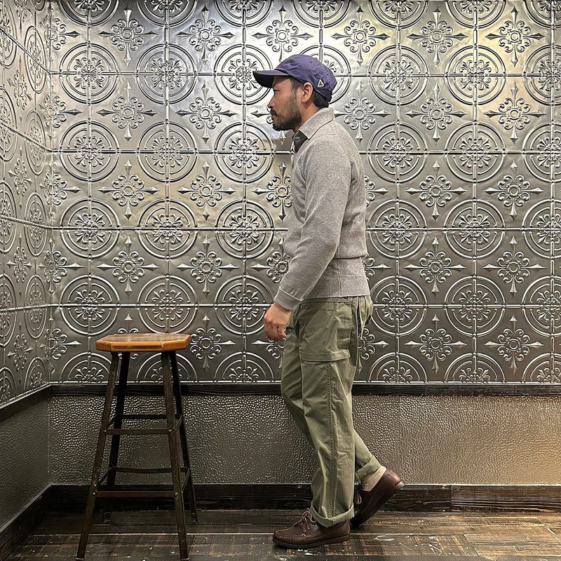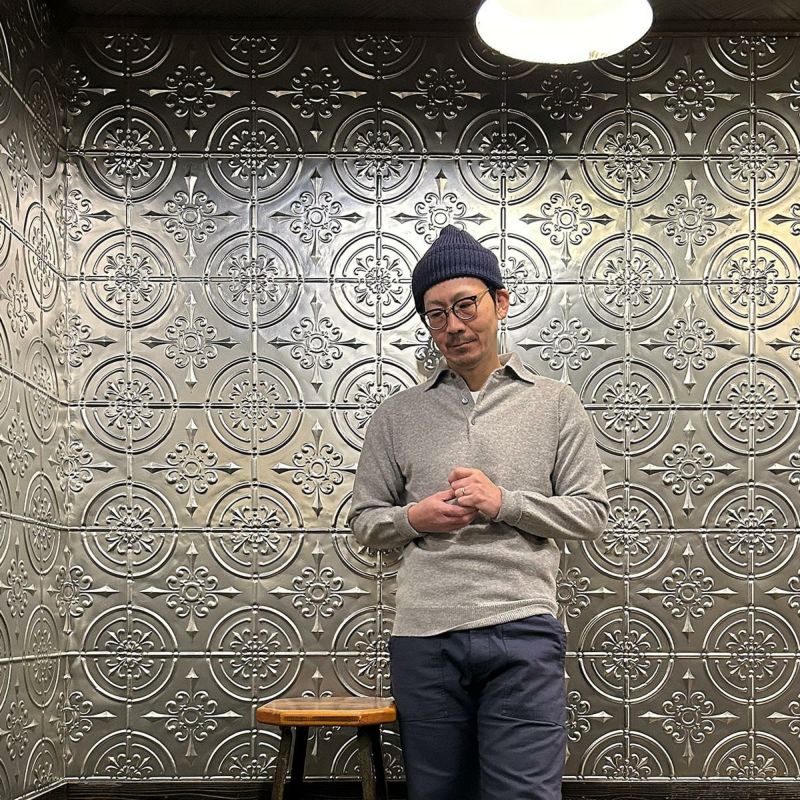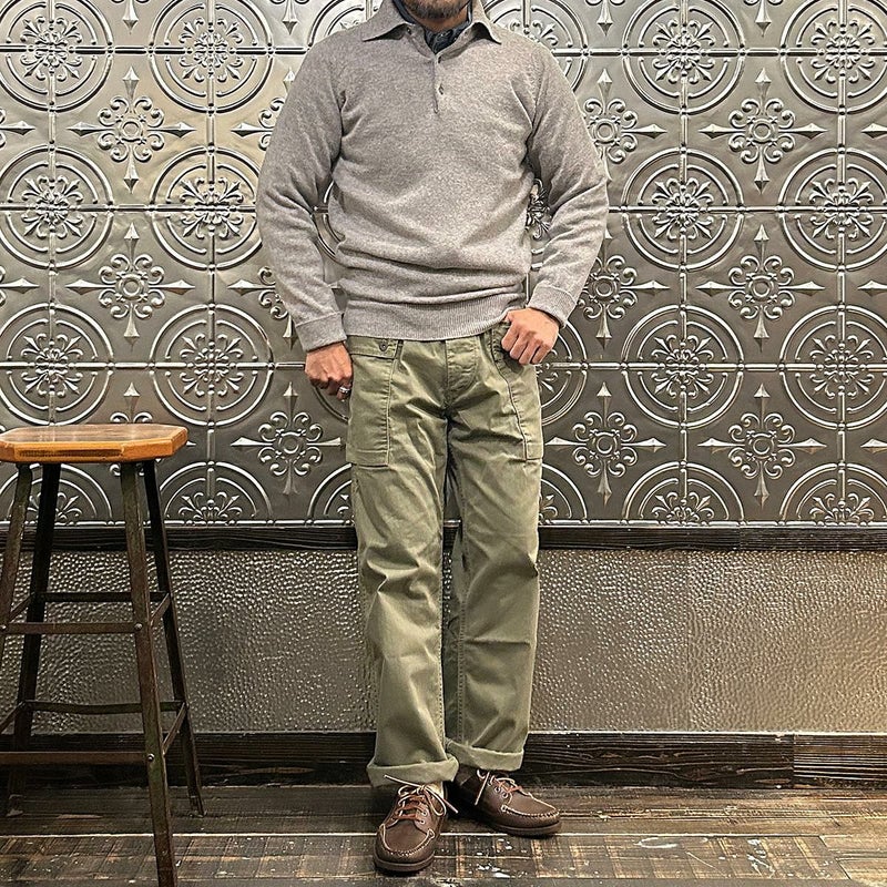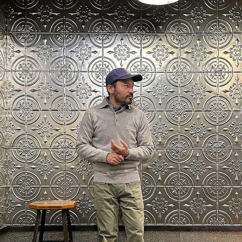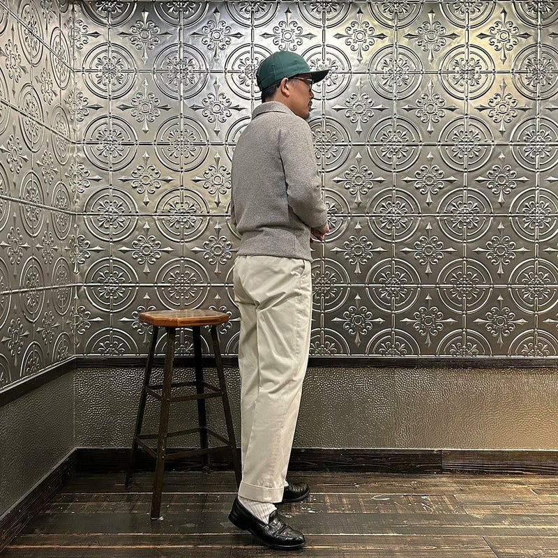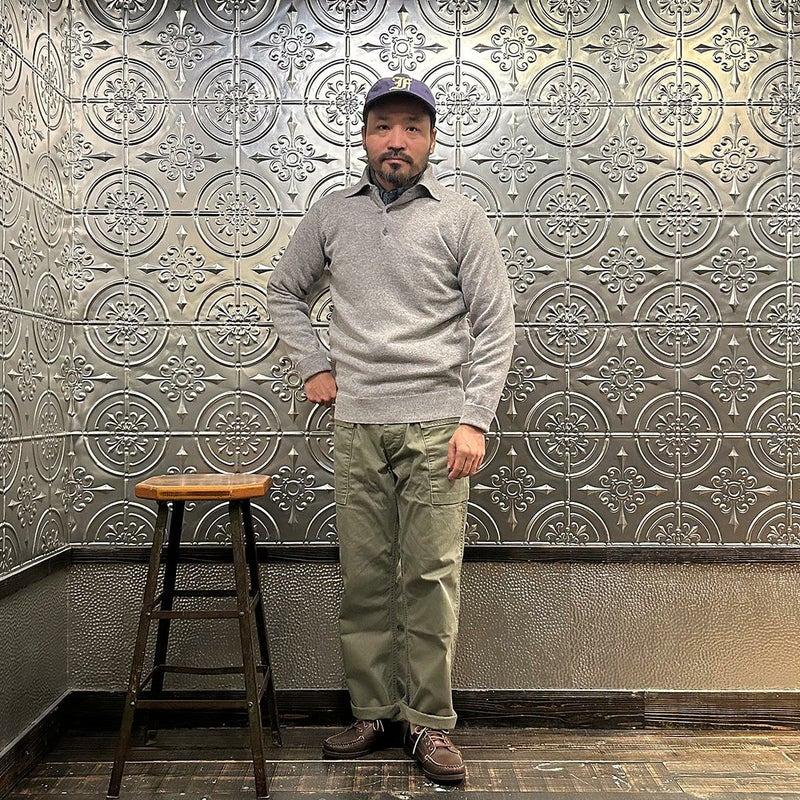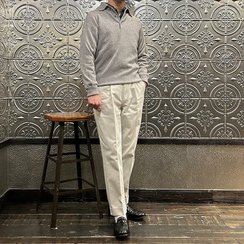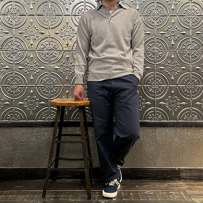 172センチ60キロで「38」でジャストサイズです。ロンTの上に着て丁度良いサイズ感。タートルネックのカットソーやシャツの上から着て重ね着も楽しめる長袖ニットポロ。生地が厚めのシャツの上に着る想定であれば「40」でも良いかなという印象です。一枚で着てもクルーネックよりは雰囲気があり、アウターの下に着た場合はシャツのような雰囲気も出せる便利さ。このウィリアムロッキーのニットポロの何が良いかと言いますと、比較的しっかりとしたキレイな襟型。ペタッとした平面的な襟ではなく、仕立ての良いシャツのような立体的な襟。この手のアイテムをビジネスでも着れるという方にもオススメしたい。ジャケット好きな方にはインナーに是非着て欲しいですね!インラインはカシミヤしかなかったので、幅広いお客様にお楽しみ頂けるように別注でラムウールに変更してもらいました。ラムだとチクチクするという方は中にコットンのタートルネックかシャツ、もしくはバンダナやネッカチーフを差してシャレた雰囲気を楽しんで下さい。