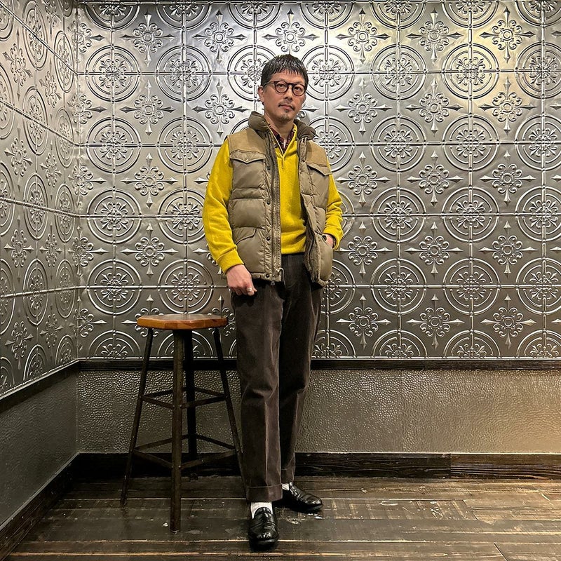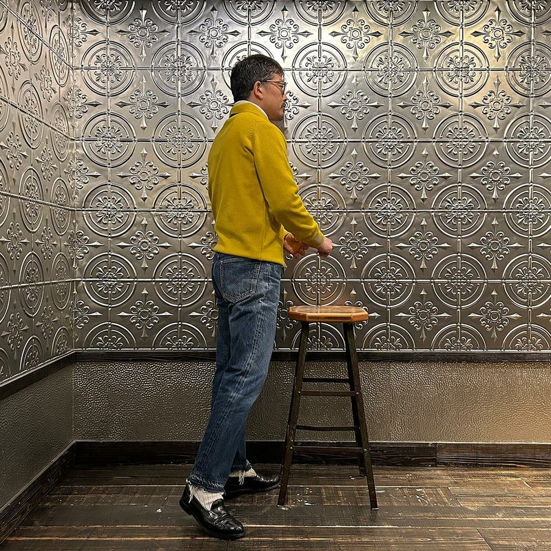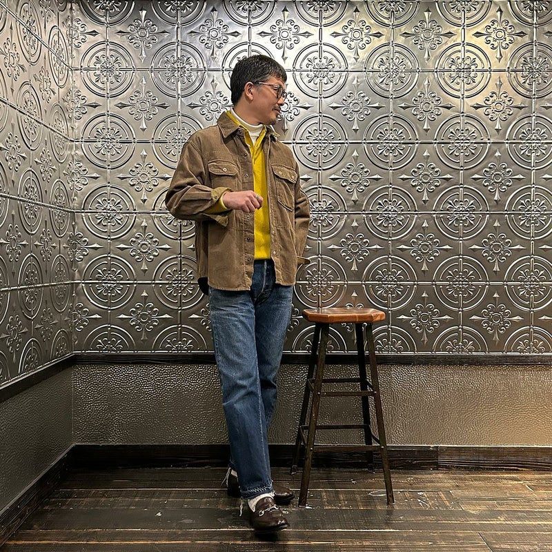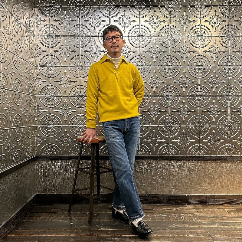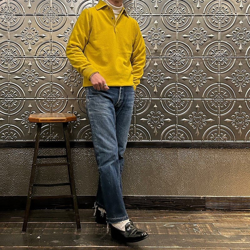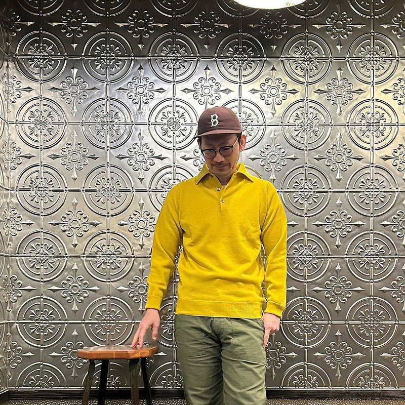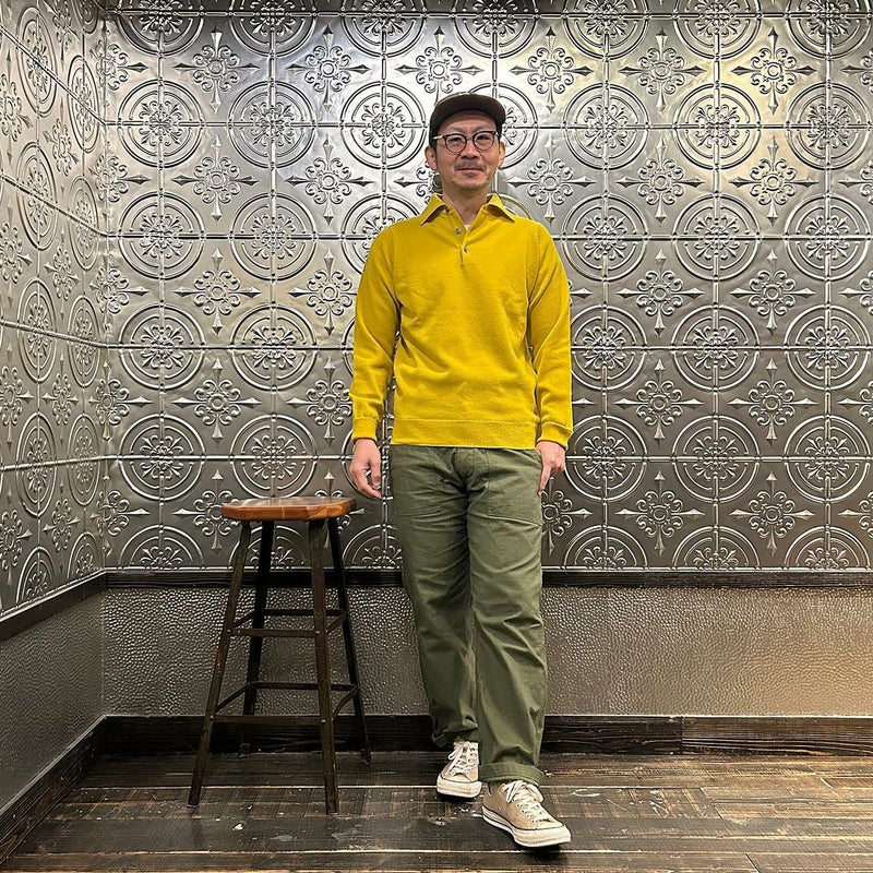 172センチ60キロで「38」でジャストサイズです。ロンTの上に着て丁度良いサイズ感。タートルネックのカットソーやシャツの上から着て重ね着も楽しめる長袖ニットポロ。生地が厚めのシャツの上に着る想定であれば「40」でも良いかなという印象です。一枚で着てもクルーネックよりは雰囲気があり、アウターの下に着た場合はシャツのような雰囲気も出せる便利さ。このウィリアムロッキーのニットポロの何が良いかと言いますと、比較的しっかりとしたキレイな襟型。ペタッとした平面的な襟ではなく、仕立ての良いシャツのような立体的な襟。この手のアイテムをビジネスでも着れるという方にもオススメしたい。ジャケット好きな方にはインナーに是非着て欲しいですね!インラインはカシミヤしかなかったので、幅広いお客様にお楽しみ頂けるように別注でラムウールに変更してもらいました。ラムだとチクチクするという方は中にコットンのタートルネックかシャツ、もしくはバンダナやネッカチーフを差してシャレた雰囲気を楽しんで下さい。