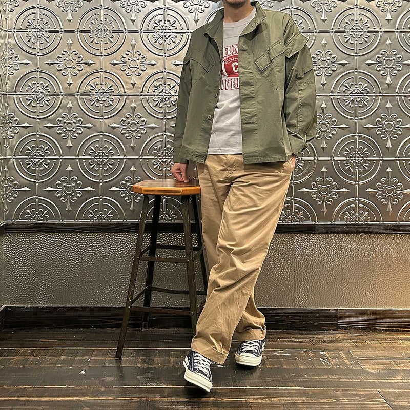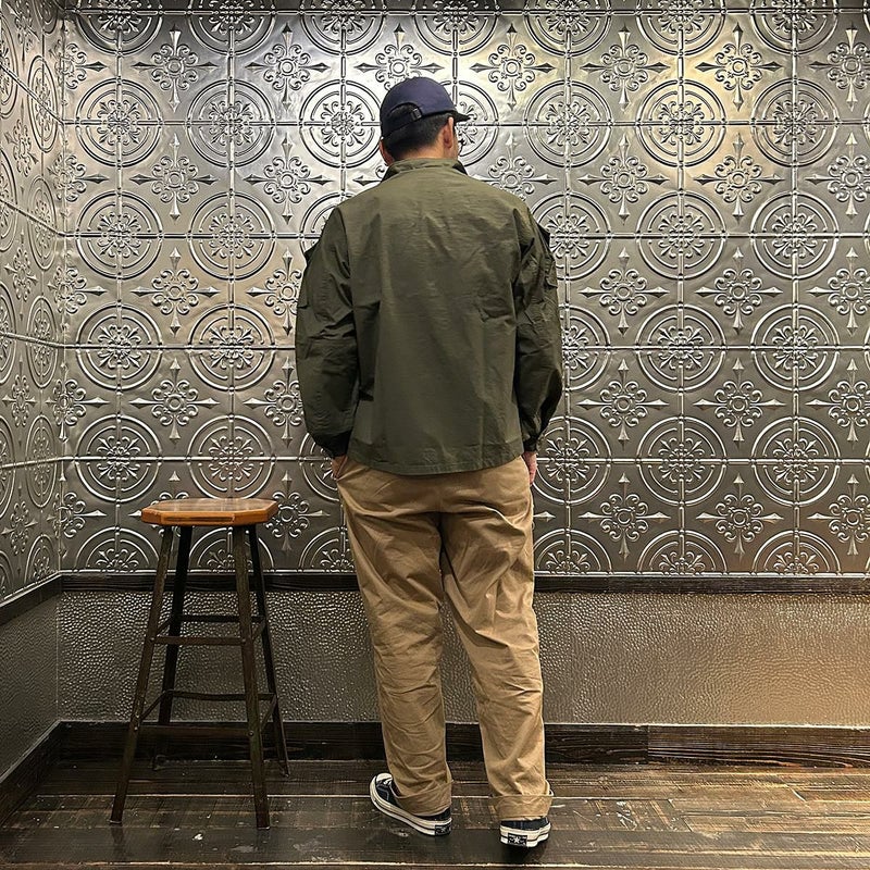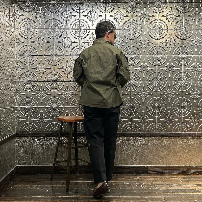 170センチ68キロで「M」で少しゆとりのあるサイズです。中にミドルウェイトのスウェット、パーカーぐらいでしたら着込めますし、ジャケットの上にコート感覚でも着れます。厚すぎない生地なのでアウターのインナーとしても着用可能。ワーカーズらしいマニアックな観点からアレンジされた襟型が特徴のミリタリーシャツジャケタイプ。洗い着倒していくことで経年変化が楽しみな生地。春秋冬と長いシーズン楽しめる1着。