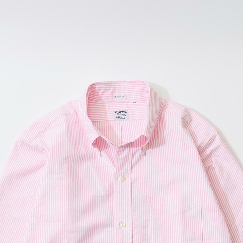 WORKERS(ワーカーズ)のMODIFIED BD SUPIMA OX。クラシックな雰囲気の大きめの襟。フロントボタンは6ボタン仕様。左胸に1つのポケット。バックはボックスプリーツ。スタンダードなデザインのボタンダウンシャツ。適度なゆとりのある身幅、落ちすぎず、入りすぎない肩幅、裾を出しても入れても着られる着丈とデザイナーの拘りが詰まった絶妙なシルエット。サラッとした肌触りで通年使用可能なスーピマコットンのオックスフォード素材を使用。スタンダードなデザインのボタンダウンシャツはワードローブに欠かすことの出来ない1着。
