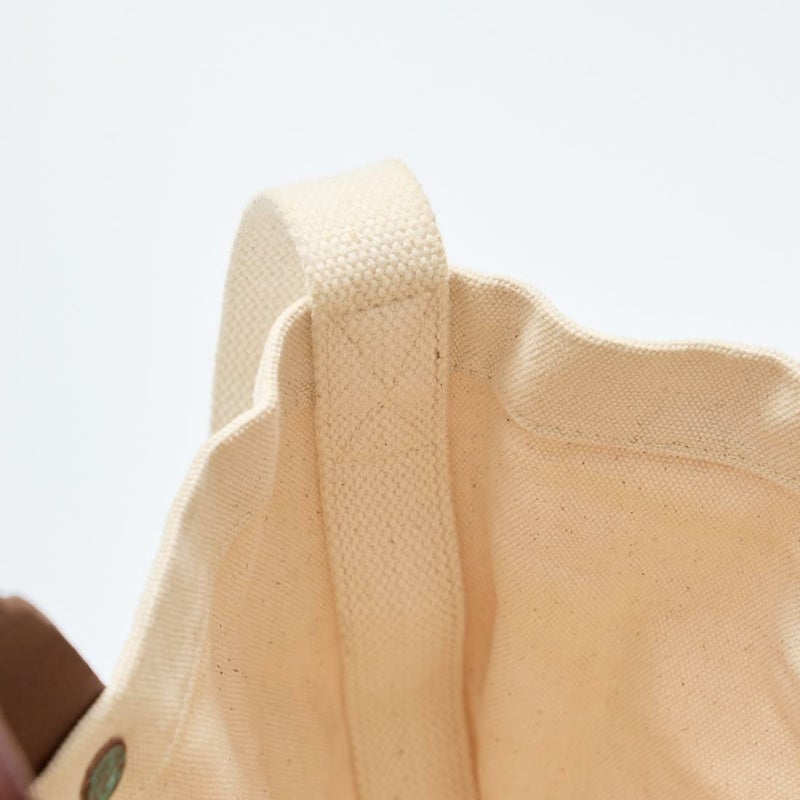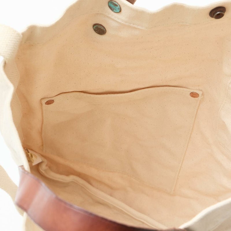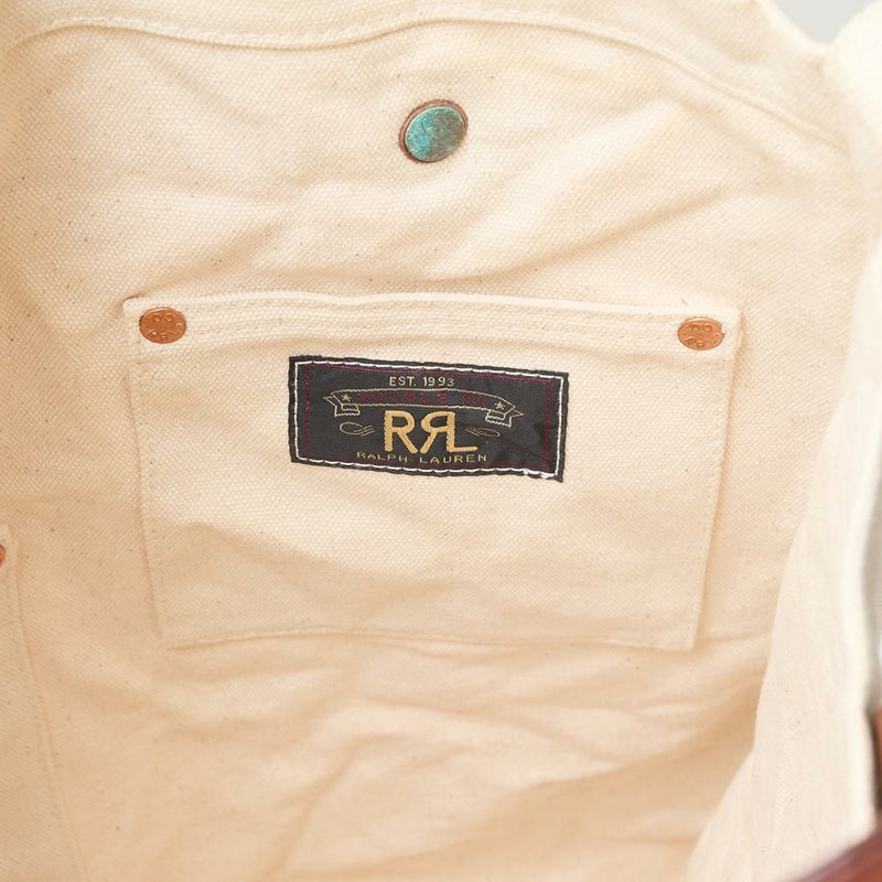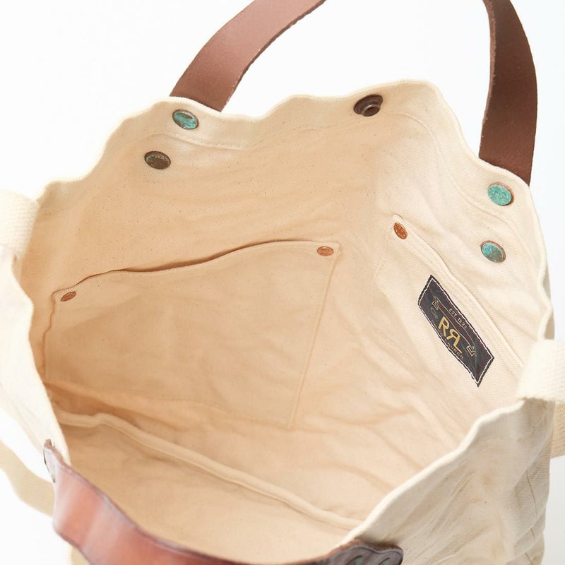 Double RL(ダブルアールエル)のMARKET TOTE TOTE COTTON CANVAS。ナチュラルカラーのコットンキャンバスを使用したシンプルなトートバッグ。表中央にステンシルでブランドロゴがプリントされています。レザーの手持ちハンドルと、コットンキャンバスのショルダーストラップ付きの2WAY仕様。内側には大小二つのポケットが縫い付けられ、表面にステッチ、リベットが出るデザインになっています。