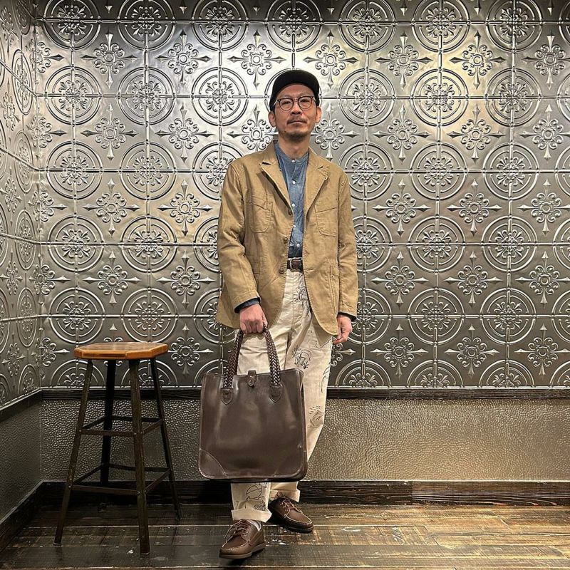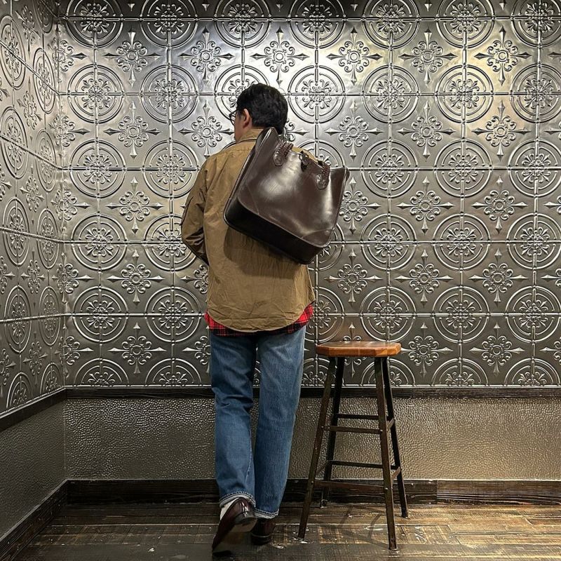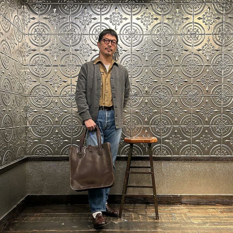 かなりカッコイイです。持ち手部分はカウハイドを採用したメッシュレザーにイングリッシュブライドルレザーを贅沢に使用したイングランド製のオールレザートートバッグ。かなり存在感のある雰囲気抜群の立ち振る舞い。ホントに素敵です。綺麗目なスタイリングに合わせるのも良いですし、敢えてラフに合わせた時に使って頂けるのも個人的にはオススメ。使い込む事でカッコよくなるので長年の相棒としていかがでしょうか?経年変化を楽しみながらずっと付き合っていきたいバッグです。