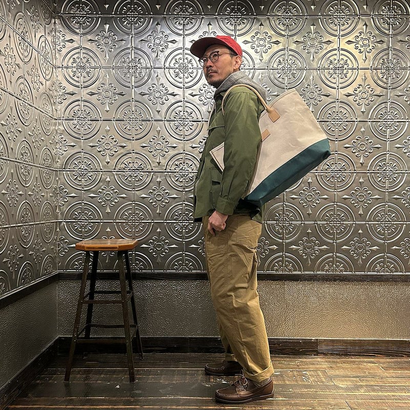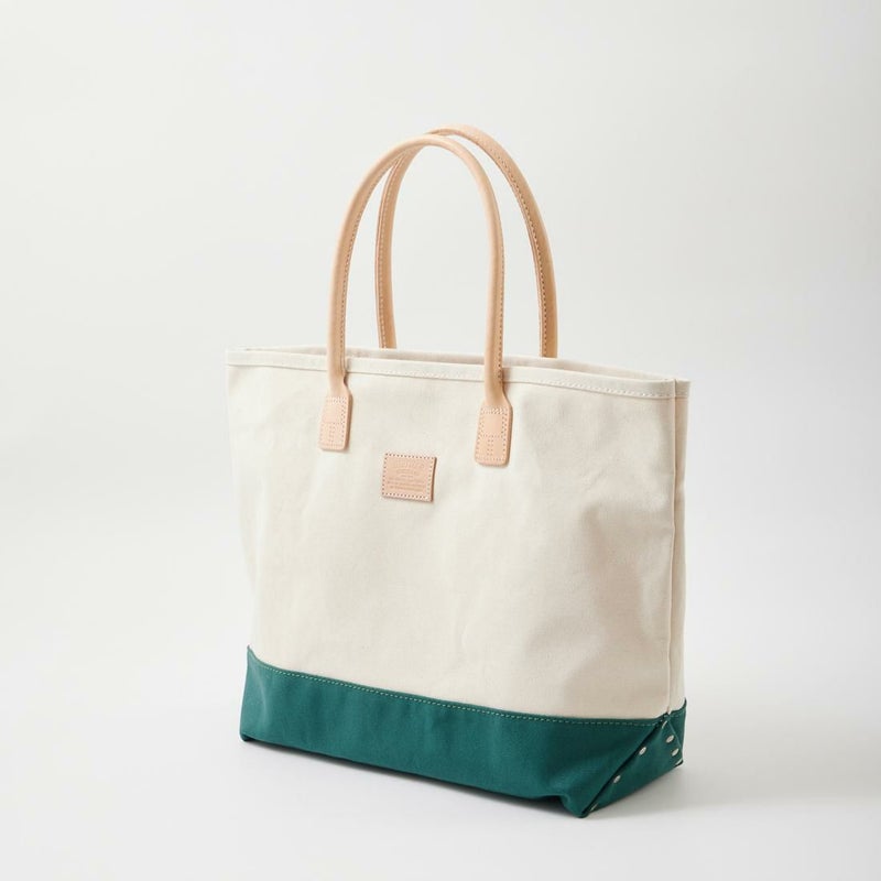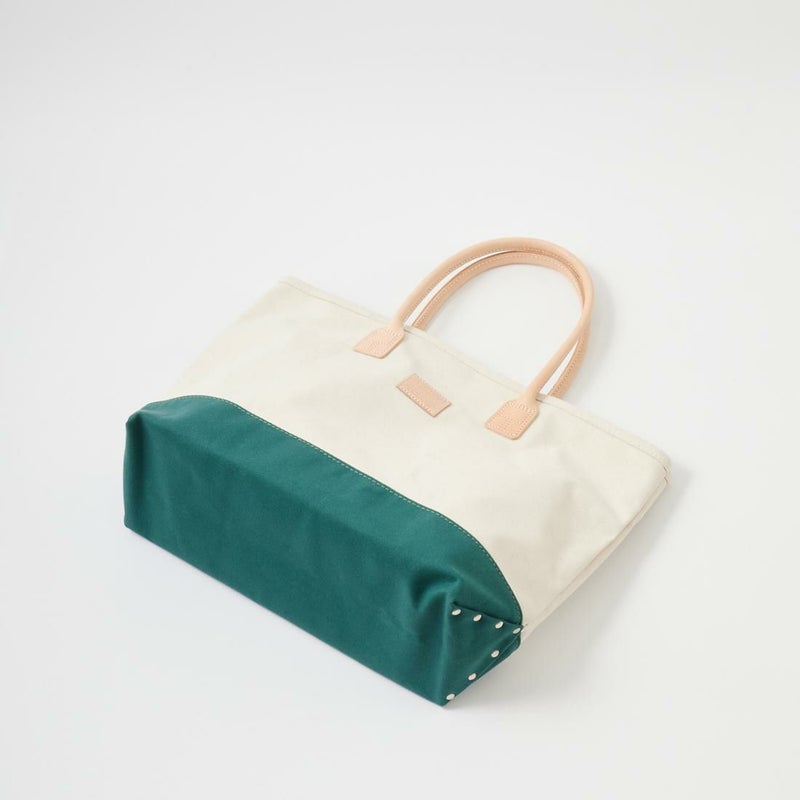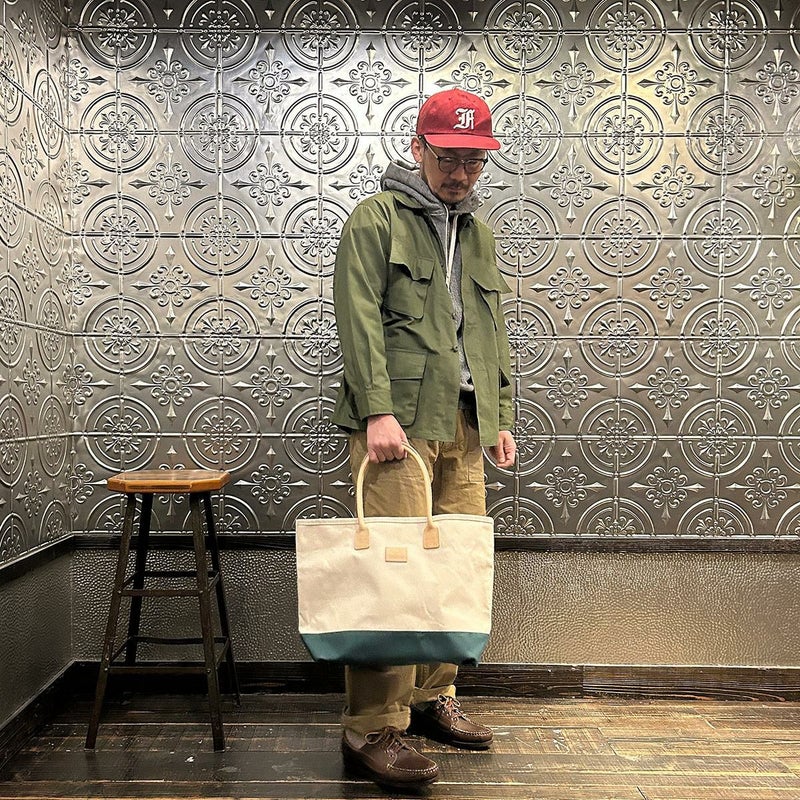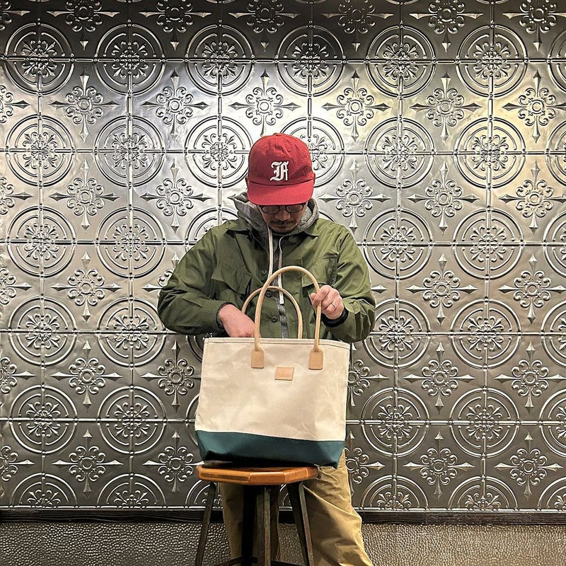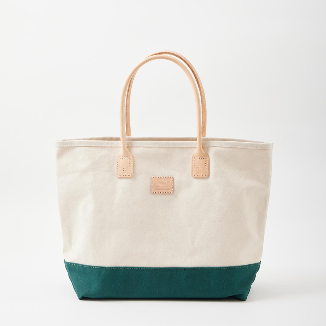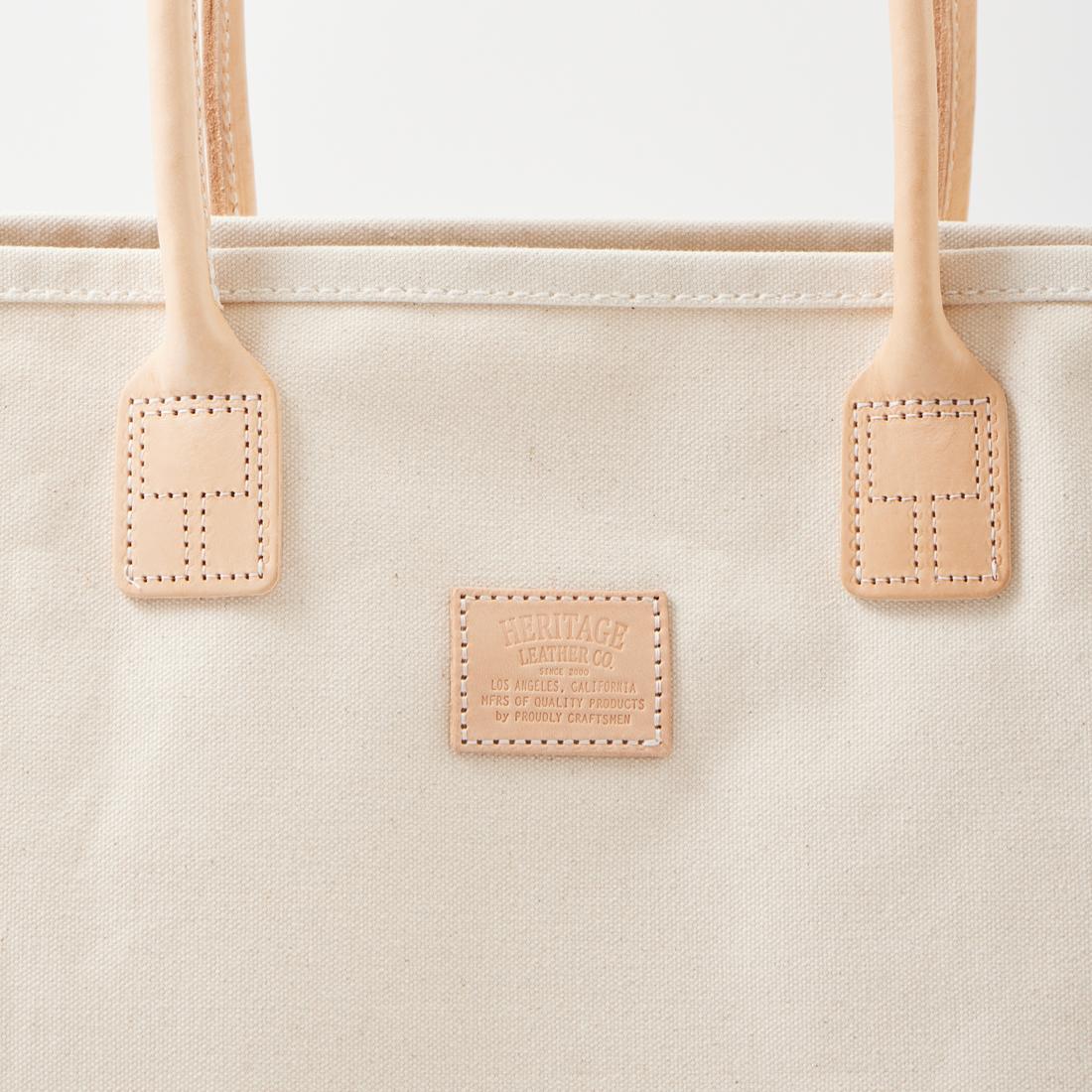 HERITAGE LEATHER(ヘリテージレザー)のCANVAS BOTTOM DAY TOTE 。18オンスのコットンキャンバスダックをボディに使用したトートバック。ハンドル部分は植物タンニンなめしの天然皮革。旅行などにも対応可能な大容量のトートバック。小物の収納に最適なインナーポケットも装備。キャンバスやレザー部分の経年変化も楽しみな1品。