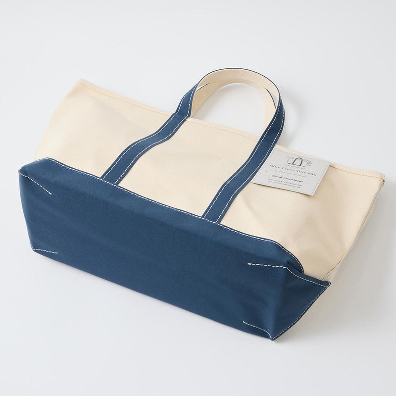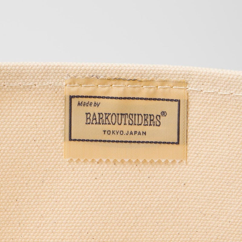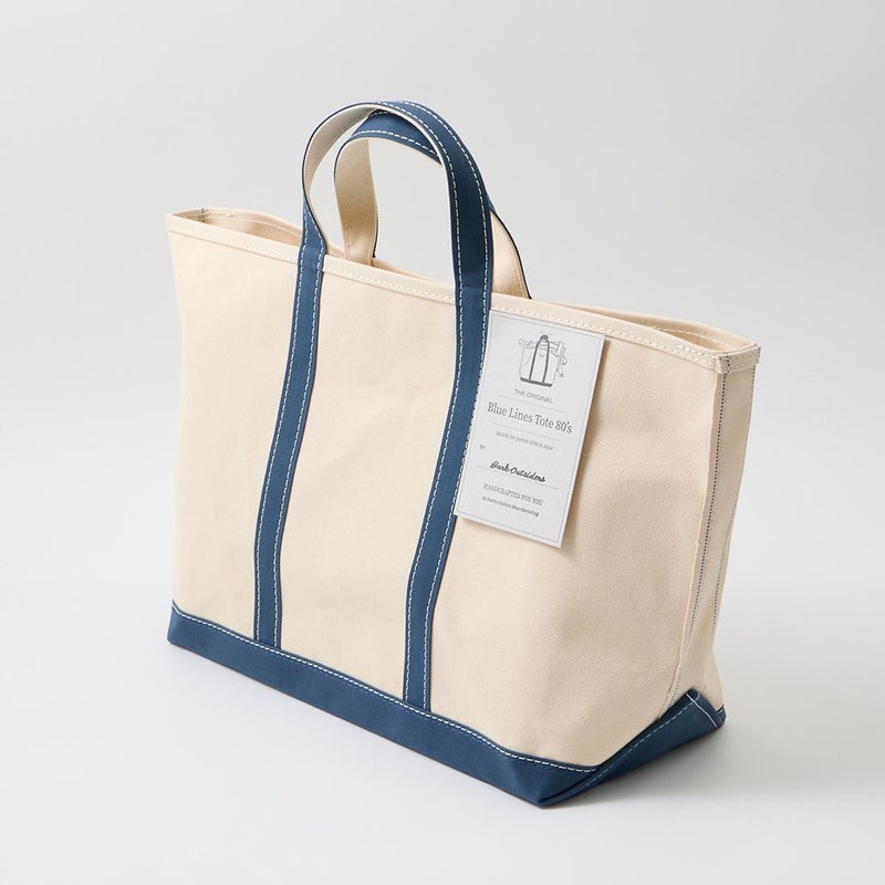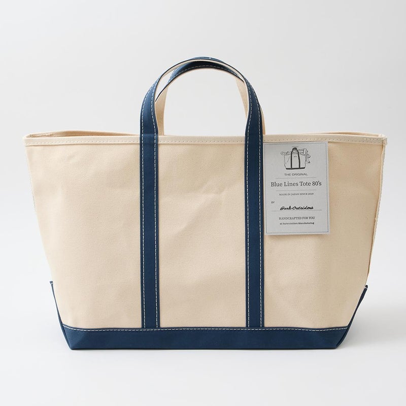 Barkoutsiders(バークアウトサイダーズ)のBLUE LINES TOTE 80's LARGE。国産の老舗キャンバスメーカーに特注した24ozパラフィン帆布を使用したキャンバストート。80年代のキャンバストート独特の雰囲気を日本の生産背景を活かして再現。狭幅のショートハンドル、サイドのブルーライン、現行よりボディの背が少し高かったフォルムなど細かい部分まで拘ったトート。スタイルを選ばないデザイン。経年変化も楽しみな逸品。