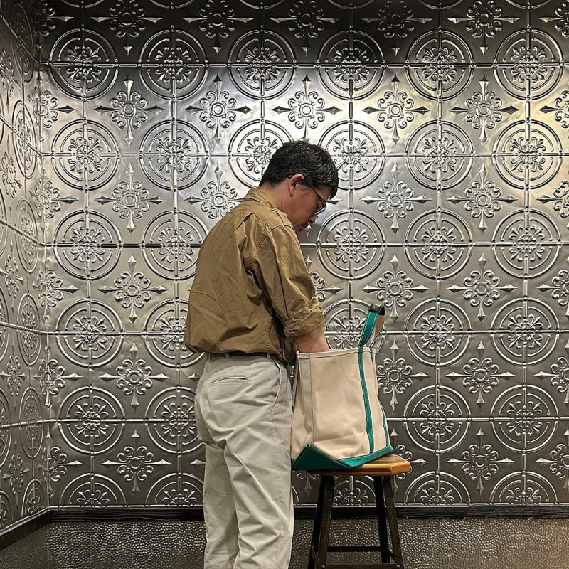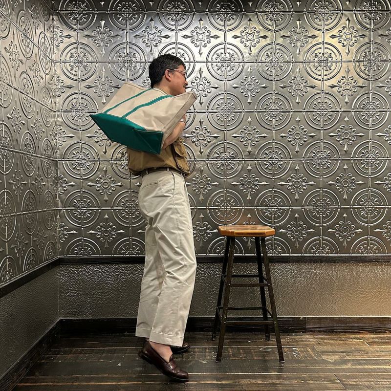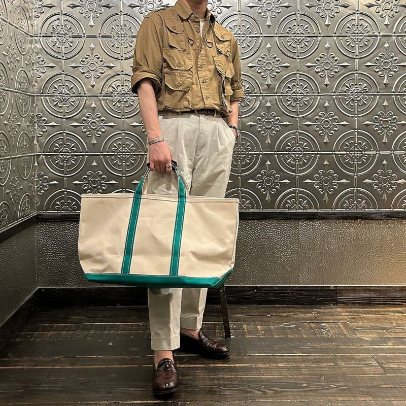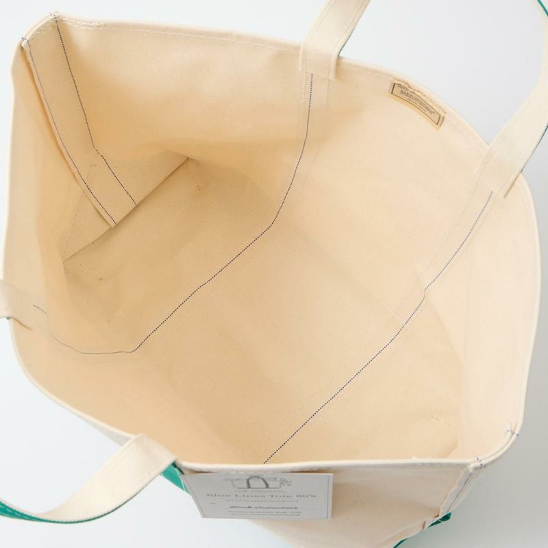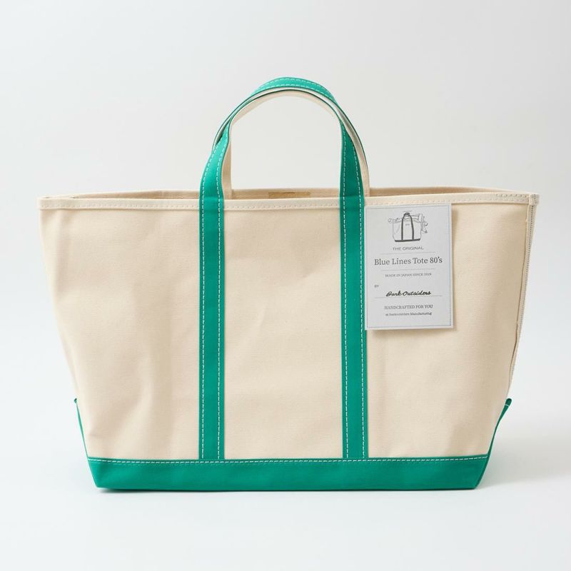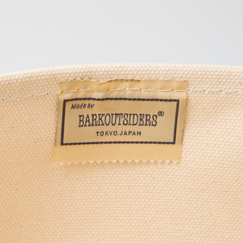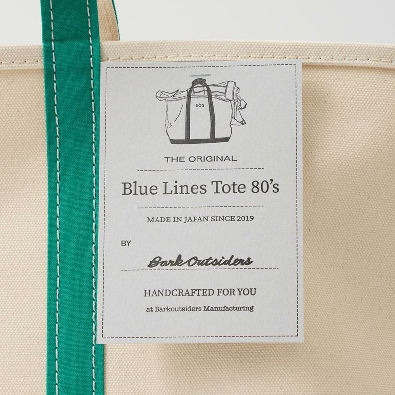 Barkoutsiders(バークアウトサイダーズ)のBLUE LINES TOTE 80's LARGE。国産の老舗キャンバスメーカーに特注した24ozパラフィン帆布を使用したキャンバストート。80年代のキャンバストート独特の雰囲気を日本の生産背景を活かして再現。狭幅のショートハンドル、サイドのブルーライン、現行よりボディの背が少し高かったフォルムなど細かい部分まで拘ったトート。スタイルを選ばないデザイン。経年変化も楽しみな逸品。