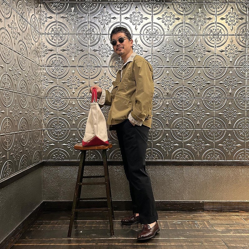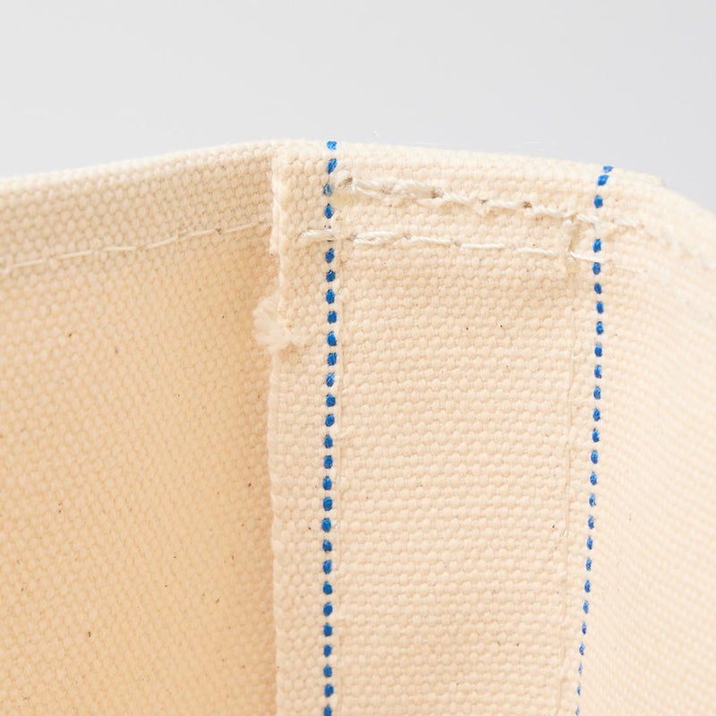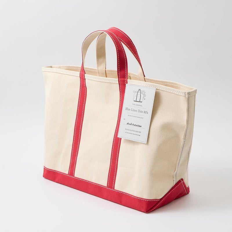 Barkoutsiders(バークアウトサイダーズ)のBLUE LINES TOTE 80's LARGE。国産の老舗キャンバスメーカーに特注した24ozパラフィン帆布を使用したキャンバストート。80年代のキャンバストート独特の雰囲気を日本の生産背景を活かして再現。狭幅のショートハンドル、サイドのブルーライン、現行よりボディの背が少し高かったフォルムなど細かい部分まで拘ったトート。スタイルを選ばないデザイン。経年変化も楽しみな逸品。