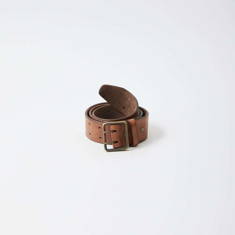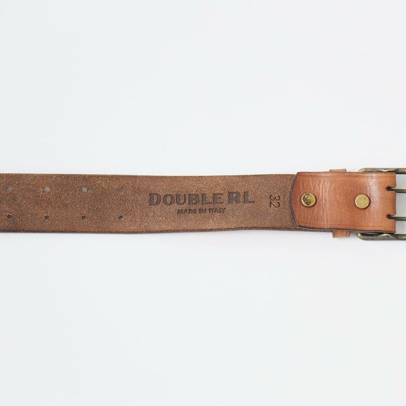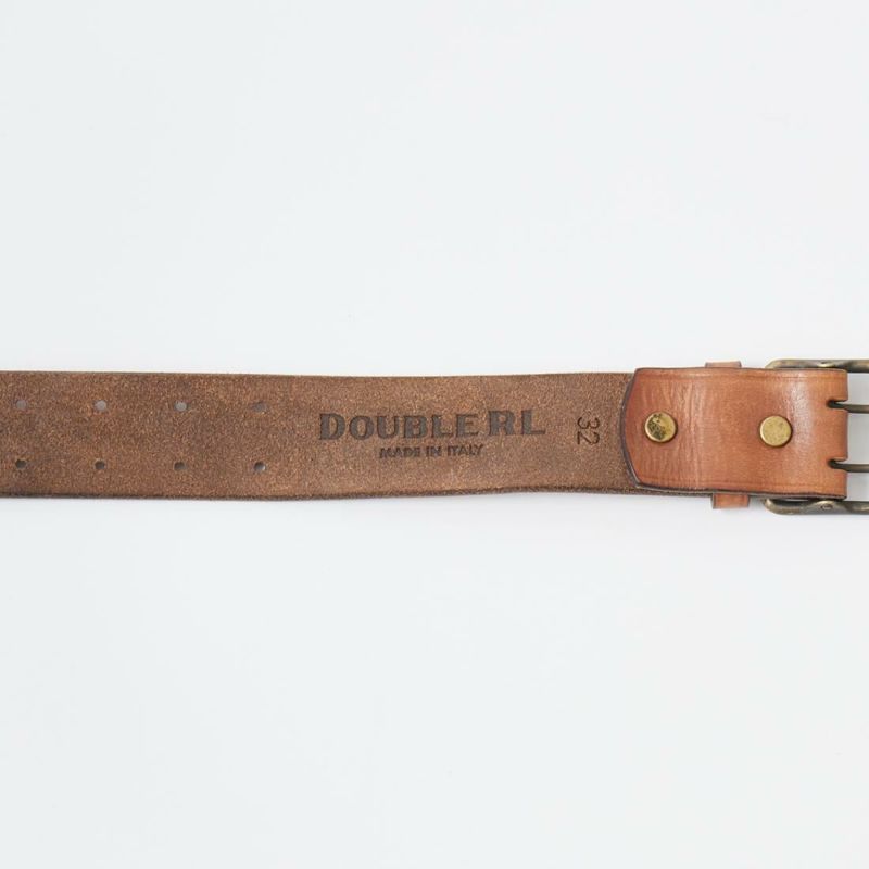 Double RL(ダブルアールエル)のCONRAD BELT BELT MEDIUM LEATHER。手染めのタンニンなめし革のイタリア製のダブルピンベルト。バックルはラッカー仕上げをしていないブラス。バックルの内側に腐食加工の施されたブラススナップ。ヴィンテージ感たっぷりのベルト。