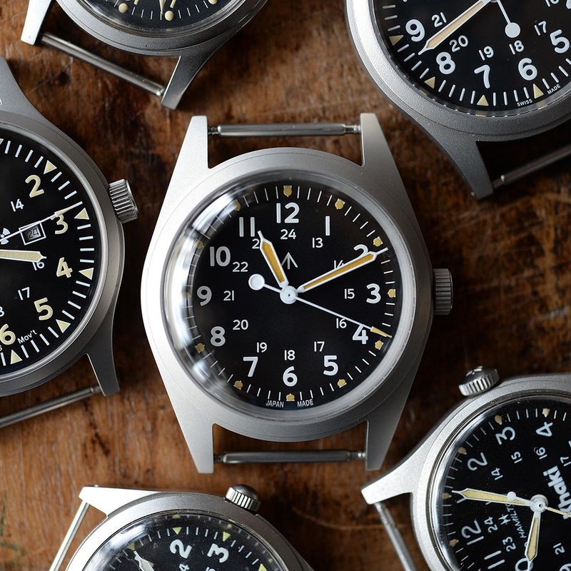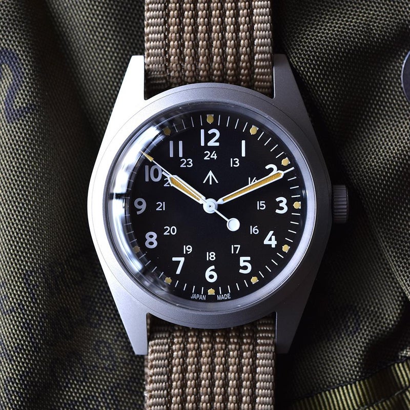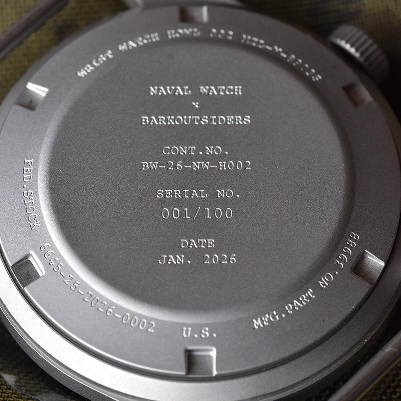 バークアウトサイダーズの森田氏が思い描く「キング・オブ・ミリタリーウォッチ」が日本のナバルウォッチとのコラボレーションにより実現。38mm径のベーシックなサイズのステンレススチールケースに自動巻きのムーブメント。ストラップはコヨーテカラーのNATOストラップが付属。ベトナムウォッチのミリタリーDNAを忠実に受け継ぐ「HOWL 002」の世界観を象徴する仕様。ステンレススチールケース はマットブラスト仕上げにより反射を抑え、傷も目立ちにくい仕様で実用性を重視。ケースバックは刻印入りのスクリューバック仕様。ラウンド状にテキストが配置され、原型にあたる「MIL-W-3818」に見られる特徴を再現。深いエッジングによる存在感のある刻印。生産年月とシリアルナンバーも刻印されます。本来はワンピース構造やスナップバック式だったのを防水性やメンテナンスのしやすさも考慮したスクリューバック仕様。ムーブメントはTMI社の「NH38」を採用。自動巻きの3針ノンデイト仕様。風防はサファイアドームガラス仕様。光の入り方を柔らかくし、クラシカルで豊かな表情。ハイエンドミリタリーウォッチと呼ぶのに相応しい仕上がり。日本のナバルウォッチによる100本限定生産。