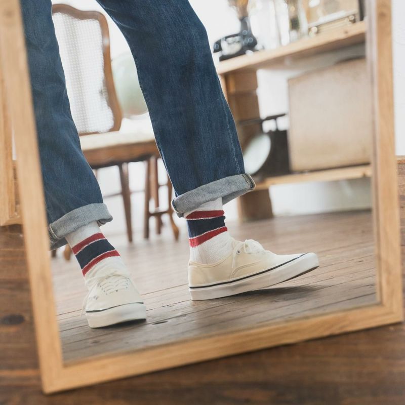 足の実寸は25センチぐらいです。こちらのソックスは問題なく穿けます。革靴、スニーカー、サンダルといった様々なアイテムとの相性抜群のネイビールーツのソックス。品質の高さ、穿き心地の良さは勿論のこと、丁寧に作られていることで長く穿いて頂けます。少し厚めのリブソックスですが、しっかりとしたホールド感がお気に入り。カジュアルから小綺麗なスタイルにも合わせ易い1足です。
