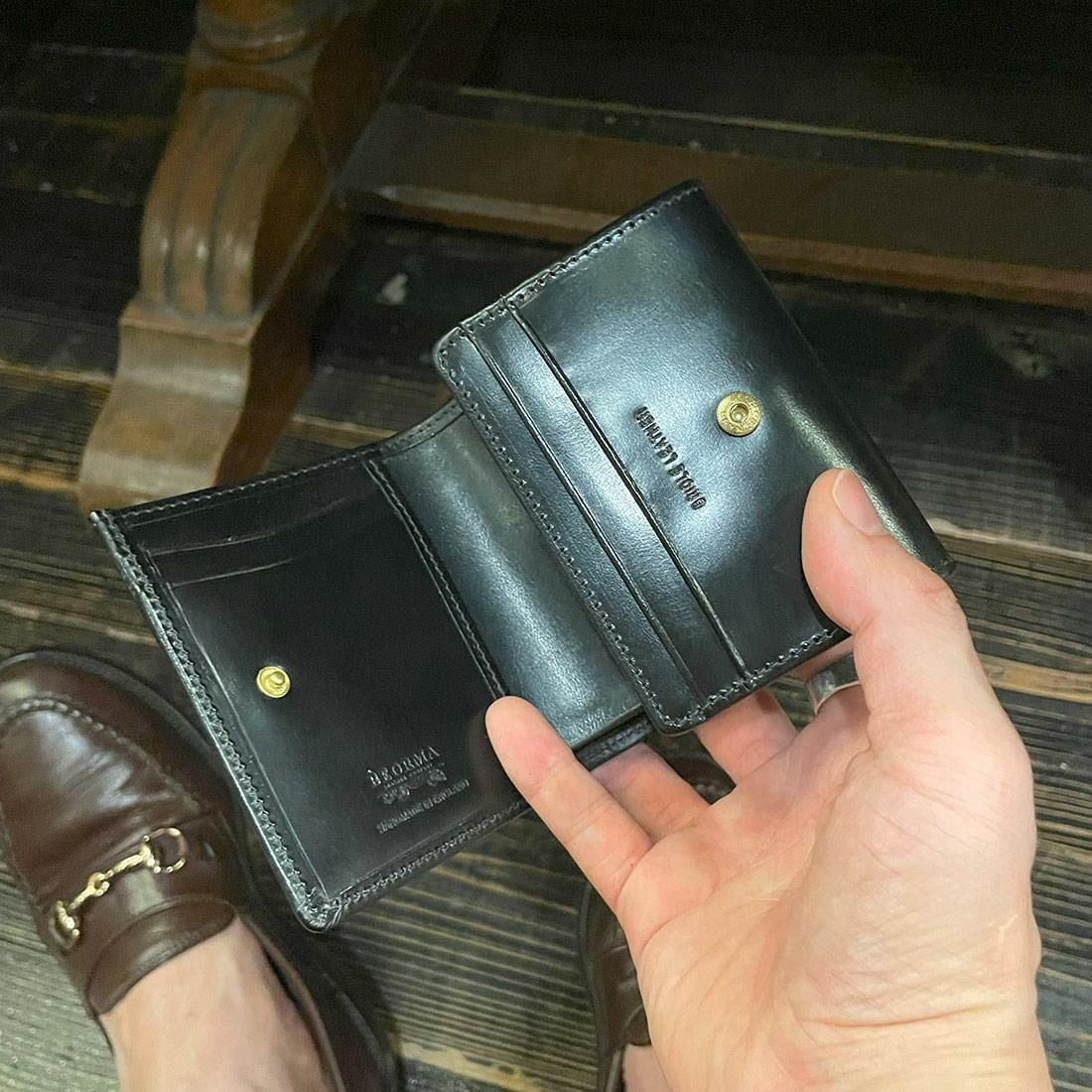 他の画像を見る ブライドルレザー コンパクトウォレット 財布 イギリス製 BEORMA LEATHER COMPANY (ベオーマレザーカンパニー) BRIDLE LEATHER COMPACT WALLET - BLACK 販売価格 ¥ 55,000 税込 お気に入りに登録する