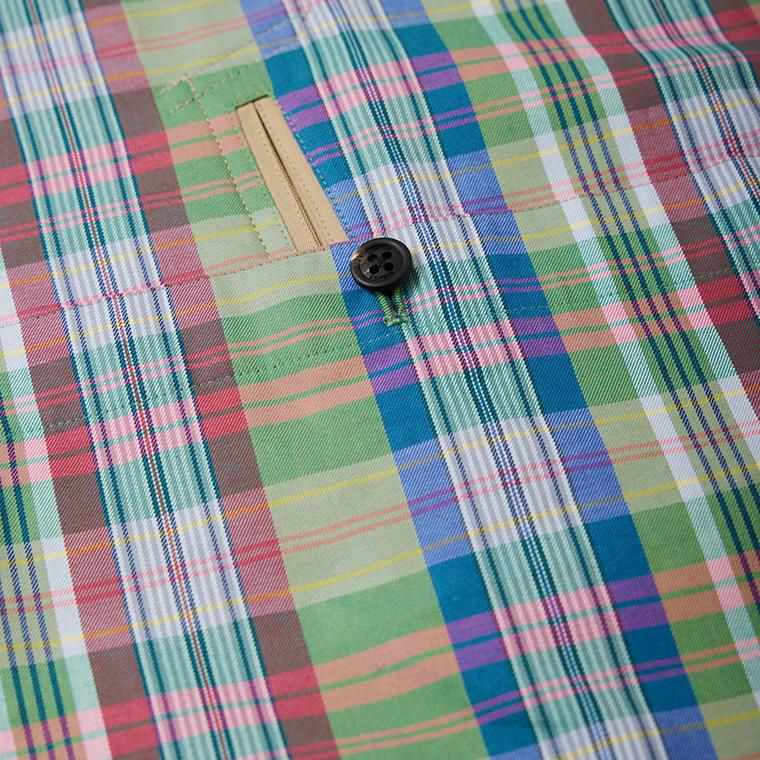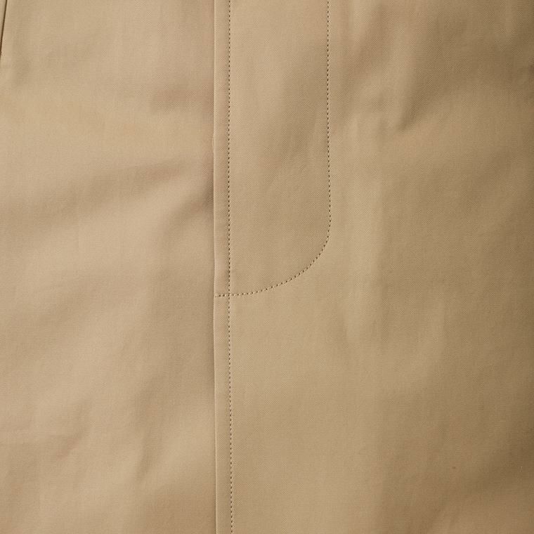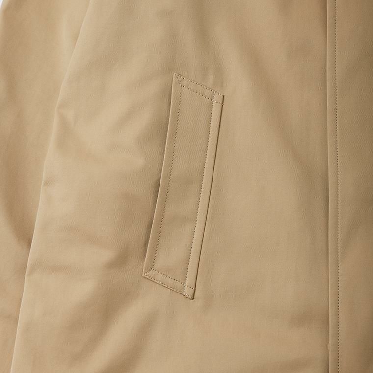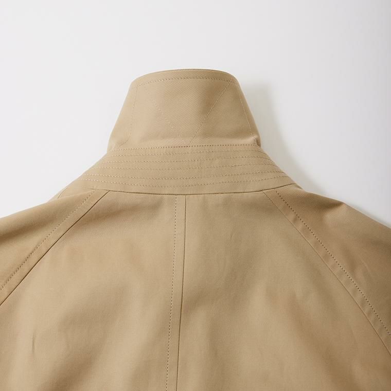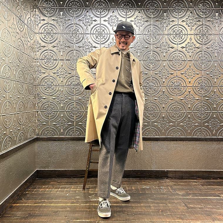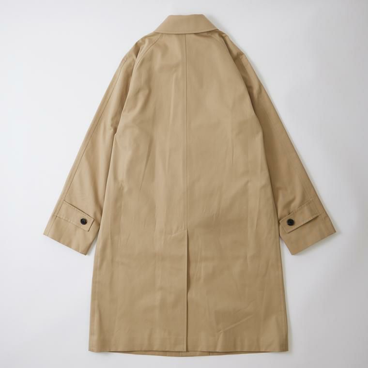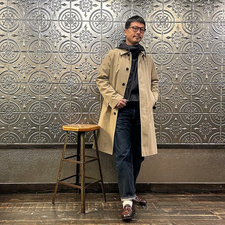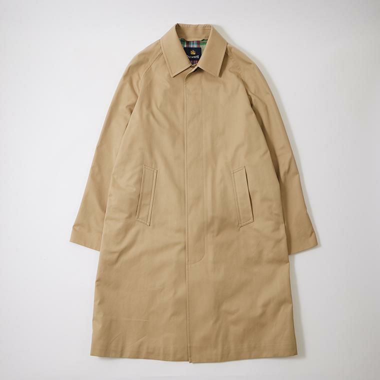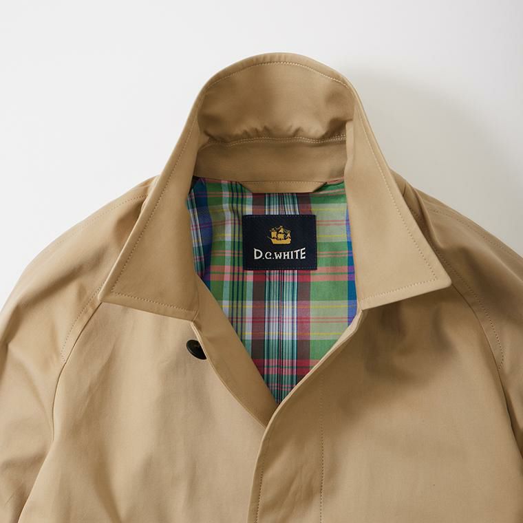 国内ブランド「D.C. WHITE」(ディーシーホワイト)のBALMACAAN COAT。24SS アルティメット(究極の)コレクションアイテム。スコットランド・ハイランド地方のバルマカーンという地名に由来すると言われている襟腰の後方が高く、前方に向かって低い状態で折り返る襟が特徴のバルマカーンコート。2枚袖のラグランスリーブ仕様で体に沿うナチュラルなシルエットが拘りのポイント。ライニングはオリジナルファブリックのマドラスチェック、刻印入りの水牛ボタンも良い雰囲気。素材には1893年創業の綿織物の工場で作られた先染め70番双糸のギャバジン素材。撥水、耐水、防風に加えて退色しづらいスレン染料(汗や水に強い)で染色した特徴的な素材。緩めのAラインシルエットが上品な雰囲気のコート。
