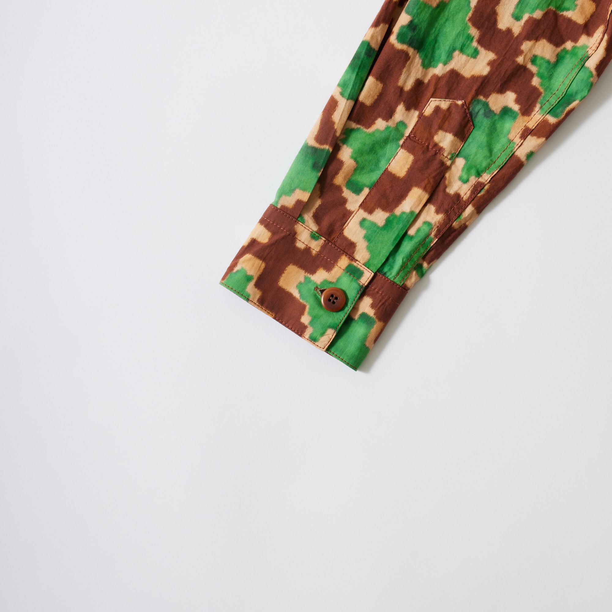 EAST HARBOUR SURPLUS(イーストハーバーサープラス)のHADLEY SHIRT JACKET PRINT。イタリア軍のプリズナーシャツ(囚人服)がデザインソース。コットン仕様のシャツジャケット。小さめの襟や腰部分の大きめのパッチポケット、袖口のカフ仕上げが特徴的なデザイン。薄手で程よいハリコシ感のあるコットン素材。インパクトのあるプリントがスタイリングの主役になってくれる1着。