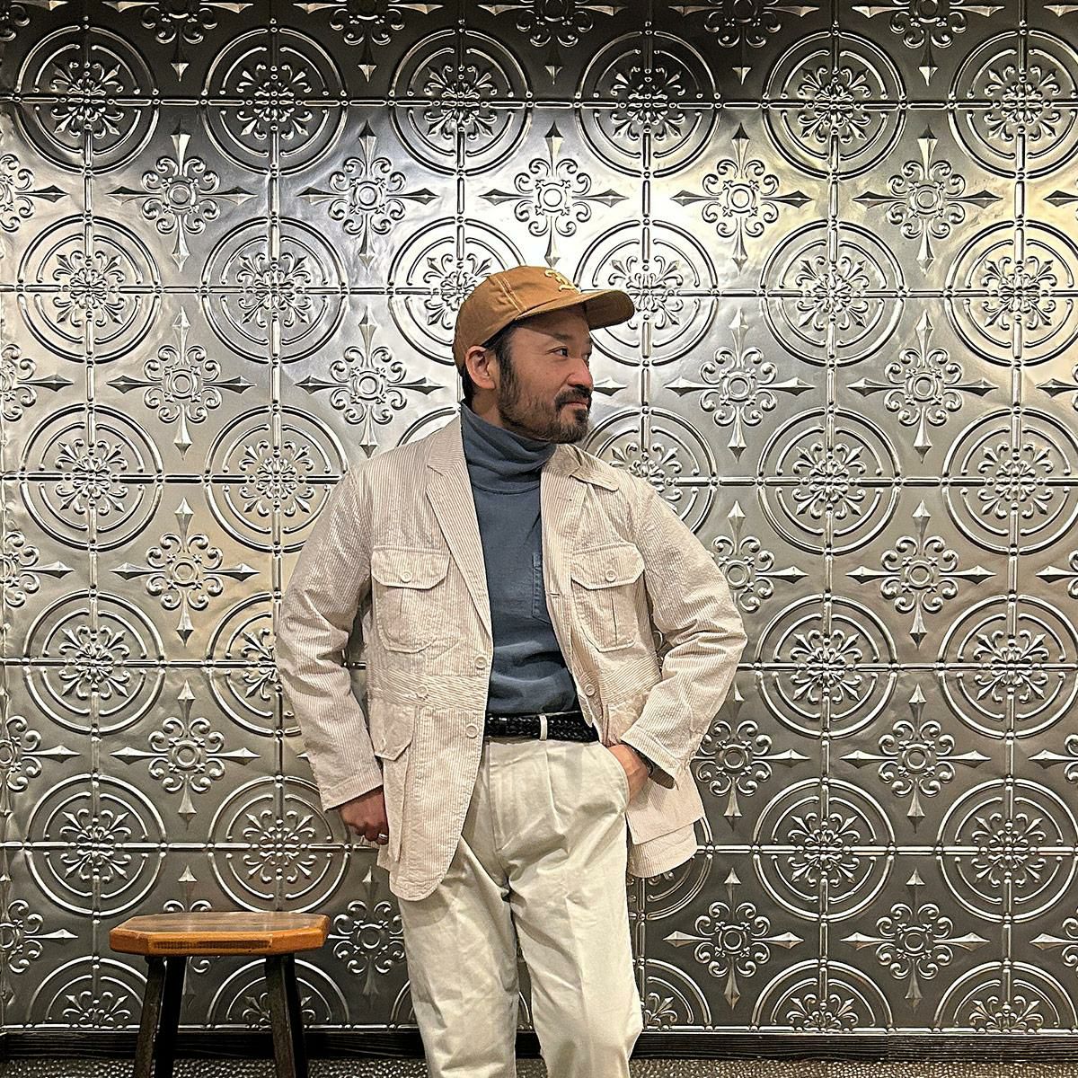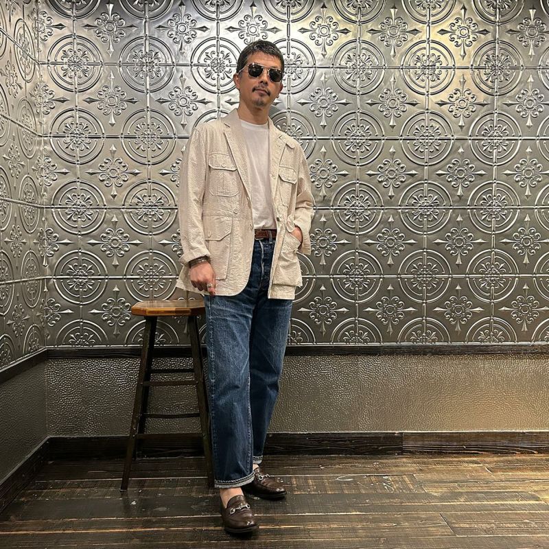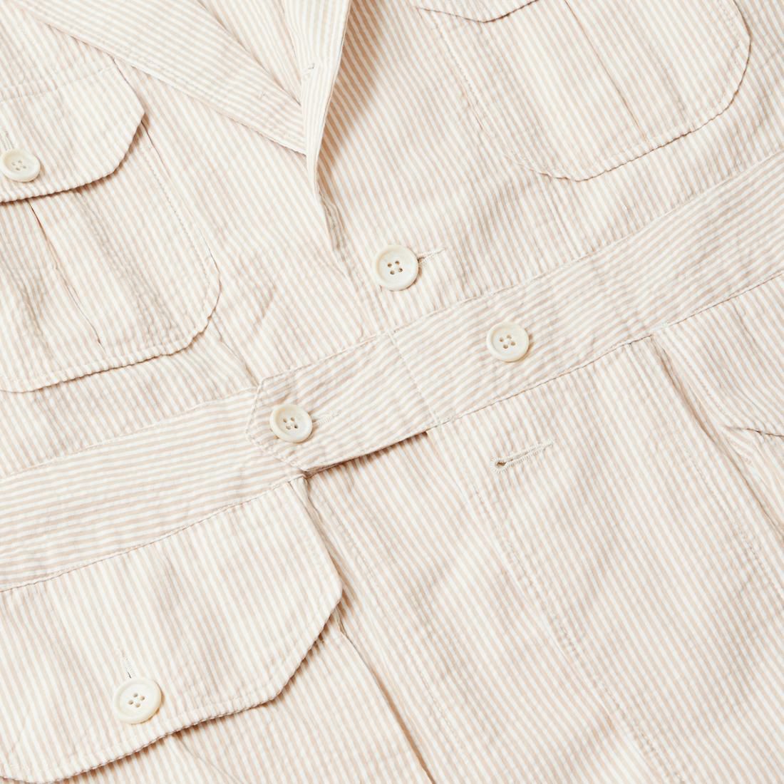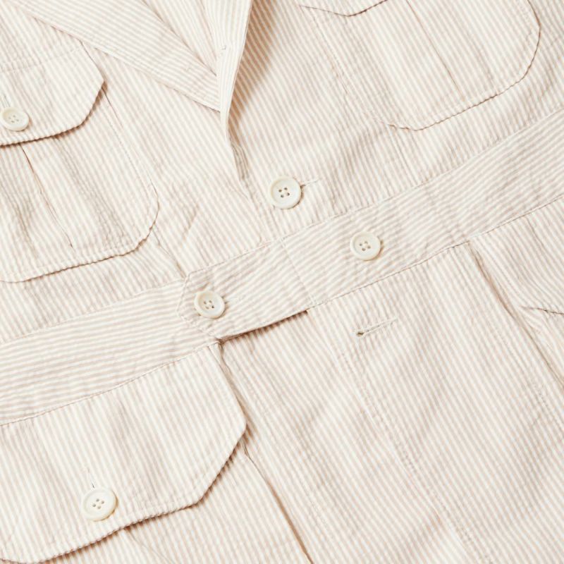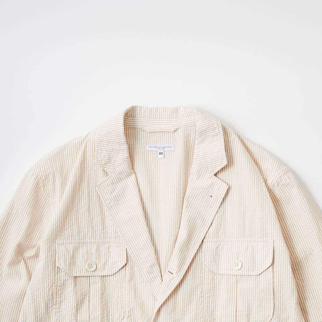 ENGINEERED GARMENTS(エンジニアド ガーメンツ)のFOLK JACKET COTTON SEERSUCKER STRIPE。春夏の定番素材シサッカーを使用したフォークジャケット。襟にはチンストラップを装備。フロントに4つのフラップポケット。ウエストベルトが特徴的なデザイン。シーズンテーマのシティーサファリを体現したようなカントリーディテール。身幅にゆとりのあるリラックスシルエット。生地表面の凹凸が涼清涼感のある夏でも肌触りの良いシアサッカー素材を使用。