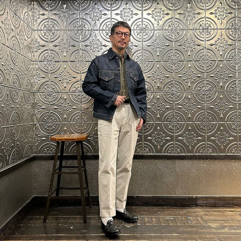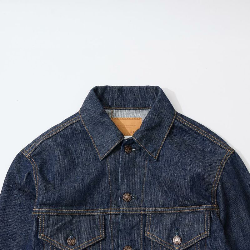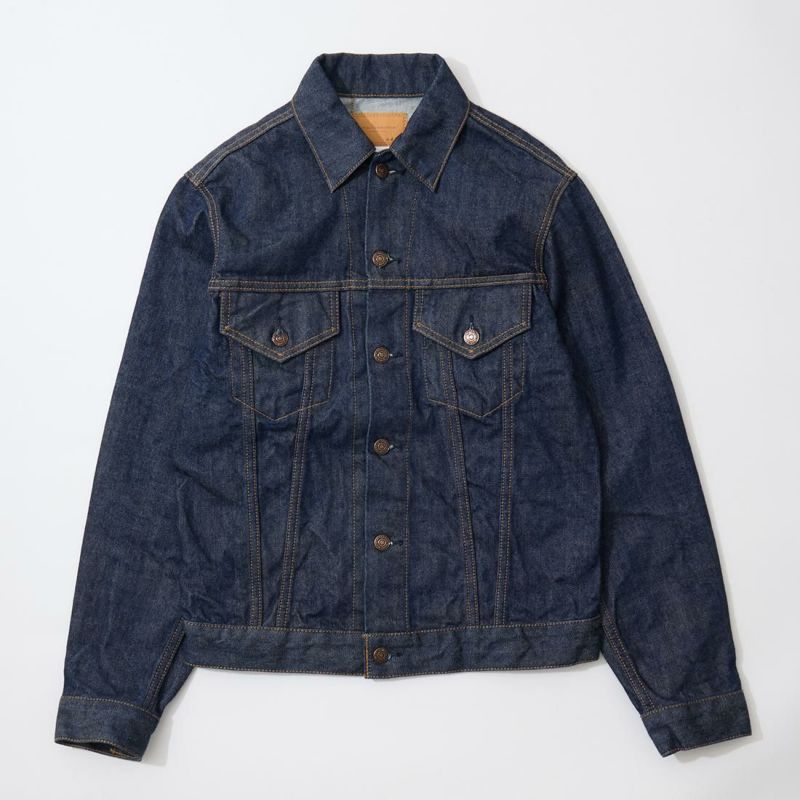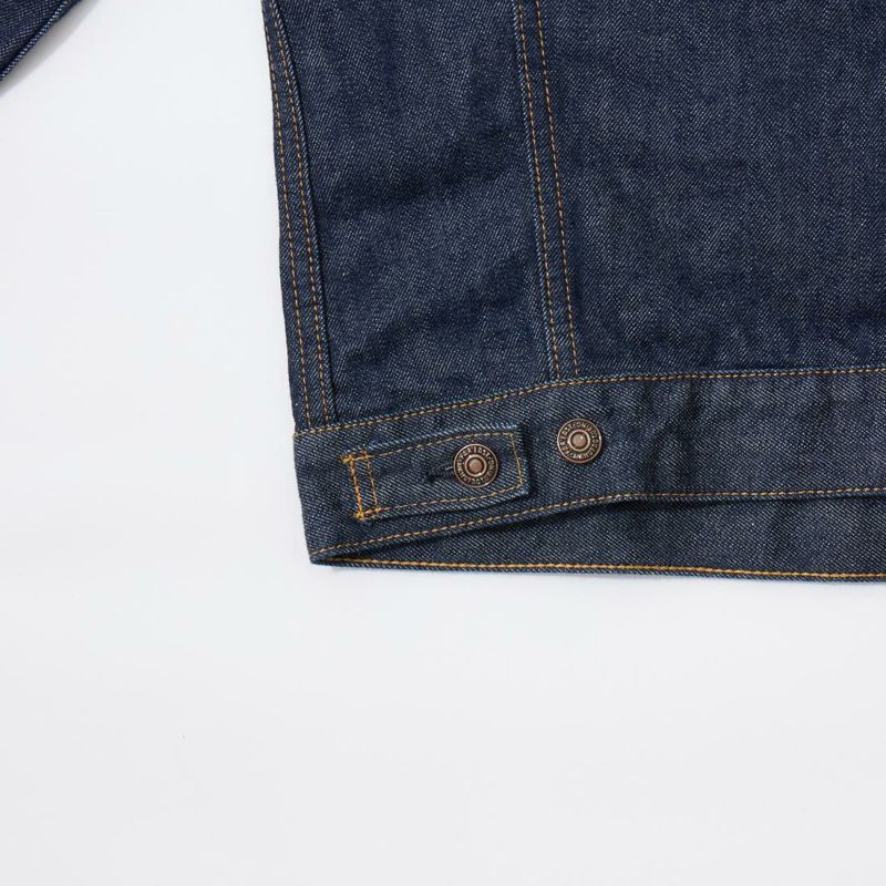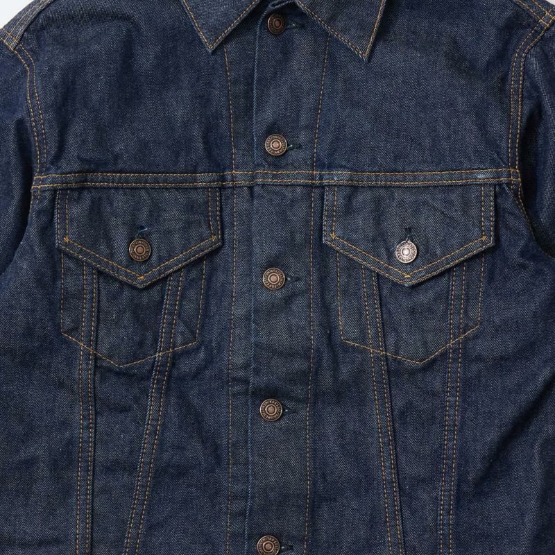 RESOLUTE(リゾルト)のデザイナー林 芳亨氏が監修したFAR EAST MANUFACTURING(ファーイーストマニュファクチャリング)のTRUCKER JACKET。1970年代のリーバイスのデニムジャケット「70505」がデザインソース。ヴィンテージよりも着やすくする為に着丈を長くアレンジ。胸の左右にフラップ付きポケット。後ろの腰部分にはアジャスターを装備。サンフォライズド(防縮加工)のリゾルトの712の生地を使用。