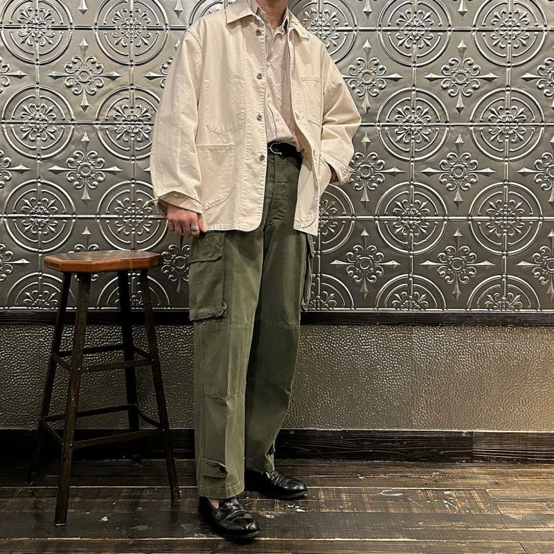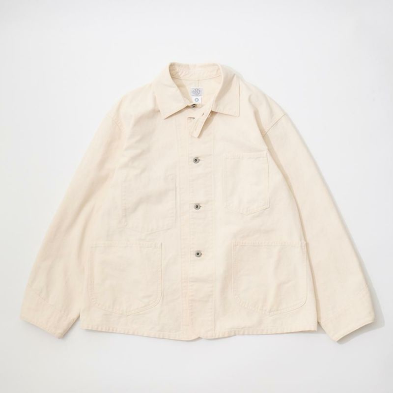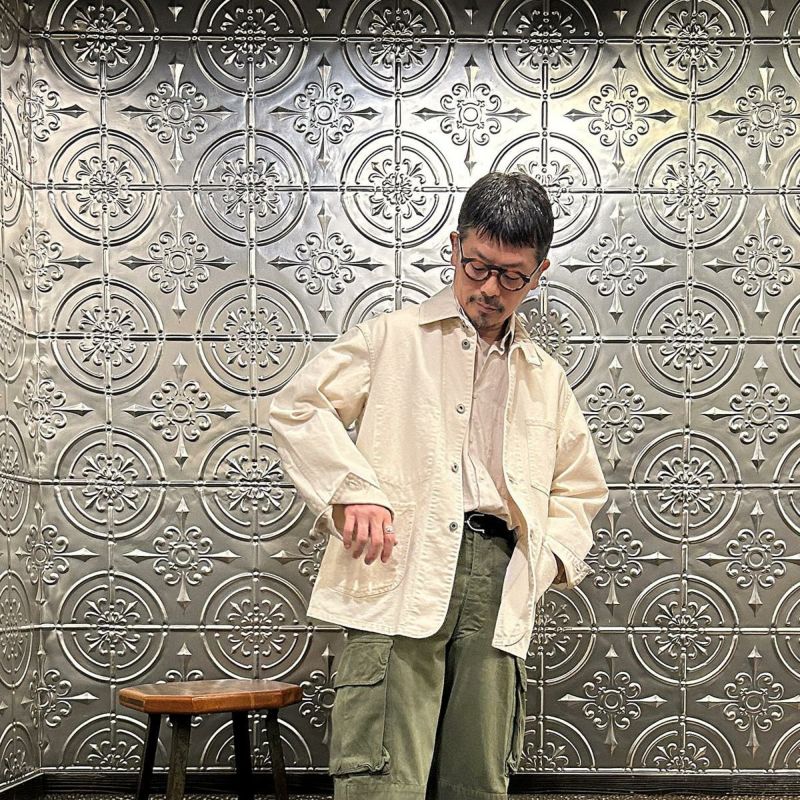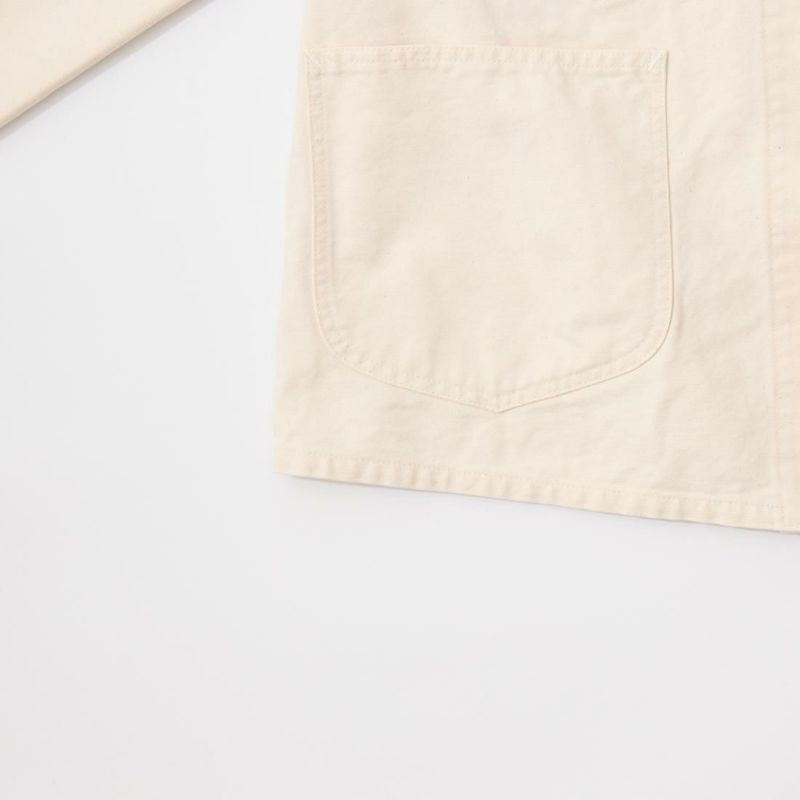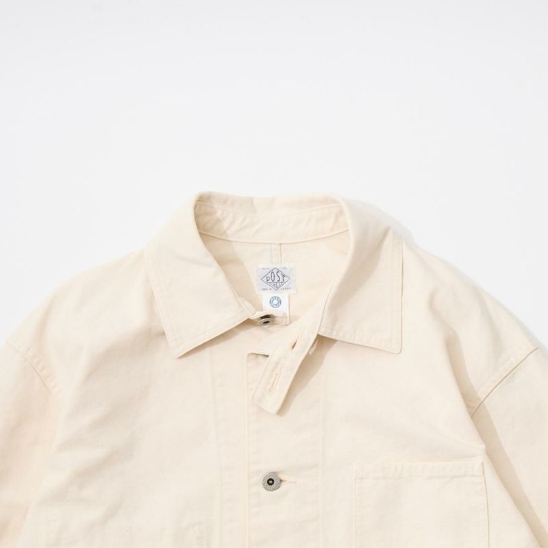 POST OVERALLS(ポストオーバーオールズ)のPOST 46 PIGMENT DYED CANVAS。1930年代の第二次大戦下の簡略化されたカバーオールがデザインソース。首元にはチンストラップ。フロントはシンプルな3つのパッチポケット。右胸には内ポケットを装備。ドーナツボタンを採用。素材はウォッシュ加工が施されたコットンキャンバス。柔らかく着用感も良い仕上がり。