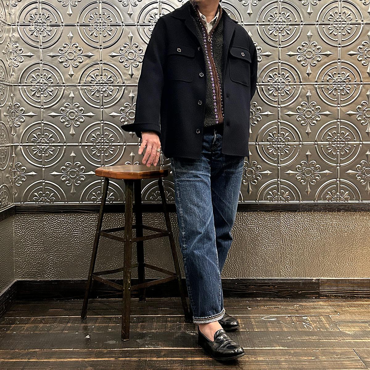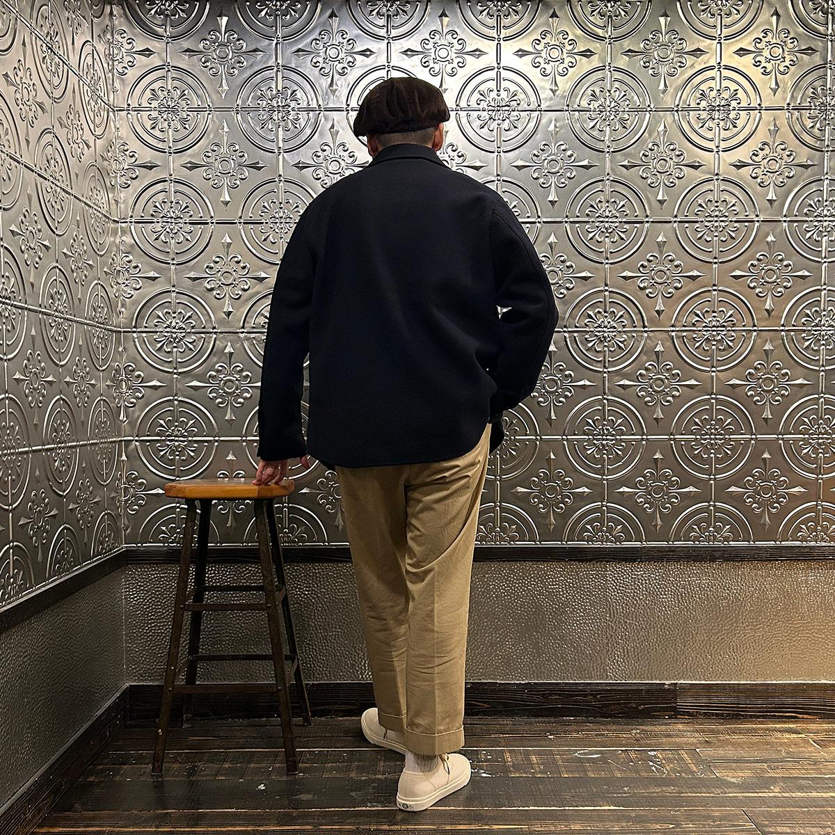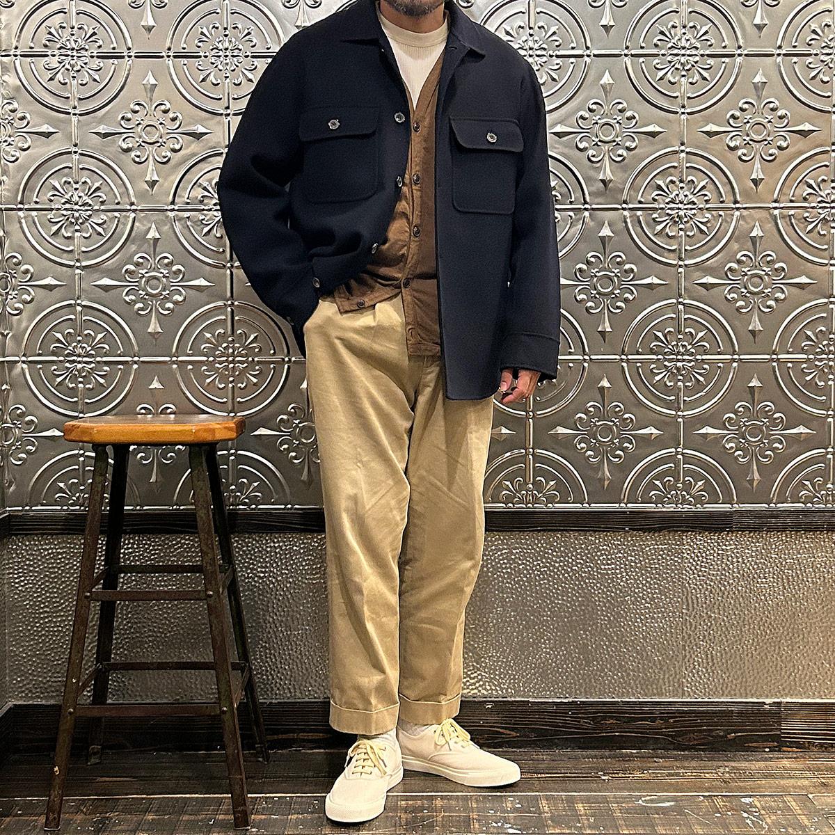 172センチ60キロで「44」で中に少し厚手のものを着込む余裕があるサイズ感。アルティメットコレクション第二弾の「リーファー」を彷彿とさせるウールのダブルフェイスタイプ。手仕事を多用したハンドメイド感あふれる縫製ディテール。一枚仕立てで軽くて柔らかい極上の着心地。CPOシャツジャケットの硬いウールのイメージは全くなく、上質なウールと仕立てによる極上の着心地を約束してくれます。シャツジャケットというカテゴリーからして秋冬の着用率を考えるとかなりコスパに優れた逸品。合わせ易さ、着心地の良さからつい手に取ってしまう、日常的な稼働率がかなり高くなると予想できちゃいますね。女性が少し大きめサイズで着るのもオススメです!