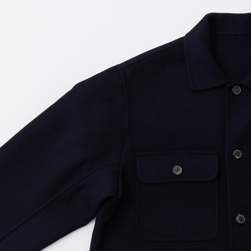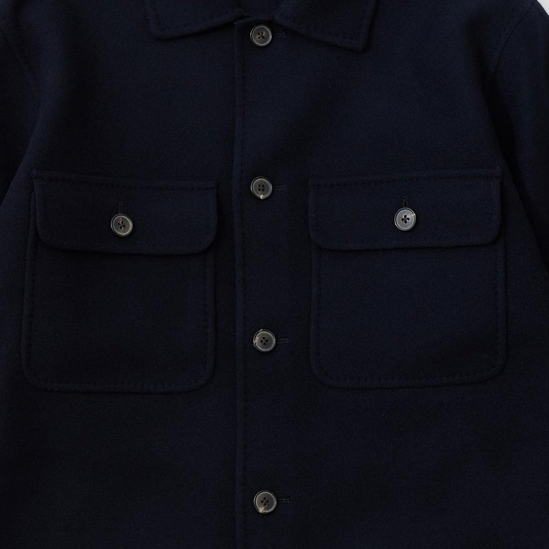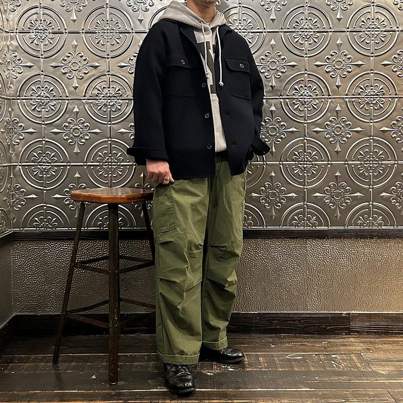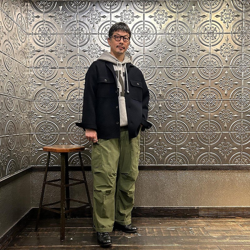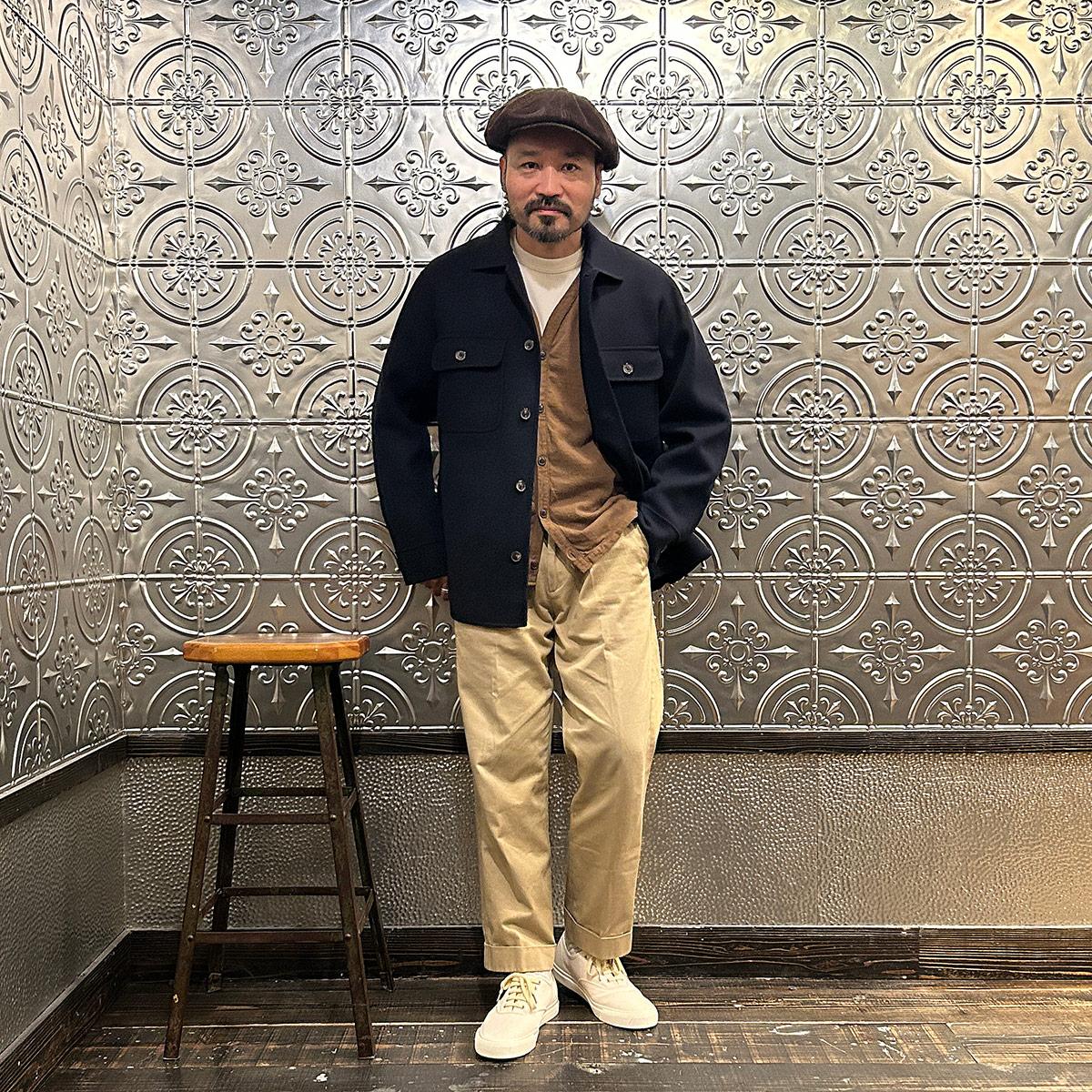 172センチ60キロで「44」で中に少し厚手のものを着込む余裕があるサイズ感。アルティメットコレクション第二弾の「リーファー」を彷彿とさせるウールのダブルフェイスタイプ。手仕事を多用したハンドメイド感あふれる縫製ディテール。一枚仕立てで軽くて柔らかい極上の着心地。CPOシャツジャケットの硬いウールのイメージは全くなく、上質なウールと仕立てによる極上の着心地を約束してくれます。シャツジャケットというカテゴリーからして秋冬の着用率を考えるとかなりコスパに優れた逸品。合わせ易さ、着心地の良さからつい手に取ってしまう、日常的な稼働率がかなり高くなると予想できちゃいますね。女性が少し大きめサイズで着るのもオススメです!