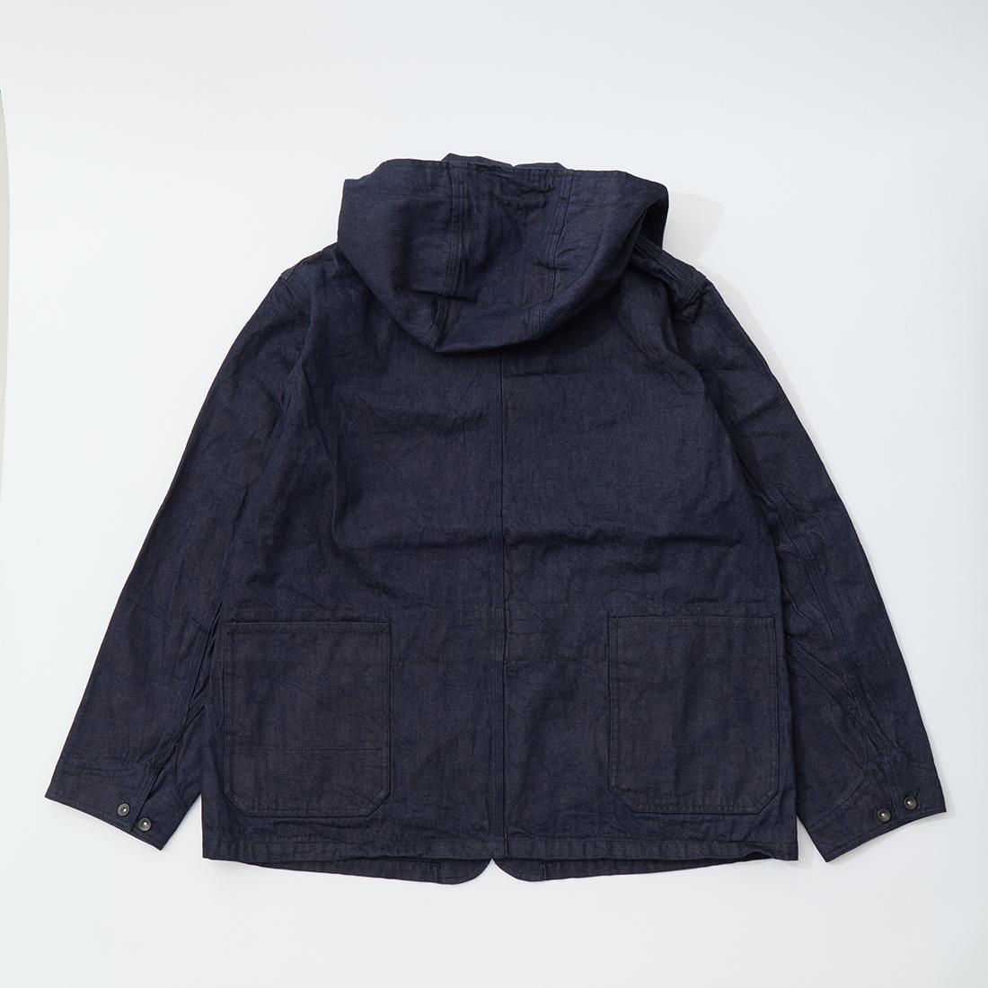 MODMNT(モドメント)のCOVERALL JACKET。10ozのムラ糸デニムを使用したカバーオールジャケット。取り外し可能なデタッチャブルフード。首元にチンストラップ。前身頃と後見頃に配置された多数のポケット。前立てはボタンフロントでドーナツボタンを使用。素材は染めは広島・福山、織りと仕上げは岡山・井原で行われた日本製デニムを使用。