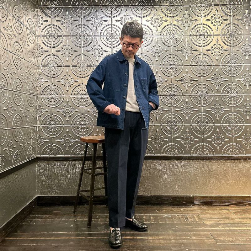 POST OVERALLS (ポストオーバーオールズ) のPOST CHINOIS TRAVAIL 2 VINTAGE INDIGO CANVAS。ウォッシュ加工が施されたコットンキャンバス生地を使用したポストシノワトラベール。ビンテージのフレンチワークジャケットとフレンチチャイナのワークジャケットのティテールを取り入れたカバーオール。ラウンドカラー、低めの第一ボタンが特徴的。3つのパッチポケットが配置されたシンプルなデザイン。インディゴ染めのコットンキャンバス生地の経年変化も楽しみ。3シーズン活躍してくれる1着。