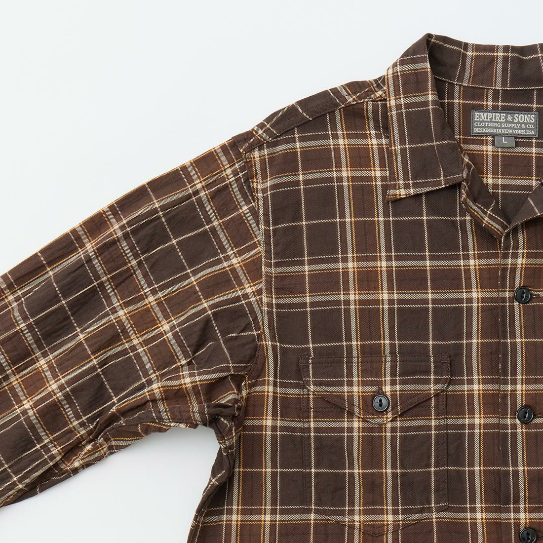 他の画像を見る ワークシャツジャケット コットンツイルチェック 日本製 EMPIRE & SONS (エンパイア アンド サンズ) WORK SHIRT JACKET COTTON TWILL CHECK - DK BROWN NATURAL YELLOW 販売価格 ¥ 19,800 税込 お気に入りに登録する