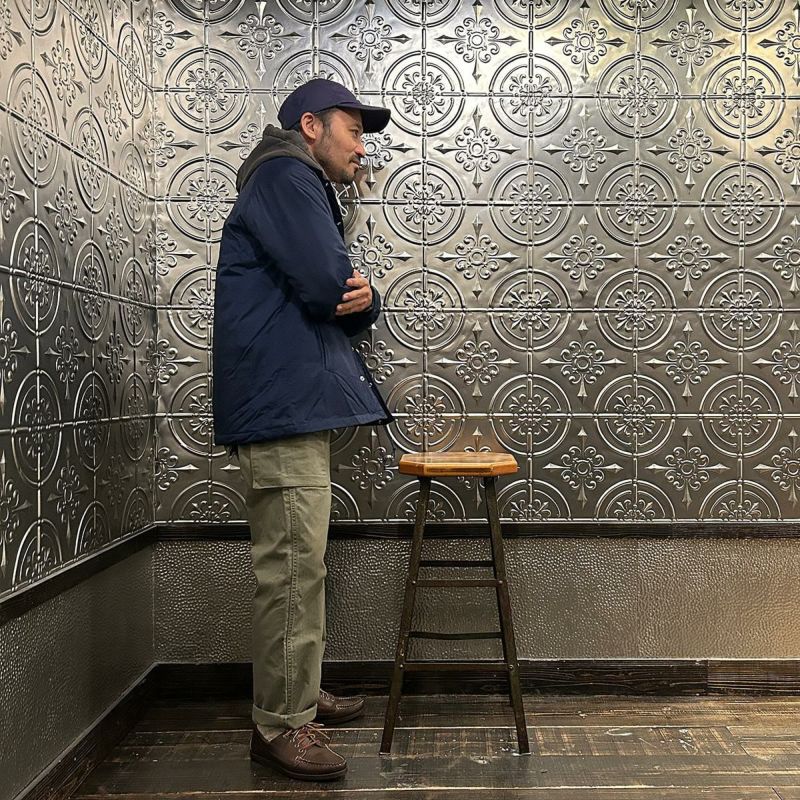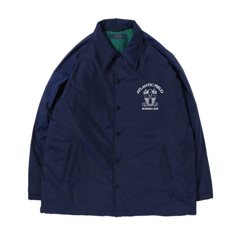 D.C. WHITE(ディーシーホワイト)のIVY COACH DOWN JACKET。1960年代のアイビーリーグ大学生協ストアで販売されていたプロダクトを現代的に解釈したコレクション「ATLANTIC FIELD BY D.C.WHITE」。ナイロンフェイスのダウン入りコーチジャケット。クラシックスポーツテイストの大きめの襟。前立ては開閉しやすいスナップボタン仕様。袖口にもスナップボタンを施すことで風の侵入を防ぎつつ丸みのあるシルエットも楽しめます。左胸の刺繍はアメリカのヴィンテージスウェットシャツのプリントを参考に作られたオリジナルデザイン。中綿はダウン80%フェザー20%。保温性が高く冬まで着れるコーチジャケット。