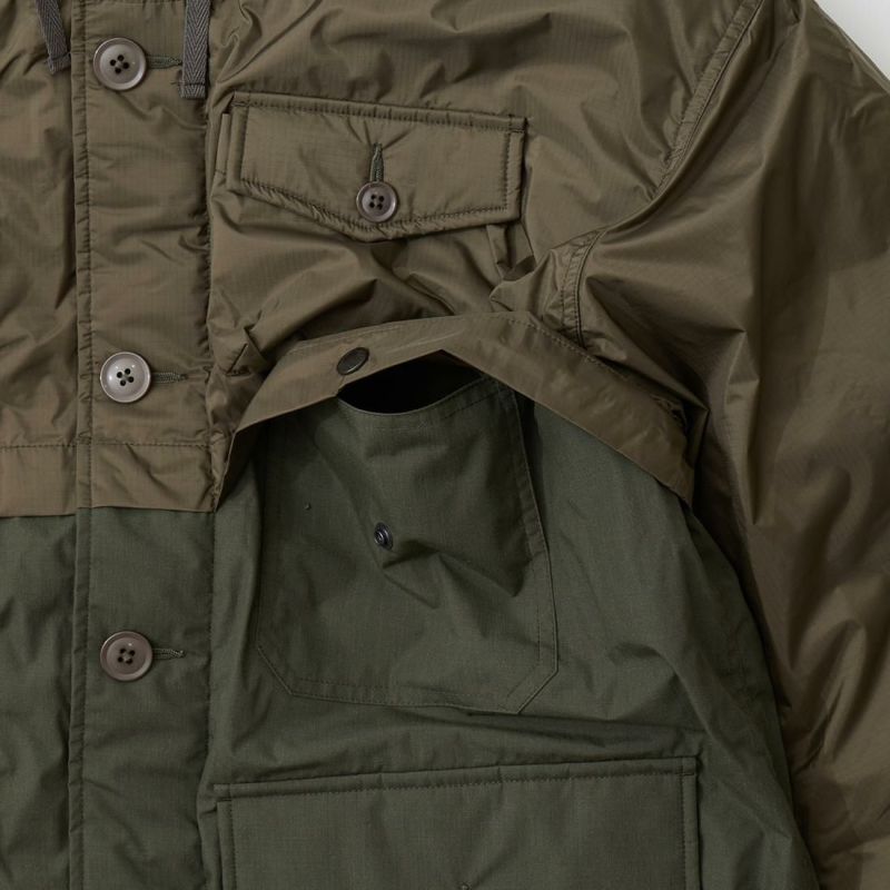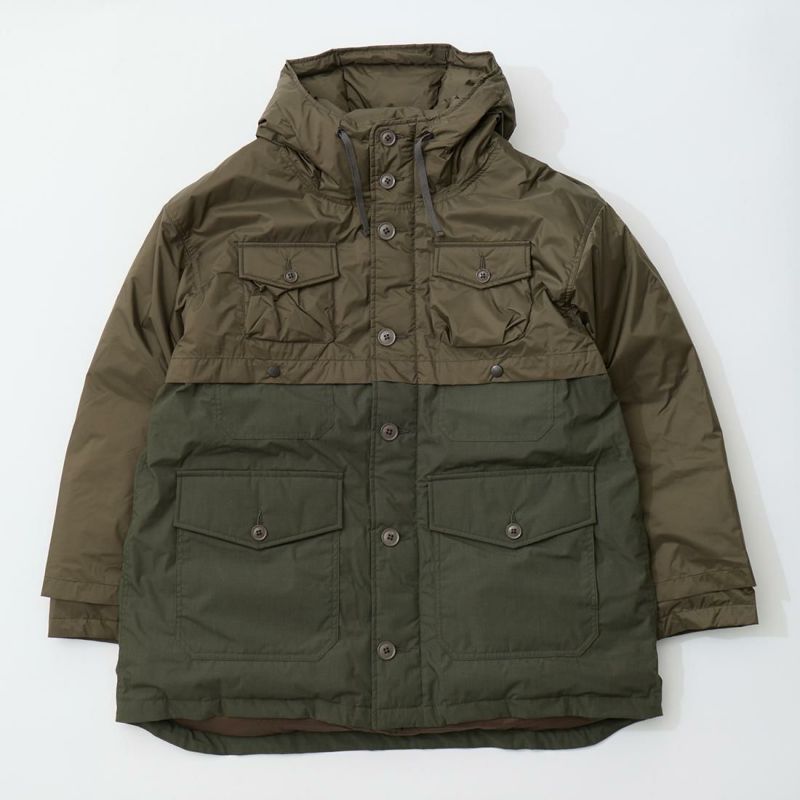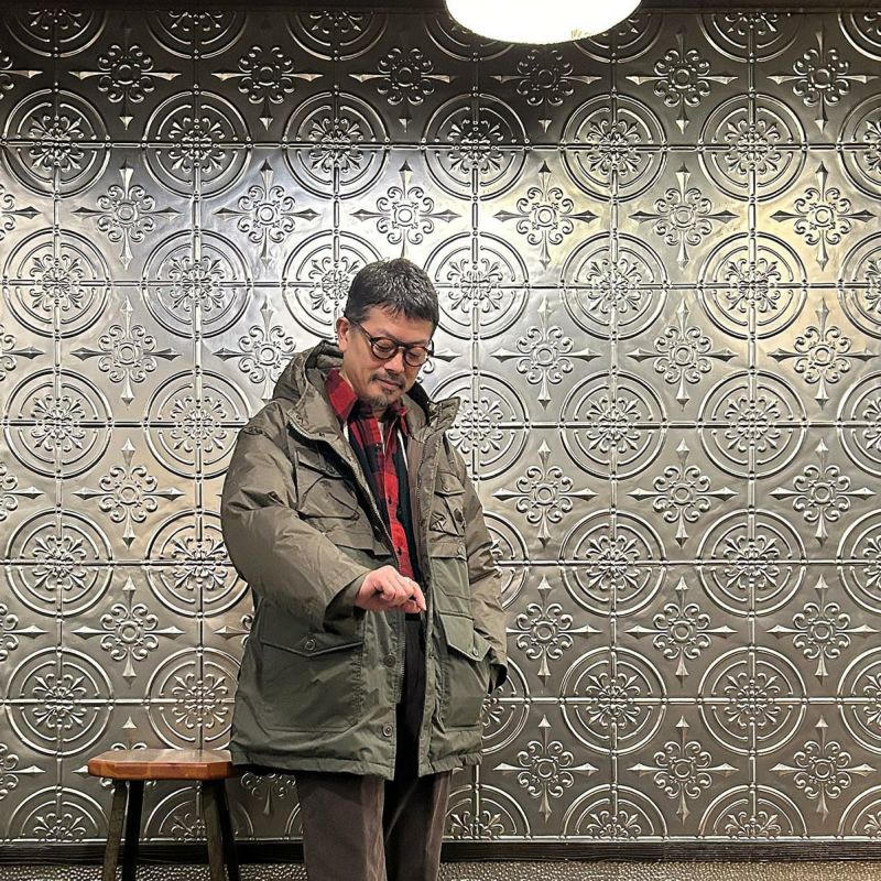 MODMNT(モドメント)のSUPER MACKINAW。フィルソンのダブルマッキーノクルーザージャケットがデザインソースのダウンジャケット。フロントに4つの大小のフラップ付きのパッチポケット。バックにも2つのパッチポケット。前立てはジップとボタンの2重構造。肩、胸、背中、腕にかけては2枚仕立ての仕様。袖口はスナップボタンでサイズの調節が可能。表地は防水透湿素材「AURORA-TEX?」と難燃素材「HINOC」を組み合わせたハイブリッド構造。ダウンはスペイン産ホワイトダウン(国内洗浄)を150g封入し、ダウン90%・フェザー10%(760FP)で高い保温性を確保。デザイン性と実用性が両立した完成度の高い1着。