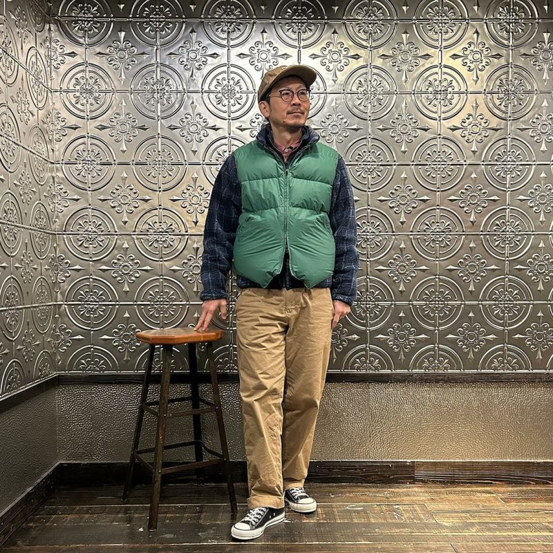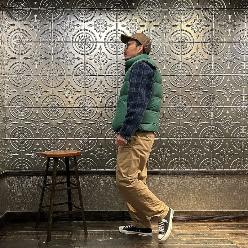 170センチ68キロやや肩幅広めの私の体型でLサイズで個人的には丁度良いサイズ感です。インナーに地厚めのスウェット、ジャケットの上に羽織っても身幅は若干ゆとりのある着用感です。個人的に大好きなノースバイノースウェストのダウンベスト。軽くて着易さ抜群。それでいて防寒性に優れた1着。それにインナーダウンベストとしても着回しできるとあって、なにかと持っていて損はしない便利なアイテム。それこそスタイリングを選ばないほど使い勝手の良いアイテムですから、ついつい色違いで欲しくなってしまいますね。
