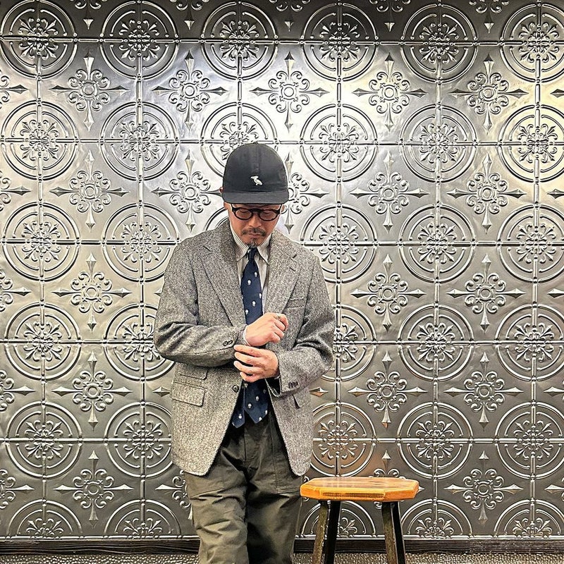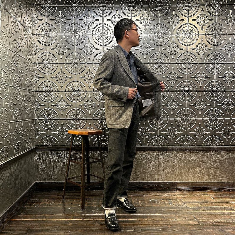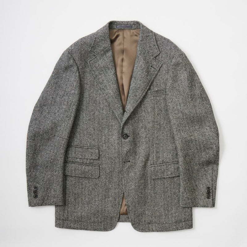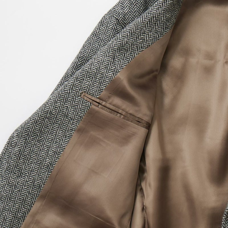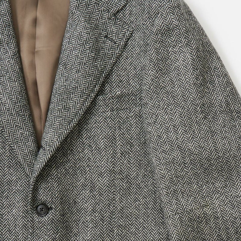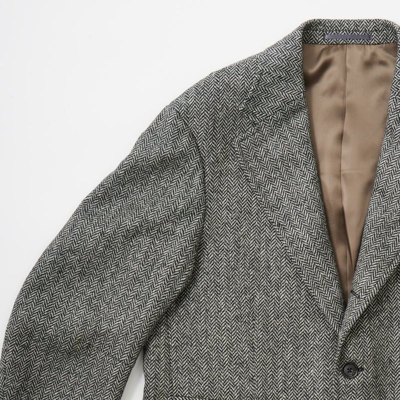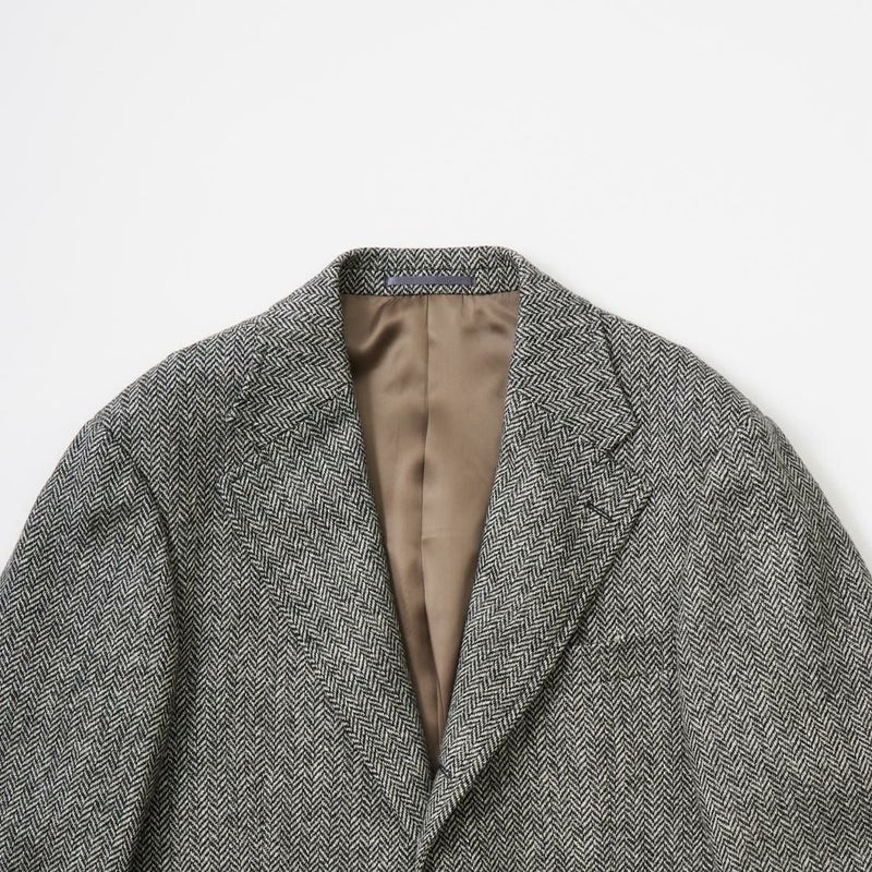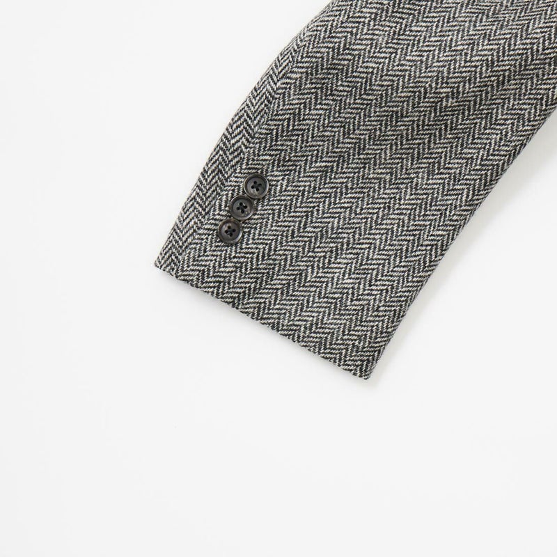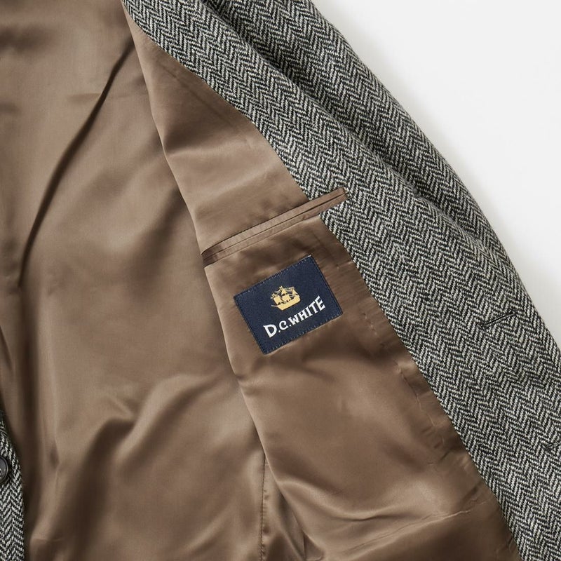 国内ブランド「D.C. WHITE」(ディーシーホワイト)のHACKING JACKET HERRINGBONE。英国乗馬の歴史と共に発達したスポーツディティールのツイードジャケット「ハッキングジャケット」がデザインソース。肩から肩甲骨に向かう部分、肘内側部分にはダーツを施し、シルエット以上にスポーツジャケットとしての広い可動域を確保。斜めになったスラントポケット仕様、チェンジポケット付きの英国ディテール。なだらかなラインを強調するラペルのロールやナチュラルなショルダーライン、質の高い仕立てをほのめかす首元に吸い付くような襟づくり、きつすぎないウエストシェイプなどD.C. WHITE(ディーシーホワイト)の拘りが詰まった完成度の高いジャケット。素材には180年以上の歴史を持つ英国 アブラハム・ムーン社のツイードクロスを使用。軽量かつ、綺麗な発色と柄が特徴。