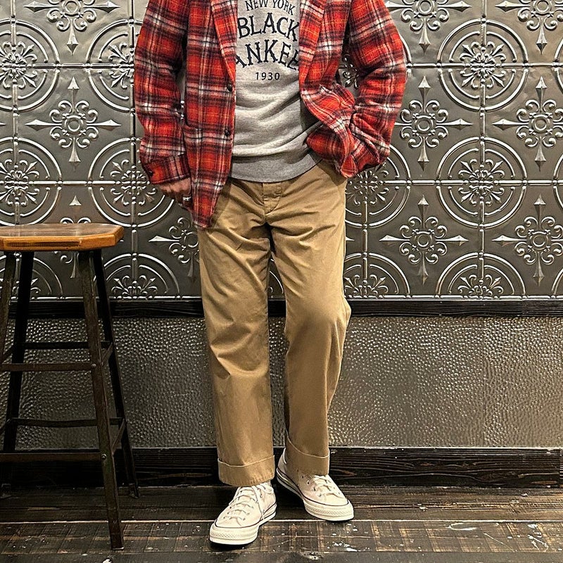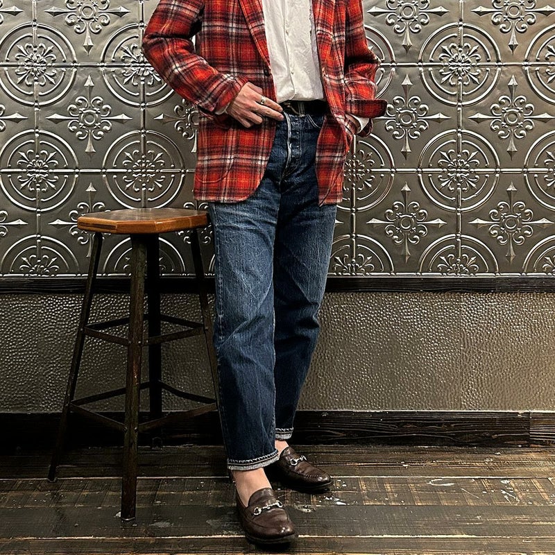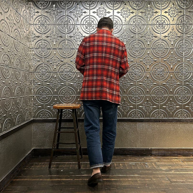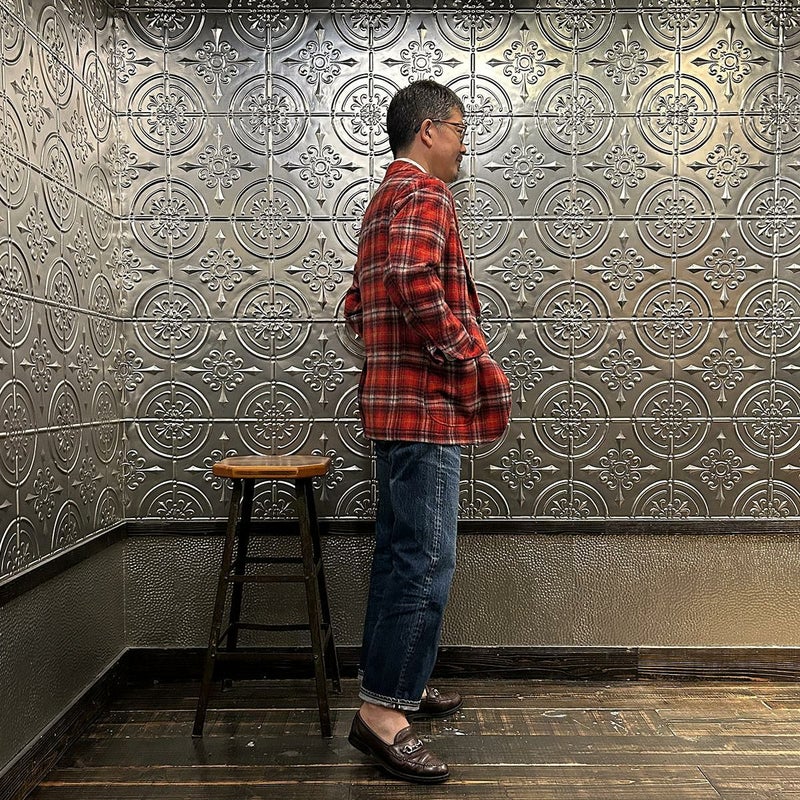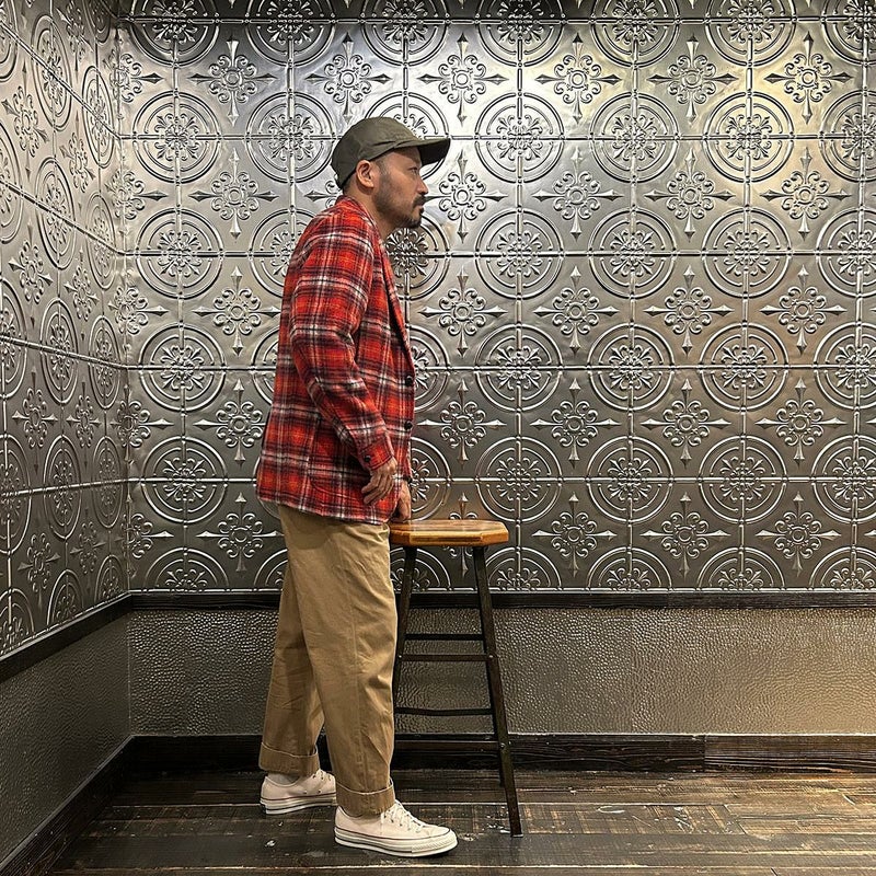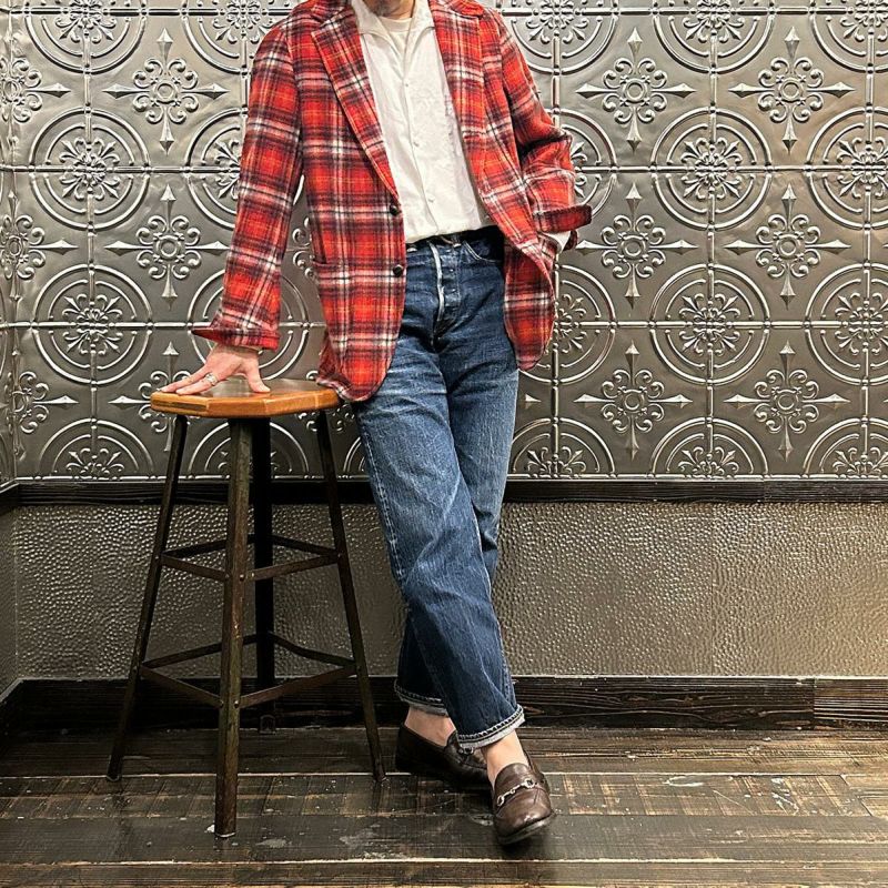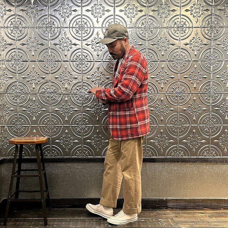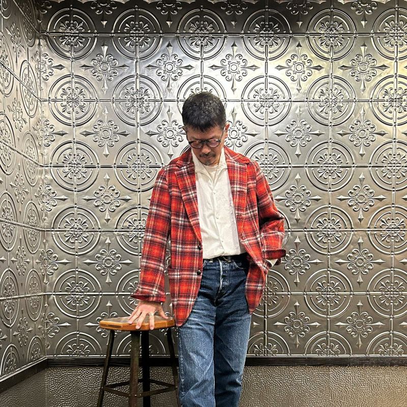 172センチ60キロで「44」で丁度良いサイズです。冬の着用を見越したサイズ感。中にそれなりに着込める余裕があります。レザーのくるみボタンと袖口のカフ仕様。アメリカのペンドルトンを彷彿とさせるディテール。アメリカンクラシックなワークなディテールをディーシーホワイトのテーラーリングで編集したジャケット。生地もアメリカンなざっくりコットンフランネルではなく、柔らかくドレープ感もキレイなウールナイロンアルパカの混紡。シャギー感が柄の出方を柔らかい印象に。シャツを合わせてきちんと着るのも良いですが、古着のTシャツやスウェットなどに合わせてラフに着るのがオススメ。ブランドの編集力が光る一枚ですねっ。
