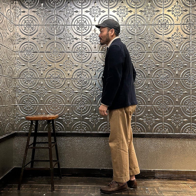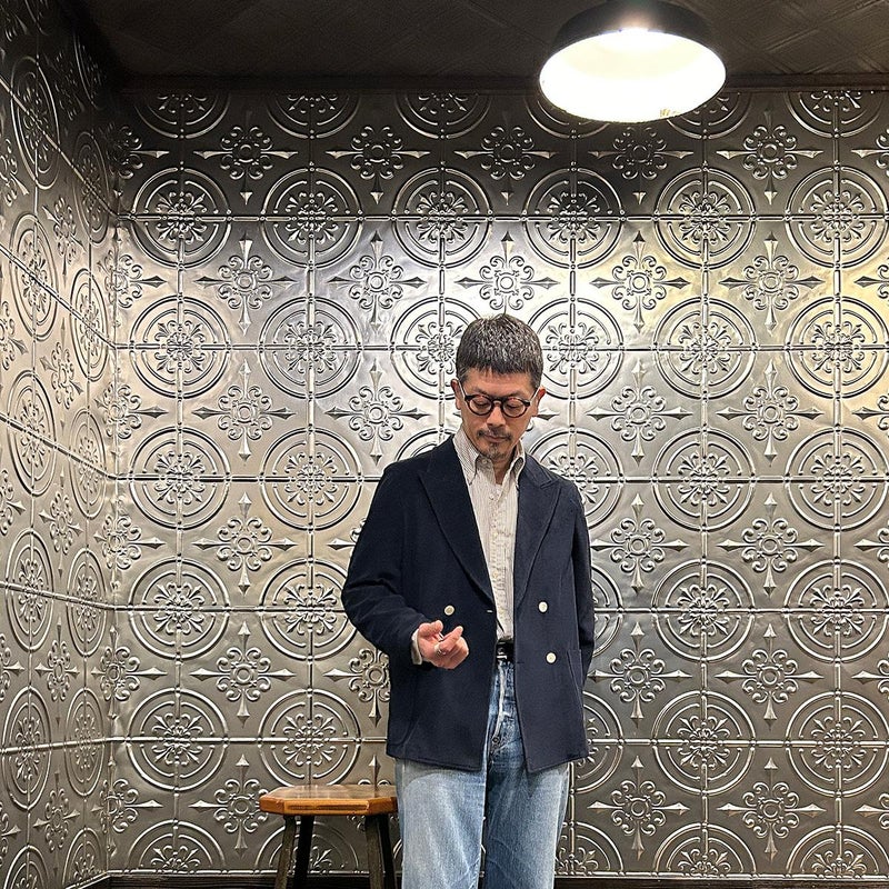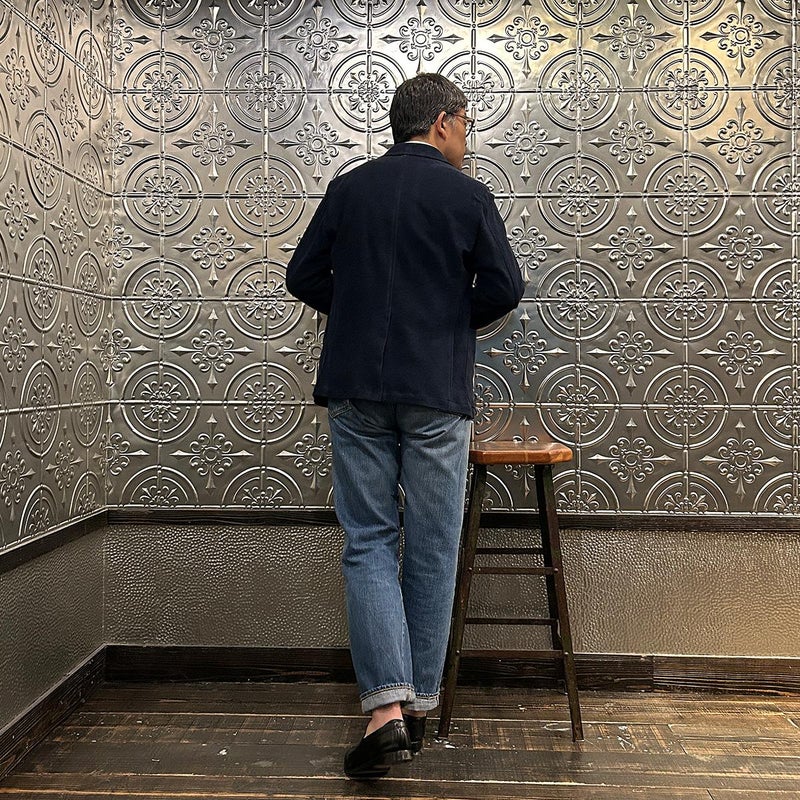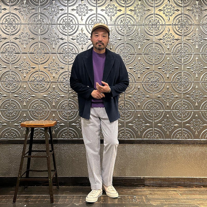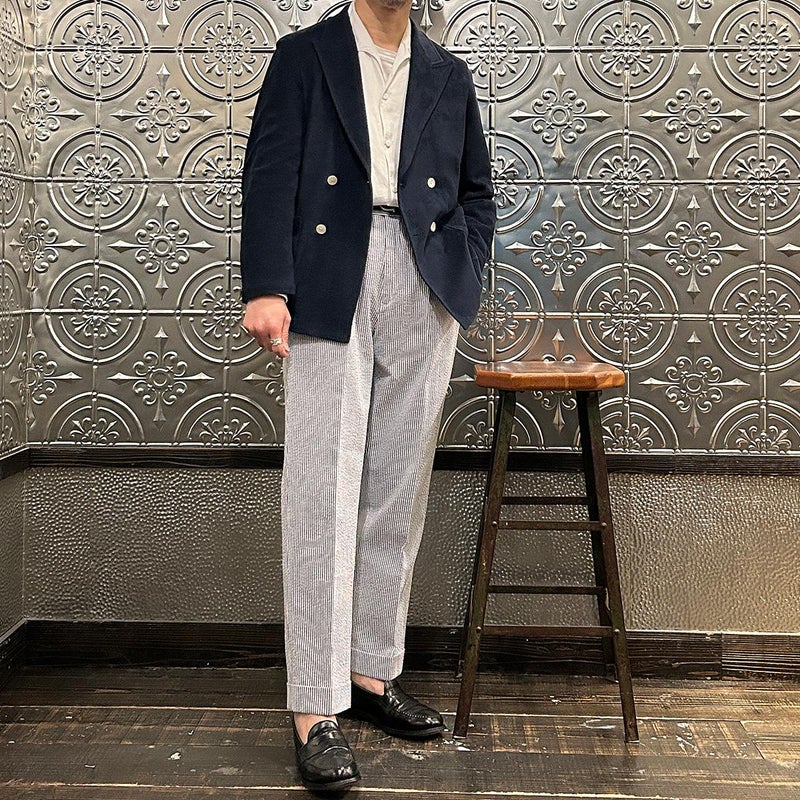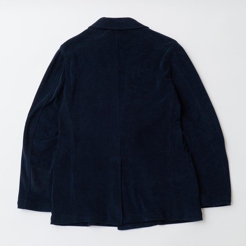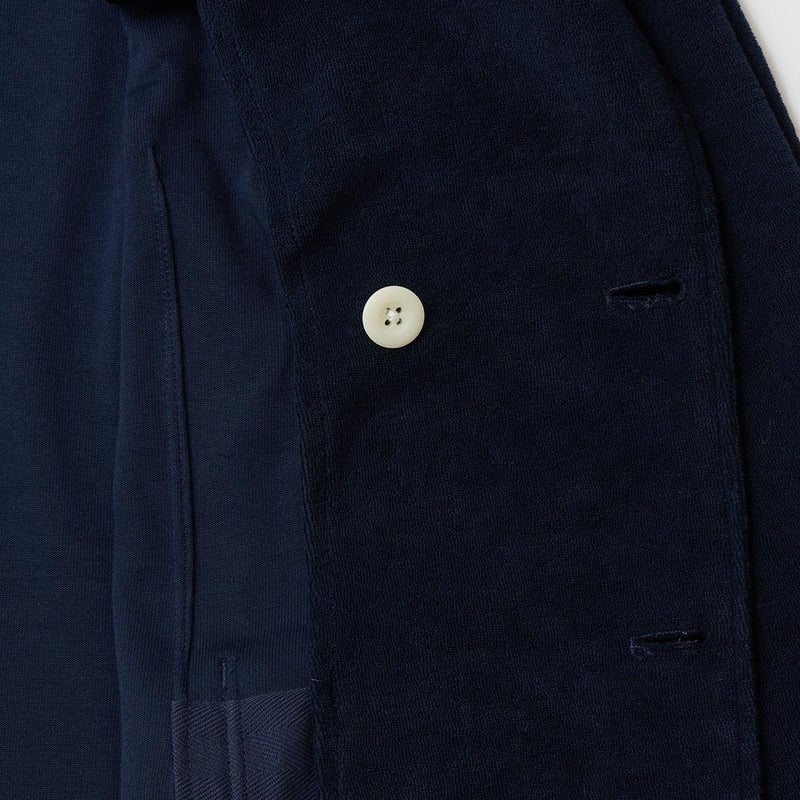 国内ブランドD.C. WHITE(ディーシーホワイト)のNEWPORT JACKET。85%コットン、15%ポリエステルのパイル素材を使用した4つボタンのダブルブレストジャケット。なだらかなカーブを描くナチュラルショルダー。胸ポケットはなし。腰は左右にパッチポケットを配置。バックはセンターベンツ。スペインのSIDOGRAS社のパイル生地を採用。カーディガン感覚で気軽に羽織れるジャケット。