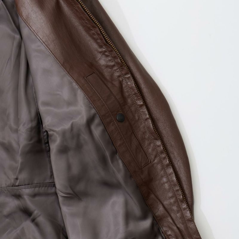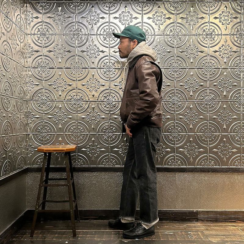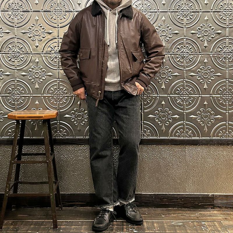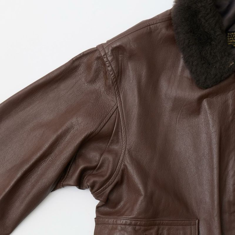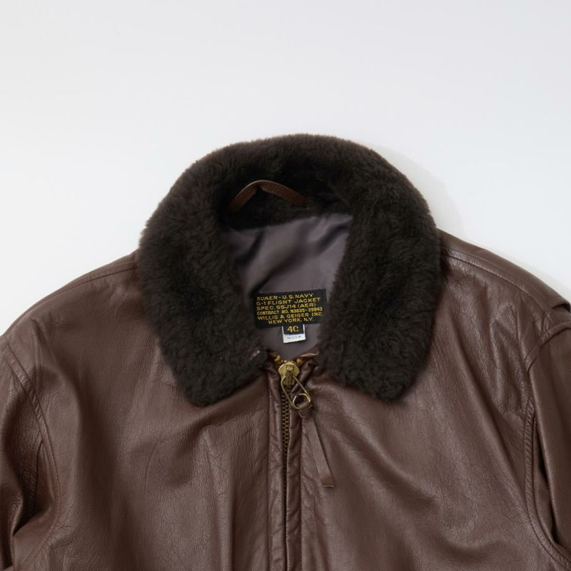 大戦時の革飛行服納入メーカーとして知られたWIILIS&GEIGER(ウィリスアンドガイガー)のG-1 LEATHER JACKET。海軍航空隊に1951年から採用されたG-1。摂氏-10~10度のインターミディエイトゾーンのフライトジャケット。ボア付きの襟。襟裏にはチンストラップ。前立てはジップフロント。両脇下には通気性を確保するためのツインアイレット。背面には機動性を高めるアクションプリーツ。腰上の左右にフラップポケットを装備。