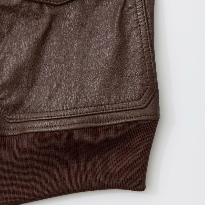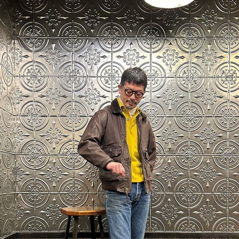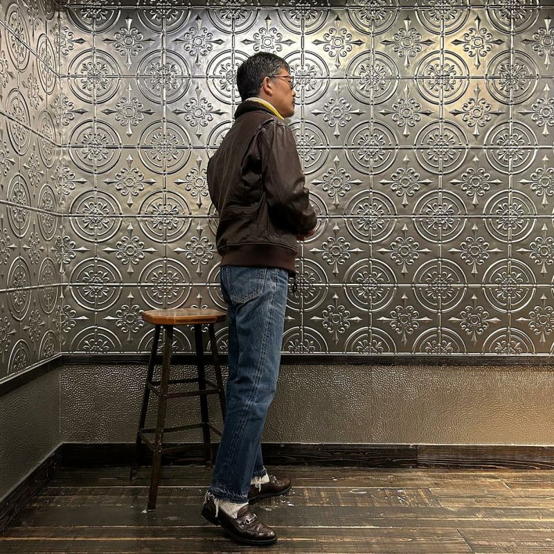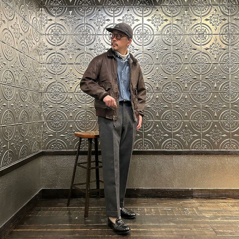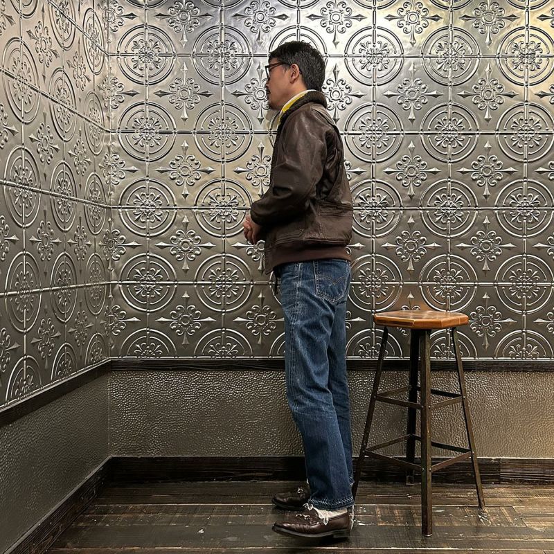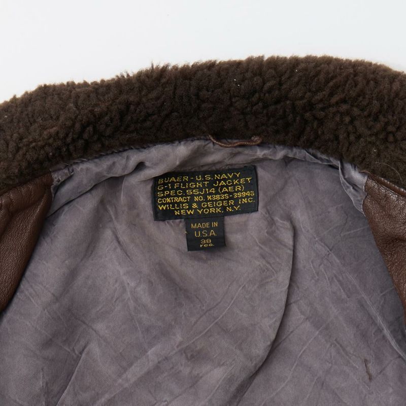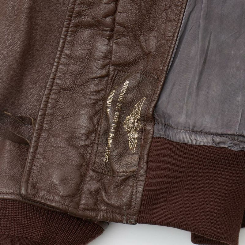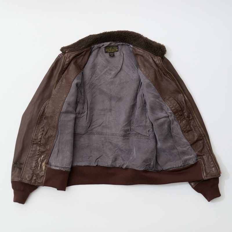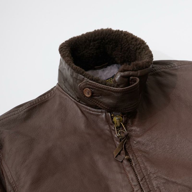 大戦時の革飛行服納入メーカーとして知られたWIILIS&GEIGER(ウィリスアンドガイガー)のG-1 LEATHER JACKET。海軍航空隊に1951年から採用されたG-1。摂氏-10~10度のインターミディエイトゾーンのフライトジャケット。ボア付きの襟。襟裏にはチンストラップ。前立てはジップフロント。両脇下には通気性を確保するためのツインアイレット。背面には機動性を高めるアクションプリーツ。腰上の左右にフラップポケットを装備。