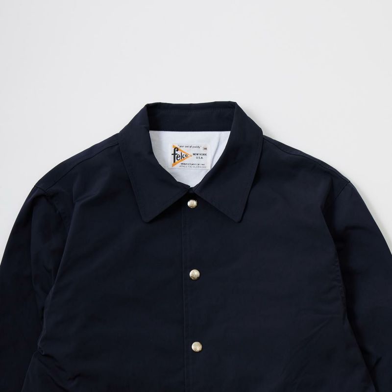 FELCO(フェルコ)のSET IN SLEEVE COACH JACKET SNAP BUTTON FRONT W/FLANNEL LINING CLASSIC FIT。撥水性を持つウォータープルーフナイロンを使用したスナップフロントのコーチジャケット。襟は大きめで風防のチンストラップが付属。ポケットはフロントに2つと、内ポケット2つ、そして背面右側にはデザインとしてもポイントになるポケットを配置。裏地にはコットンフランネルのライニングが付き、袖口はスナップでサイズ調整が可能なゴム仕様。こちらは従来のモデルよりも全体的にゆとりを持たせたクラシックフィット。ストレスのない着用感で重ね着もし易いコーチジャケットに仕上がっています。