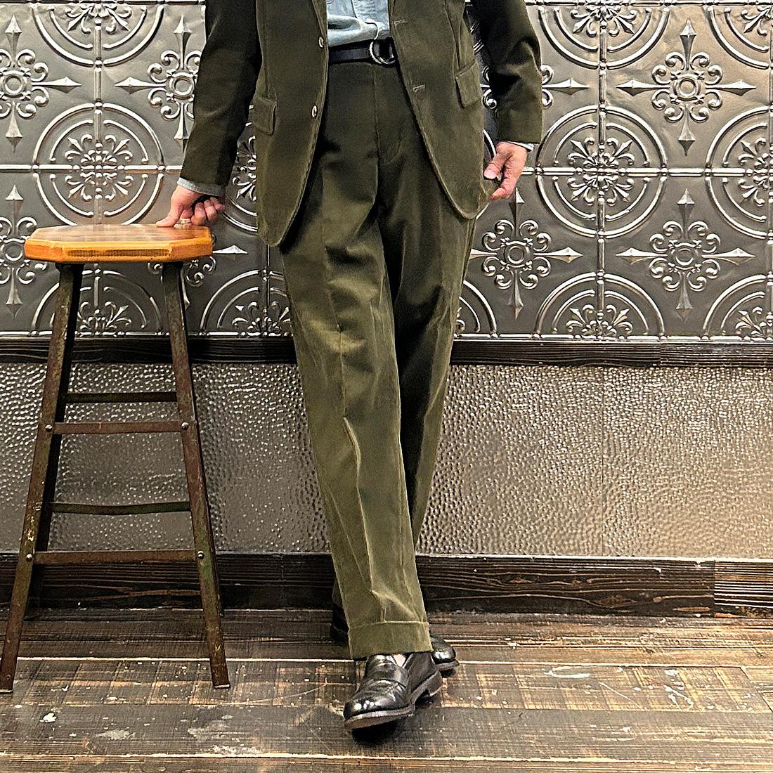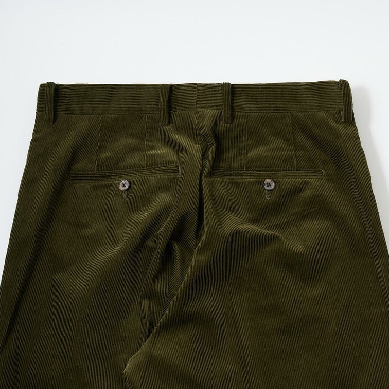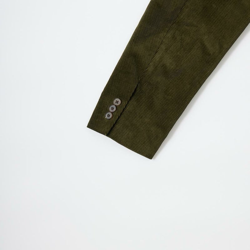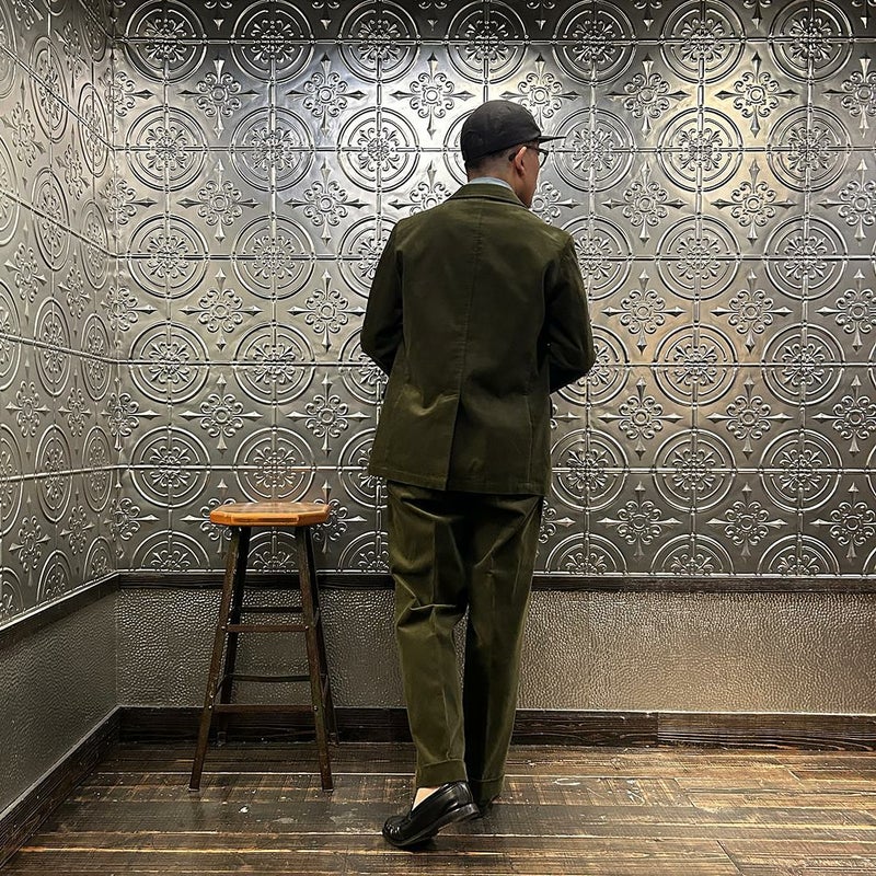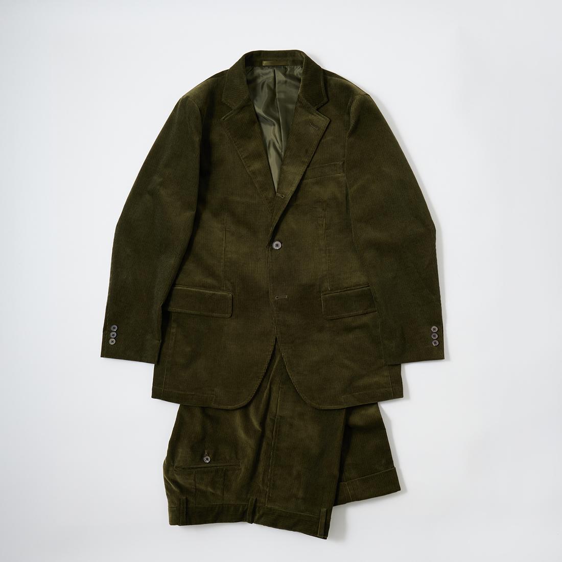国内ブランドD.C. WHITE(ディーシーホワイト)のBOSTON CORDUROY SUITS。アメリカントラッドの源流から現在に至るまで、その変遷を理解しつつ現代的なコーデュロイスーツへと昇華させたBOSTON。日本の老舗クロージング工場で縫製。立体的なパターンによる成型、前肩に回った袖付け、裁腹のパーツを活かした前身の立体感など、細部にまで感じるこだわり。特筆すべきは肩から首回りにかけ吸い付くようにカーブを描く立ちの良い襟。これにより腕、胸回りの着用時の快適さと品格ある佇まいを両立。シルエットは1980年代後半の日本のアメリカンカジュアルをイメージ。ボトムにわずかなゆとりを持たせ、ジャケットは襟ののぼりからナチュラルショルダーへと繋がるAラインシルエット。イタリアの名門"DUCA VISCONTI"が誇る12ウェールのコーデュロイを採用。繊細な畝と美しい仕上がり、そして何よりも絶妙な色彩で目を引く素材です。