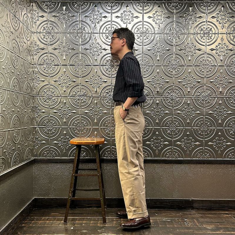 170センチ68キロの私の体型で通常31~32インチのサイズを穿きます。こちらのサイズ選びは32で丁度良い着用感です。このサイズであればシャツをインしたり、それこそTシャツをインして合わせたりしてもストレスなく穿けます。生地は真夏の時期でも穿き易い軽くて薄いサラッとした穿き心地の良い生地感。それにこの太すぎないシルエット。良い雰囲気ですね。全ての工程がアメリカ生産でこのプライス。間違いなく希少価値といえますね。様々なスタイリングで楽しめる使い勝手の良い1本。とにかくオススメです。