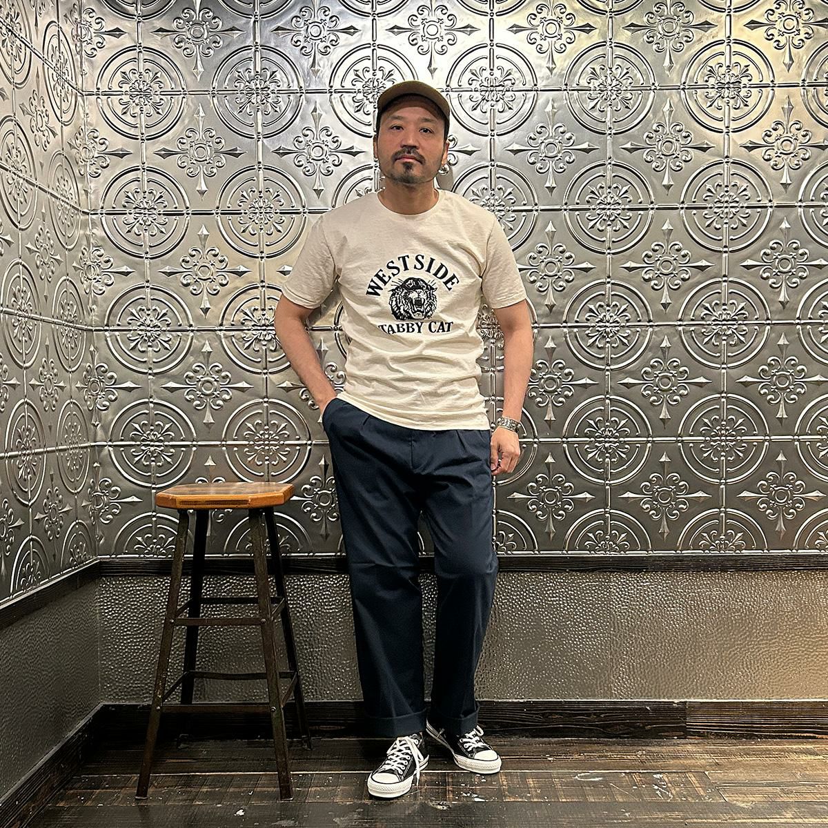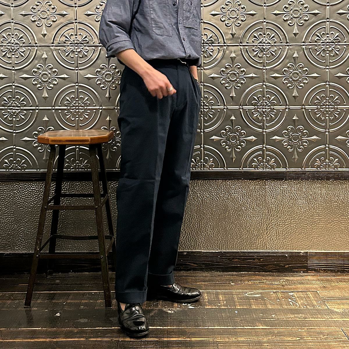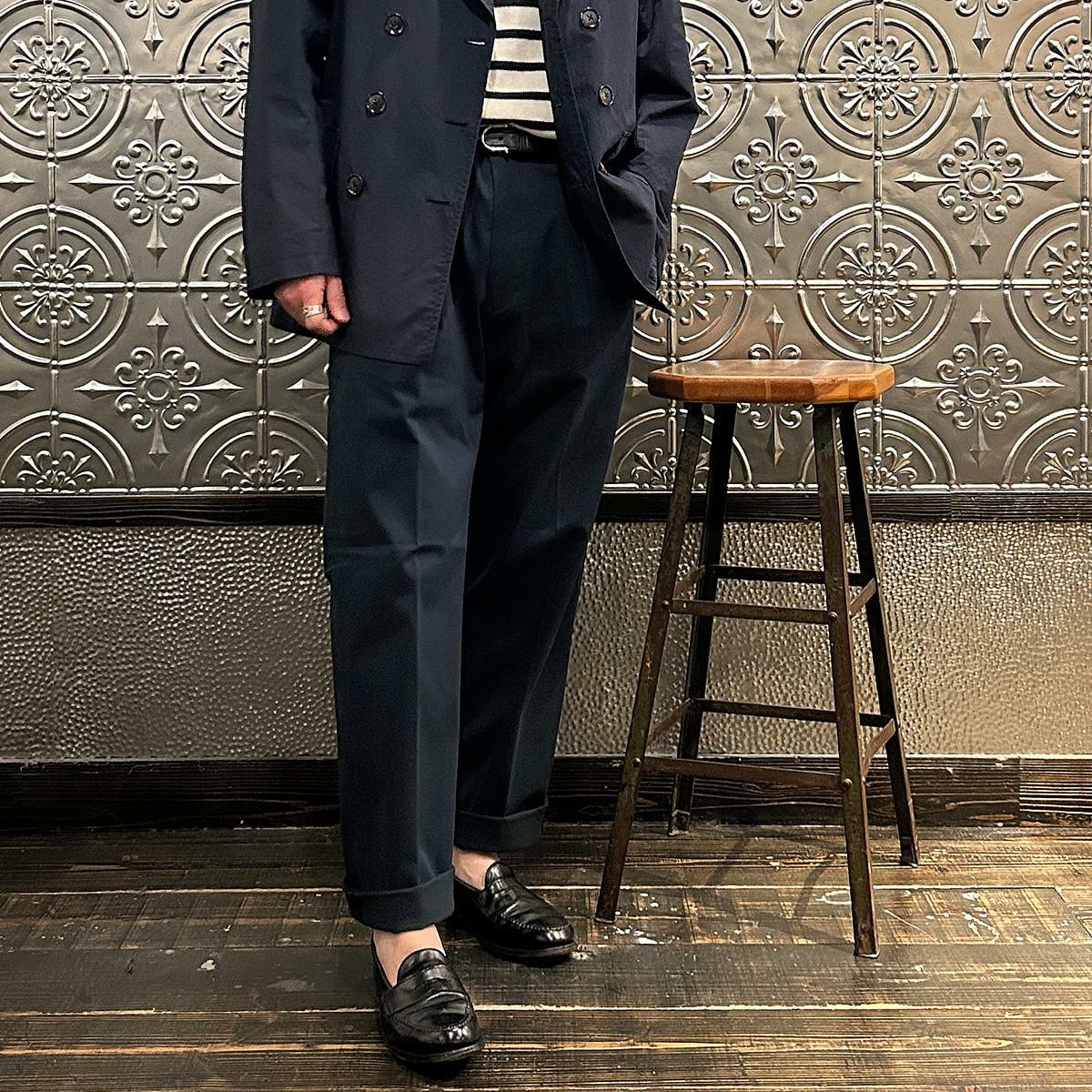 国内ブランドD.C. WHITE(ディーシーホワイト)のTHE NAVY。コットンポリウレタン素材のネイビーチノ。25年春夏のディーシーホワイトのコレクションテーマの「NAVY NAVY ネイビーネイビー」を象徴する一枚。あえてポリウレタン混の生地を使った理由は少し退色したような白っぽい風合いを出すため。雰囲気重視での生地セレクト。副産物的に生地に伸びがあり穿きやすくもあります。フロントは2インプリーツ仕様。股上も深め。少し太目のシルエット。クラシックなドレストラウザーを彷彿とするようなシルエット。合わせるモノを選ばない万能に使いやすいネイビーチノ。